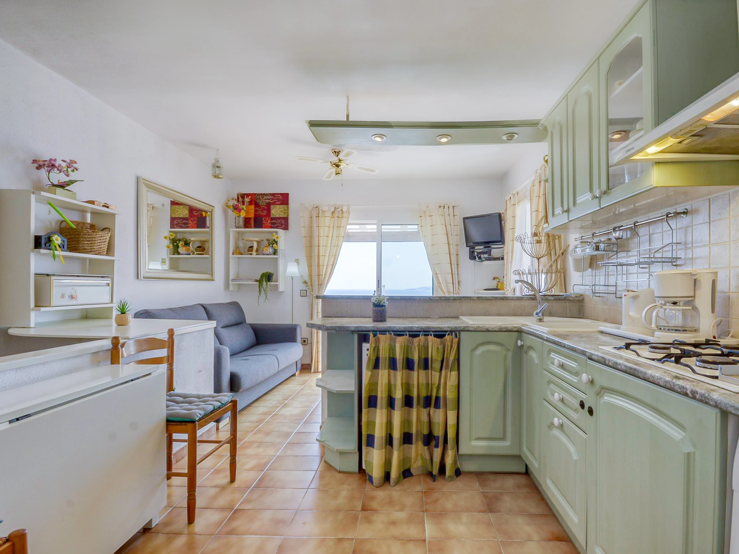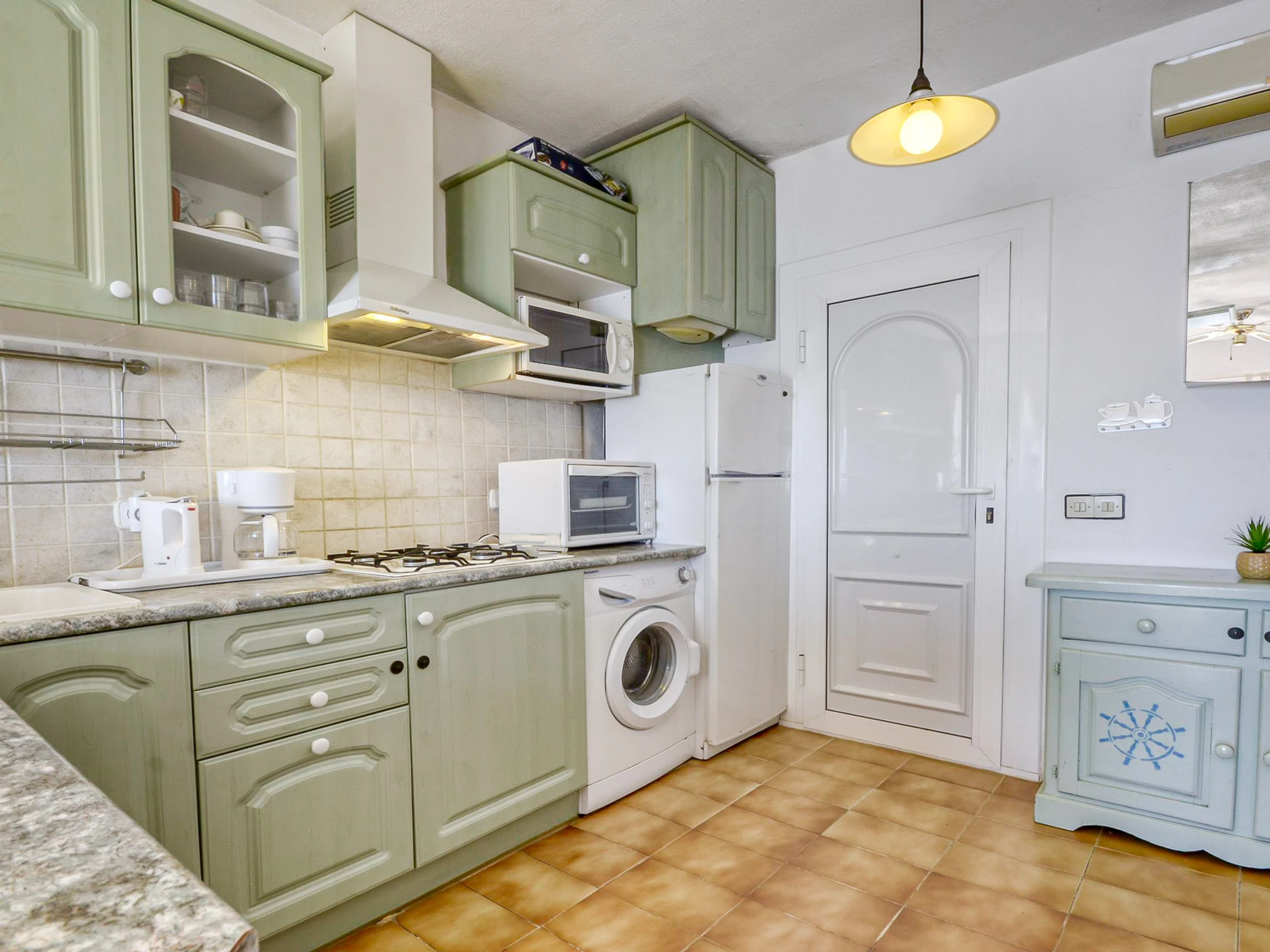 Inside the accommodation, you will find a fully equipped American kitchen. The kitchen has all the necessary appliances, such as a fridge, microwave, oven, and freezer. You will also find a washing machine, which will allow you to do laundry during your stay. Additionally, you will have crockery, cutlery, kitchen utensils, a coffee maker, and a toaster, so you can feel at home and enjoy home-cooked meals.