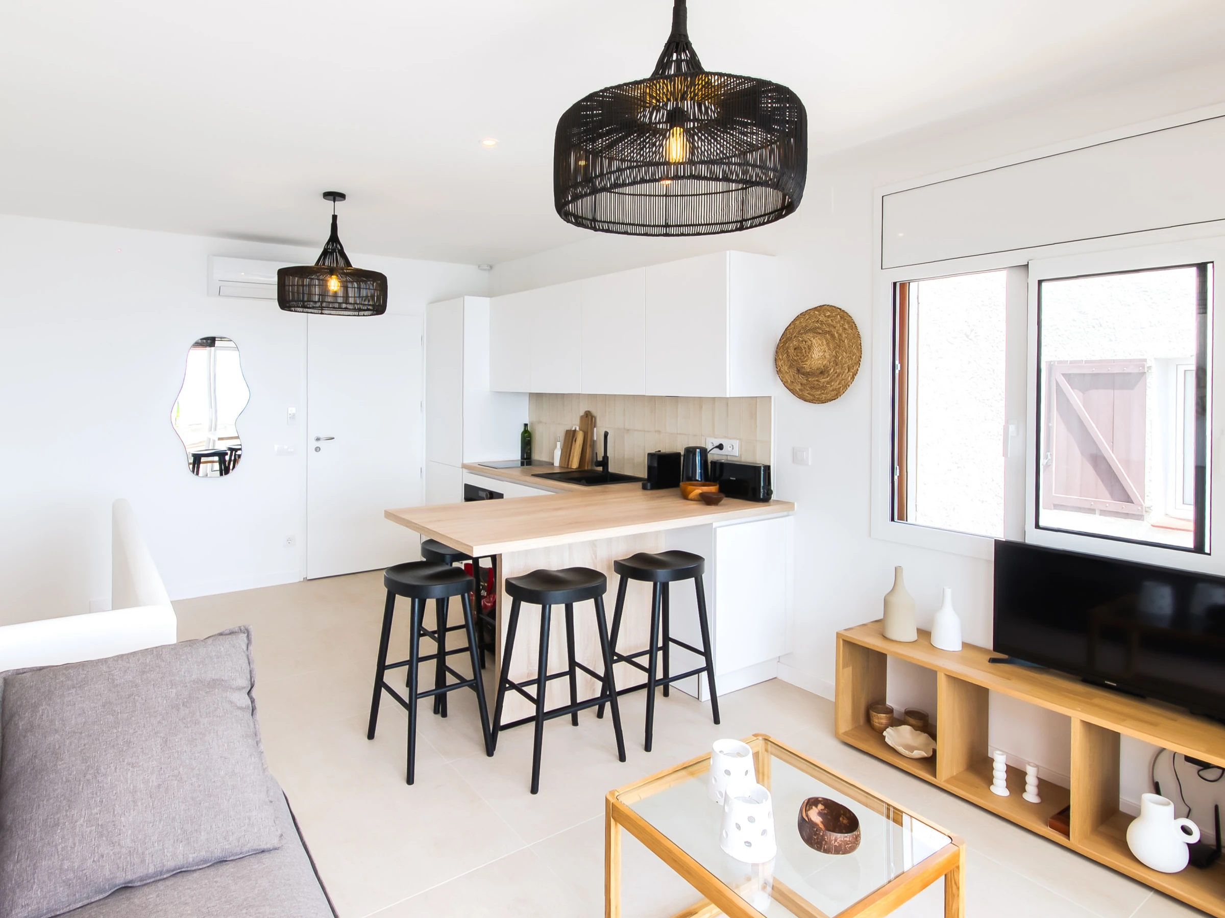 Open kitchen, fully renovated and equipped with high-end appliances. Satellite television in the living room.