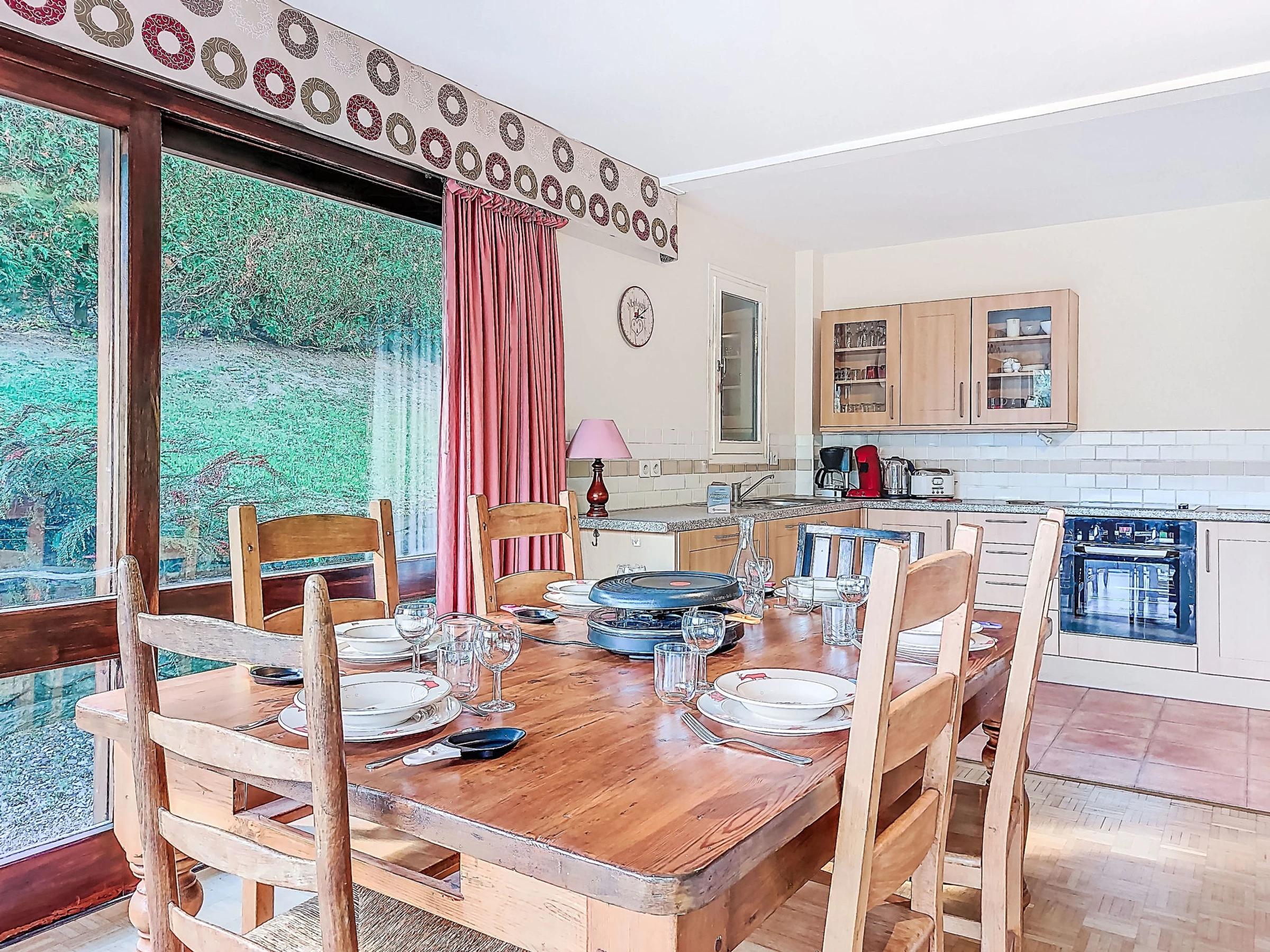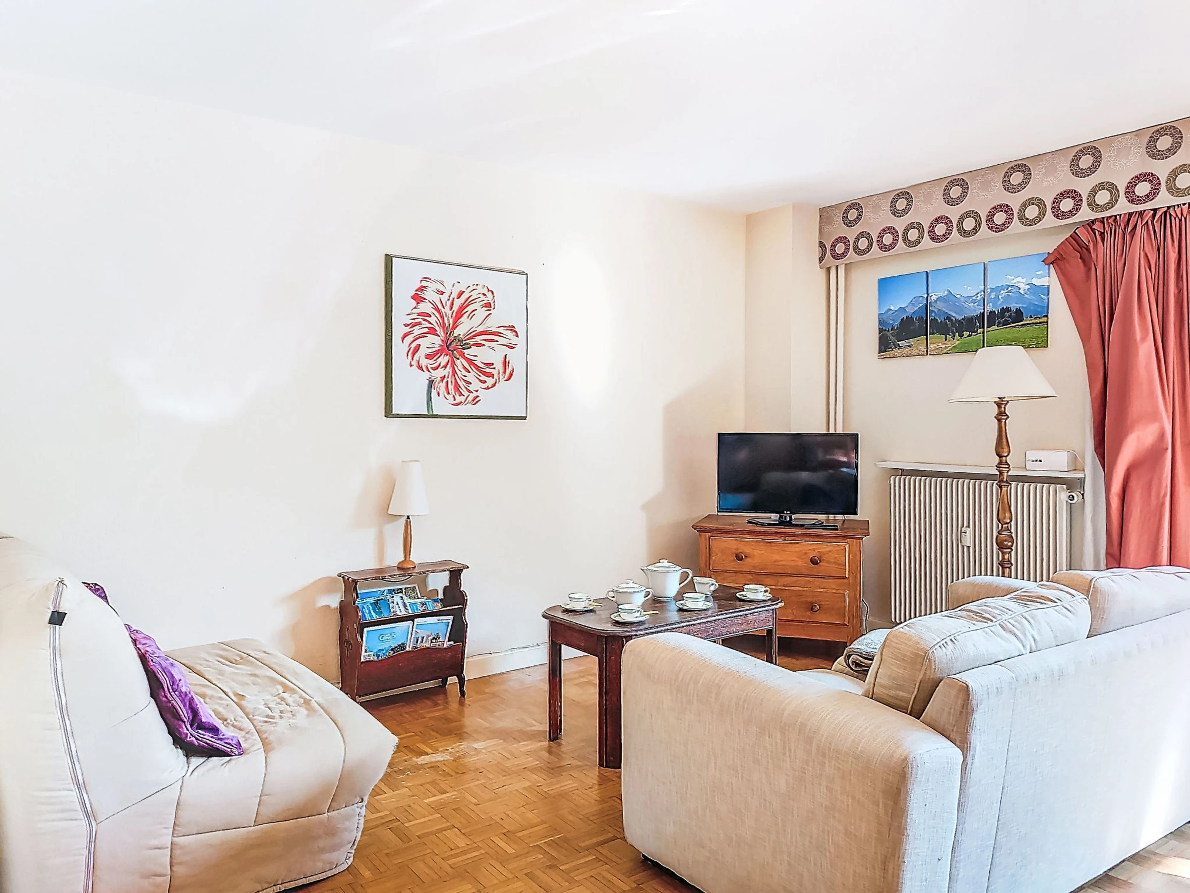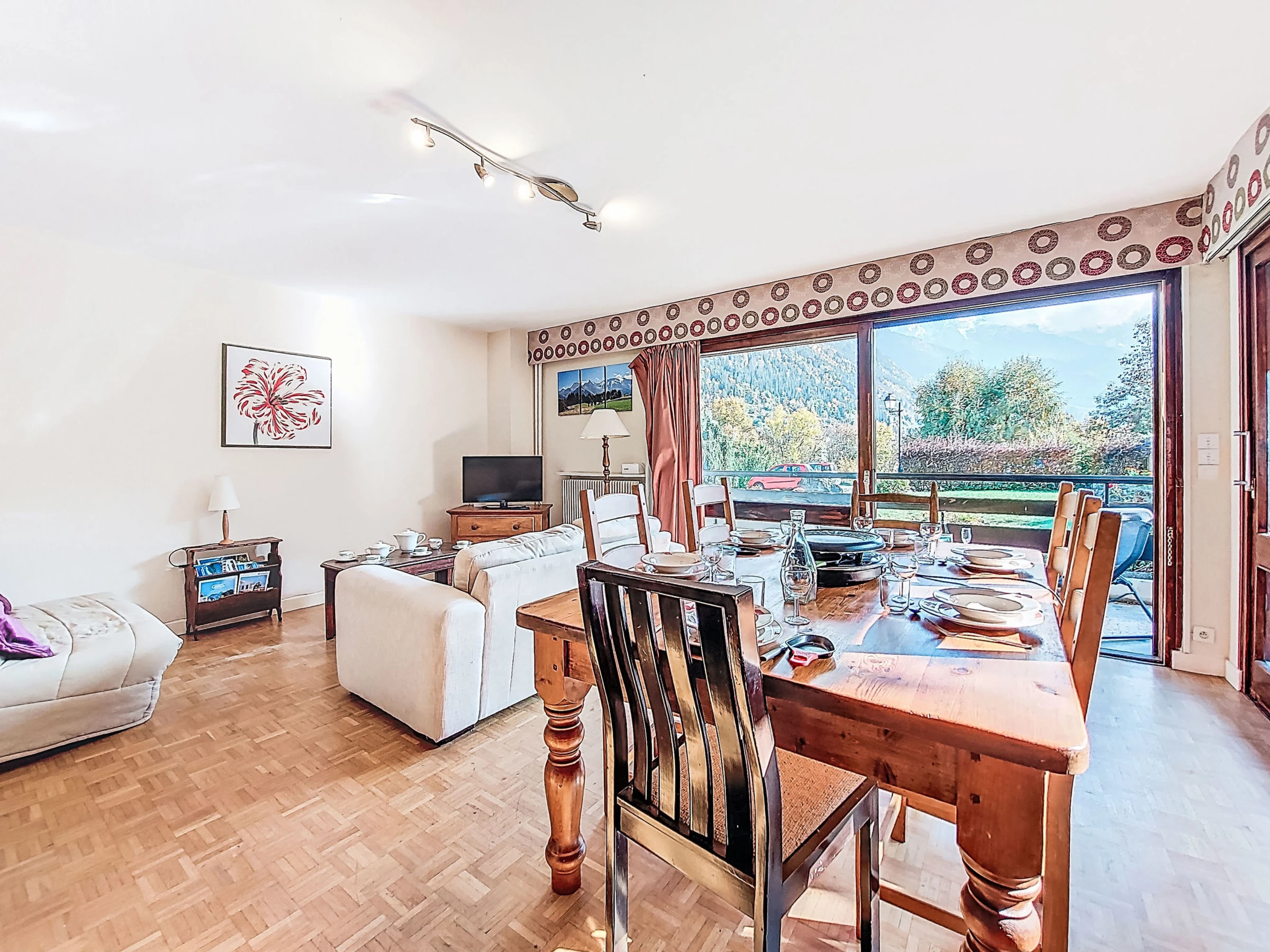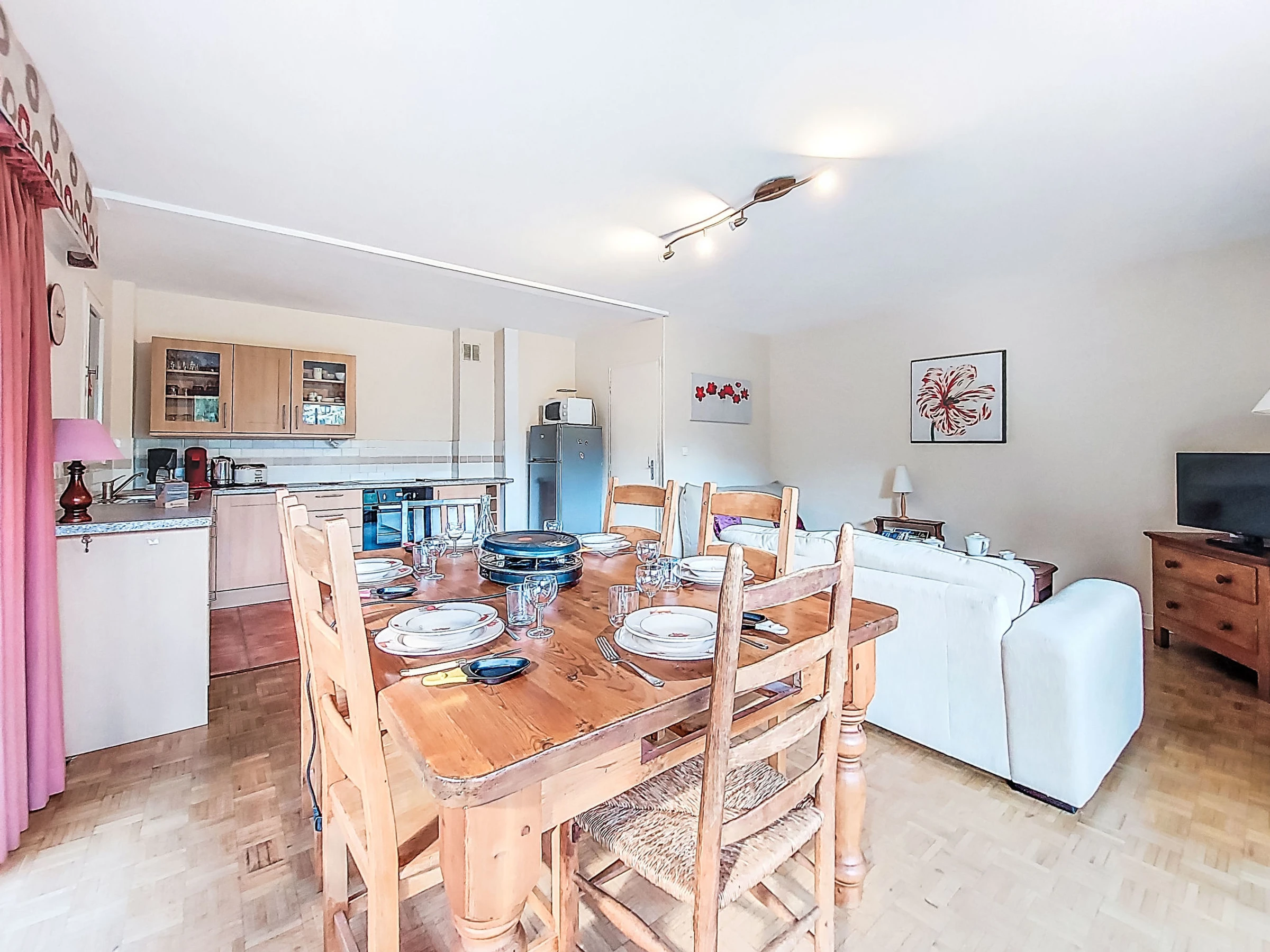 "Arbois", 3-room apartment 74 m2, on the ground floor. Living/dining room with 1 sofabed (140 cm, length 190 cm), TV (flat screen). Exit to the balcony. 1 room with 1 french bed (140 cm, length 190 cm). Exit to the balcony. 1 room with 1 french bed (140 cm, length 190 cm). Open kitchen (dishwasher, 4 ceramic glass hob hotplates, toaster, kettle, microwave, electric coffee machine, Capsules for coffee machine (Senseo) extra, raclette grill). Bathroom, sep. WC. Heating. Balcony 8 m2, south-east facing position and south facing position. Balcony furniture. Very beautiful view of the mountains. Facilities: baby cot for up to 3 year olds. Internet (WiFi, free). Parking. Please note: maximum 1 pet/ dog allowed. TV only FR. Smoke alarm. Offer by a private individual according to Art. 155, IV of CGI.