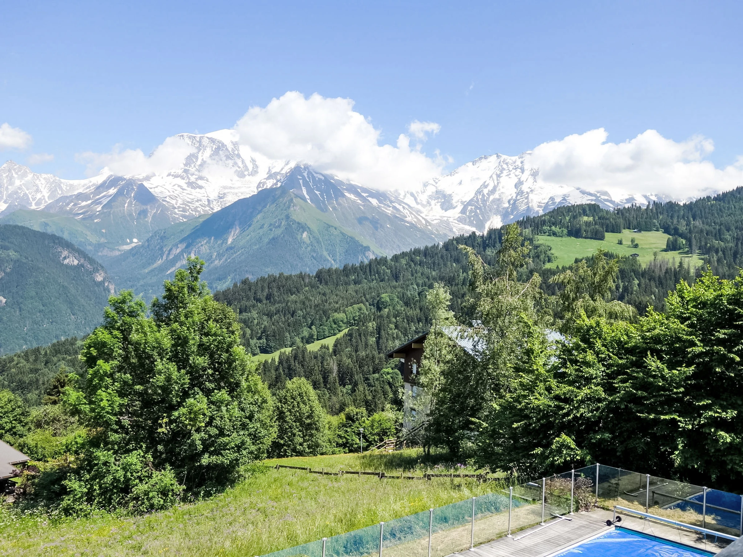 Chalet "L'Epachat", 2 storeys. Outside the resort, 12 km from the centre of St Gervais, in a quiet, sunny position, 2.2 km from the skiing area. Private: property 1'800 m2, swimming pool fenced (8 x 5 m, depth 80 - 180 cm, seasonal availability: [hidden] - [hidden] In the house: central heating system. In Winter: please take snow chains. Shop 1.5 km, restaurant 1.5 km, bus stop "Le Grattague" 160 m, thermal baths "Thermes de Saint Gervais" 12.2 km. Tennis 1.5 km, slopes 1.5 km, ski bus stop 160 m, ski school 1.5 km, cross country ski track 1.5 km, ice rink 8.9 km. Well-known ski regions can easily be reached: Evasion Mont Blanc. Please note: car recommended. Ski bus (free of charge).