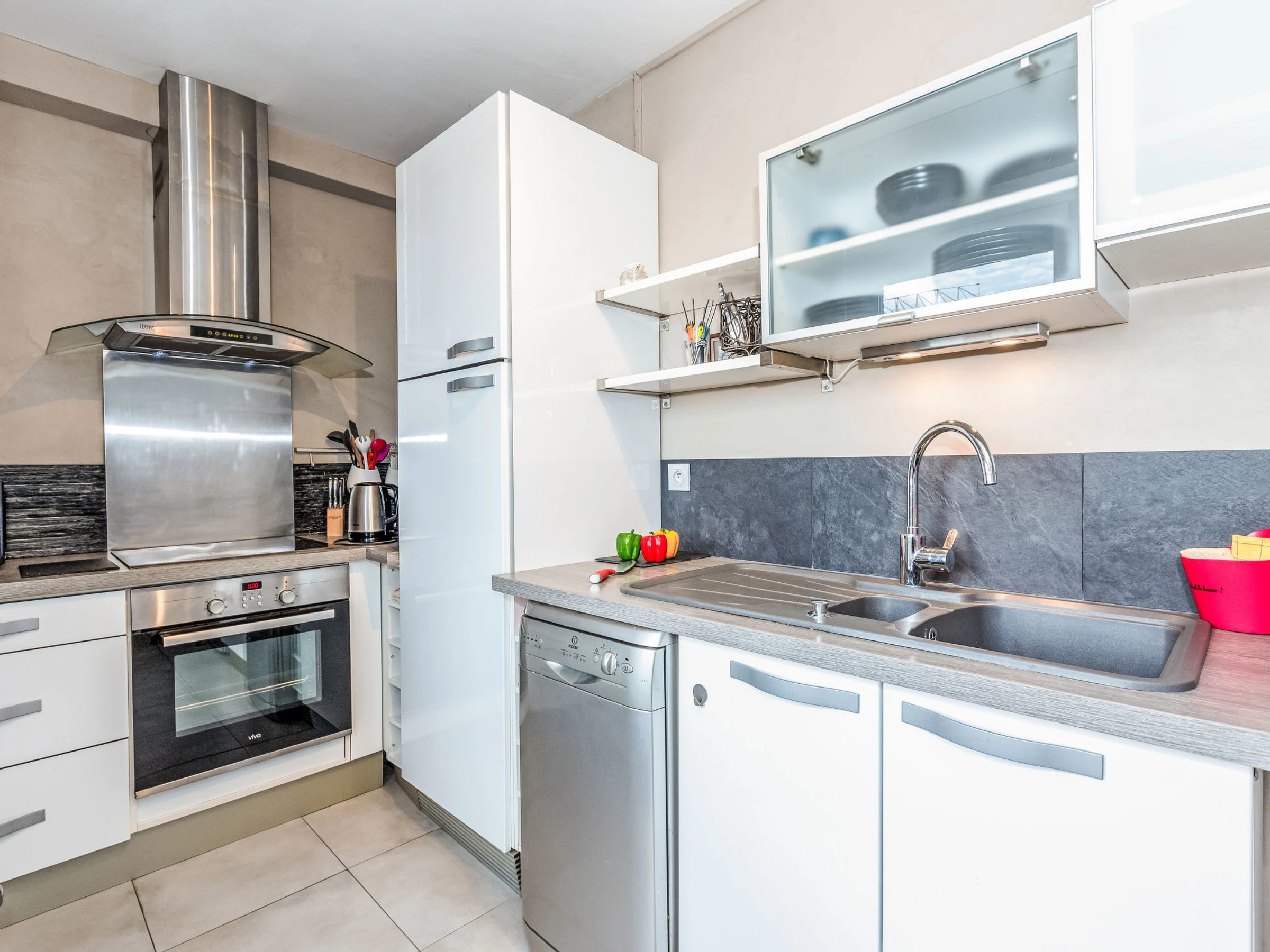 3-room apartment 63 m2 on 4th floor. Spacious and bright, comfortable and tasteful furnishings: large living/dining room with TV (flat screen). Exit to the terrace. 1 room with 2 beds (90 cm, length 190 cm). 1 room with 1 french bed (1 x 140 cm, length 190 cm), TV (flat screen). Exit to the terrace. Kitchen (oven, dishwasher, 4 ceramic glass hob hotplates, toaster, microwave, freezer, electric coffee machine). Shower, sep. WC, double hand-basin. Electric heating. Heating available only from 15.10. to 15.04. Small balcony, east facing position, large terrace 12 m2, west facing position. Balcony furniture. Side view of the sea. Facilities: washing machine, children's high chair, baby cot, hair dryer. Internet (WiFi, free). Parking space n 28 (roofed, fenced 1 car). Please note: smoke alarm. Offer by a private individual according to Art. 155, IV of CGI. [hidden]