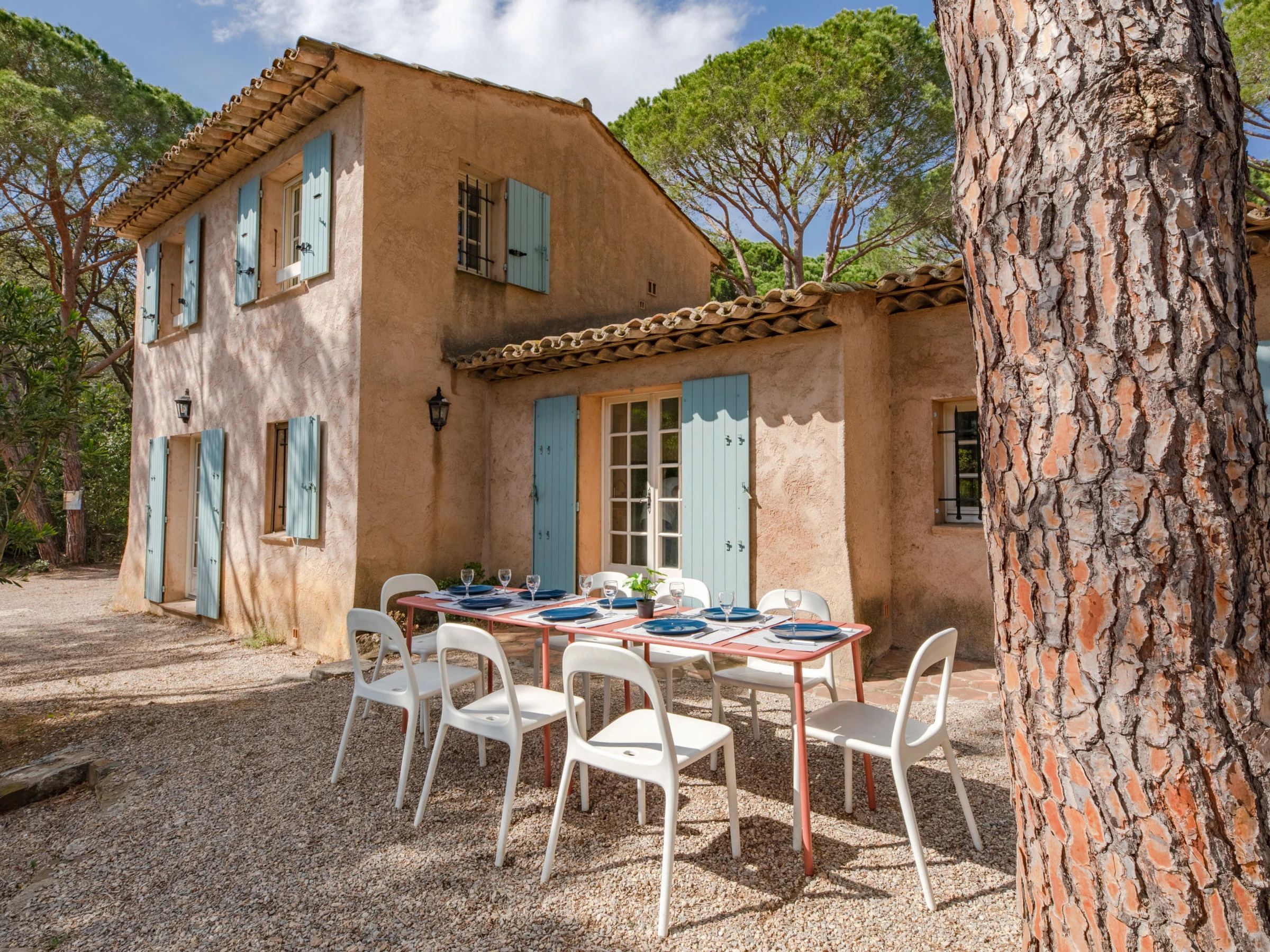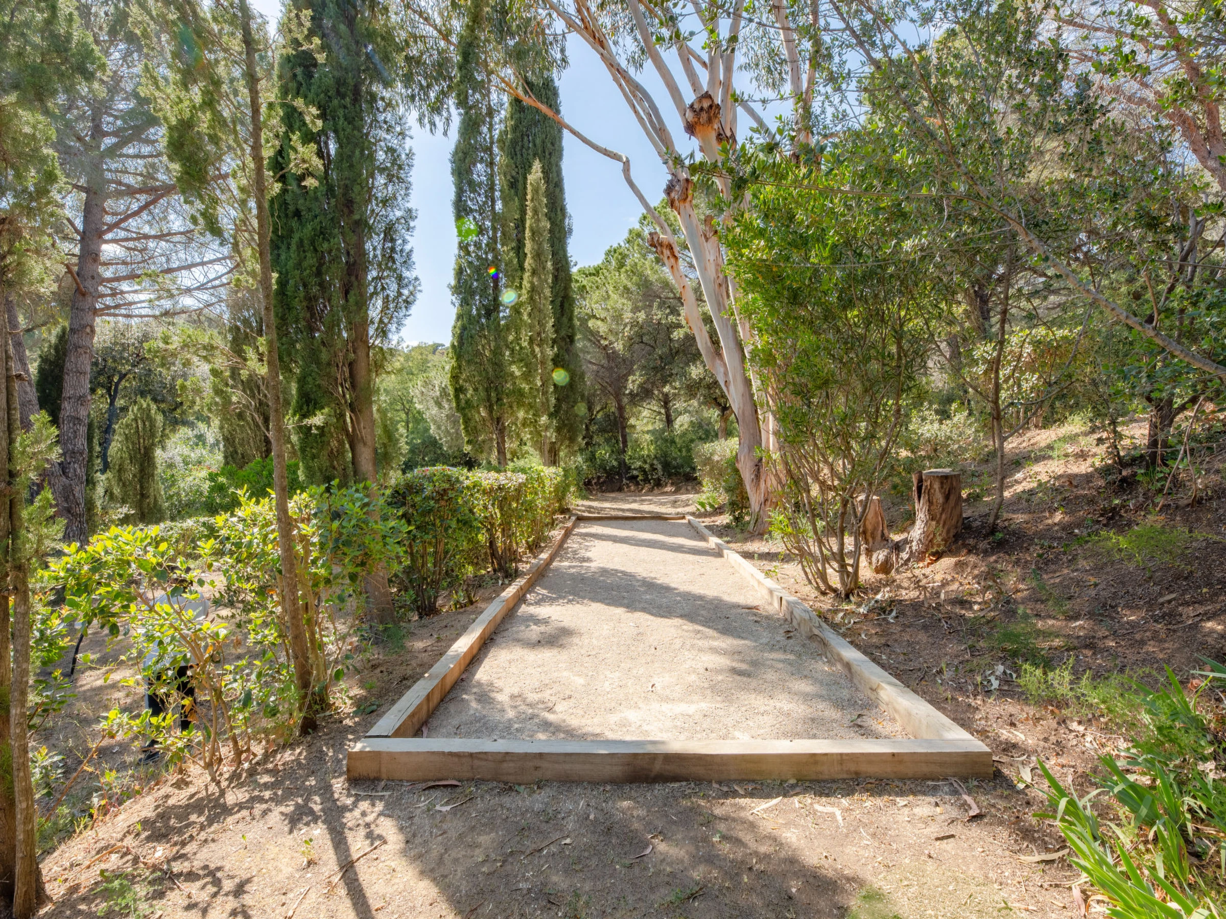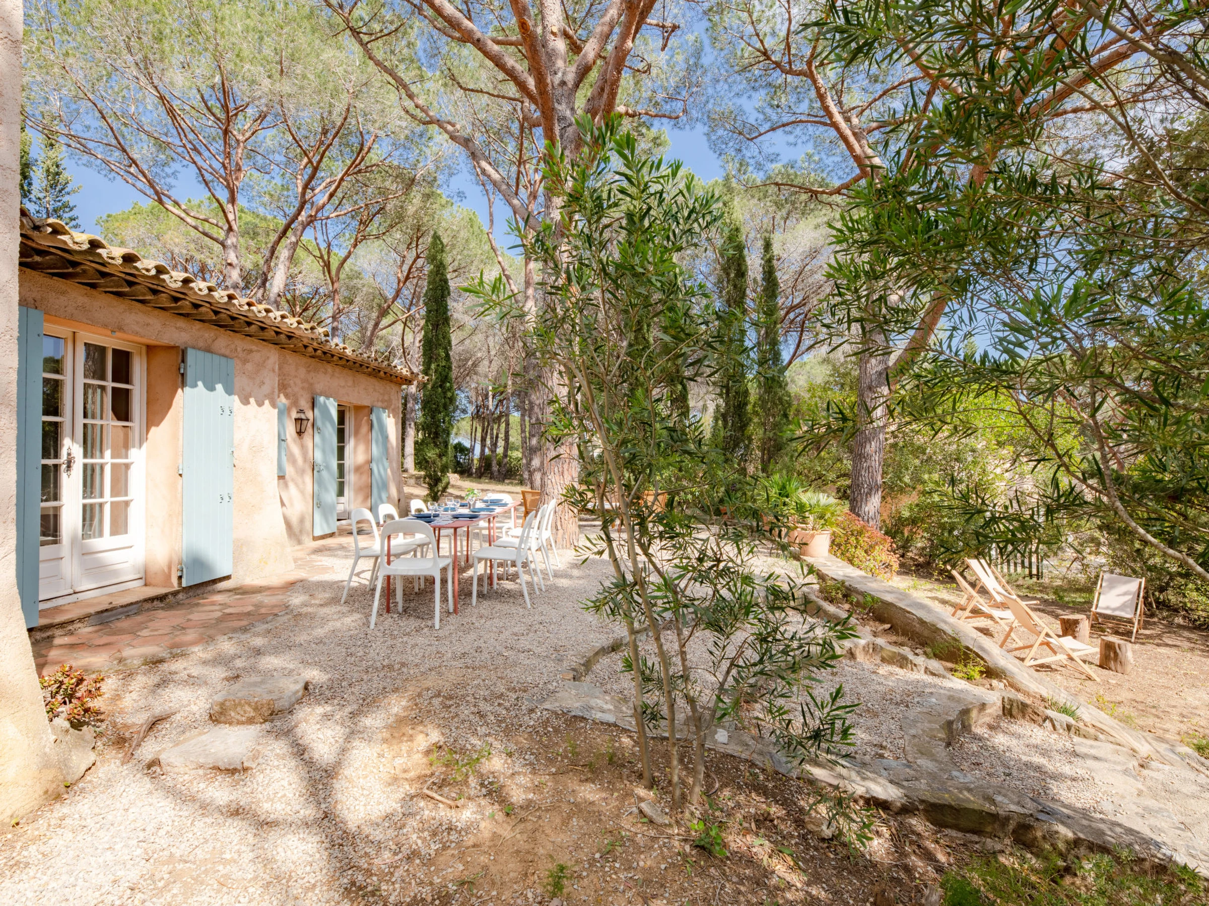 Beautiful single-family house "Les Agasses", surrounded by trees. In the district of de la Vierge Noire, in the resort 3 km from the centre of Sainte-Maxime, in a quiet, sunny position, 900 m from the sea, 900 m from the beach, south-east facing position. Private: natural state property 2'400 m2, terraced garden (not fenced) flowers and trees. Boules, volleyball court, garden furniture, barbecue. Narrow motor access (100 m via unmade road). Parking. Shop 4 km, grocery 1.5 km, supermarket 3 km, shopping centre 4 km, restaurant 900 m, bakery 3 km, bus stop 850 m, railway station "Saint Raphael", sandy beach "La Nartelle" 900 m, thermal baths "Thalasso Les Issambres" 7 km. Sports harbour 3 km, golf course (18 hole) 4 km, tennis 850 m. Nearby attractions: Aqualand waterpark 7 km, Azur Park attractions 16 km, Saint-Tropez/Ramatuelle 18 km, Port Grimaud 13 km, Gorges du Verdon 95 km, Navette / shuttle boat St-Tropez 15min 3 km. Hiking paths: Massif des Maures 5 km, Massif de l'Esterel 38 km. Please note: car recommended. The keys‘ handover takes place by the agency in Sainte-Maxime. Airfield 70 km from the property.