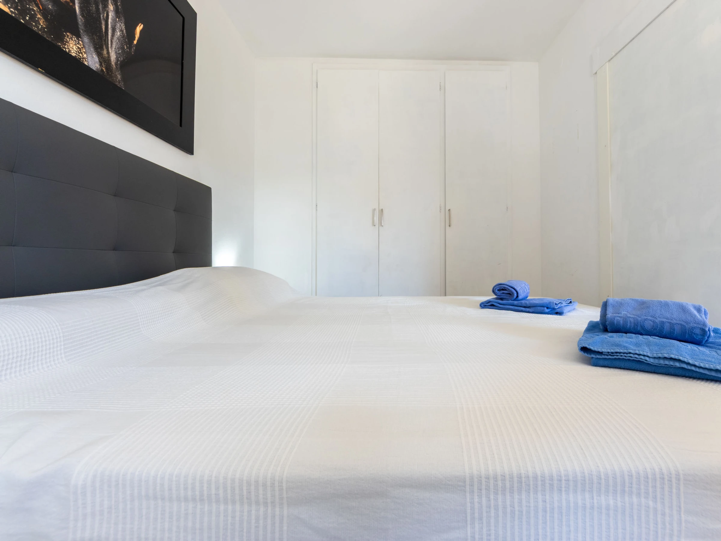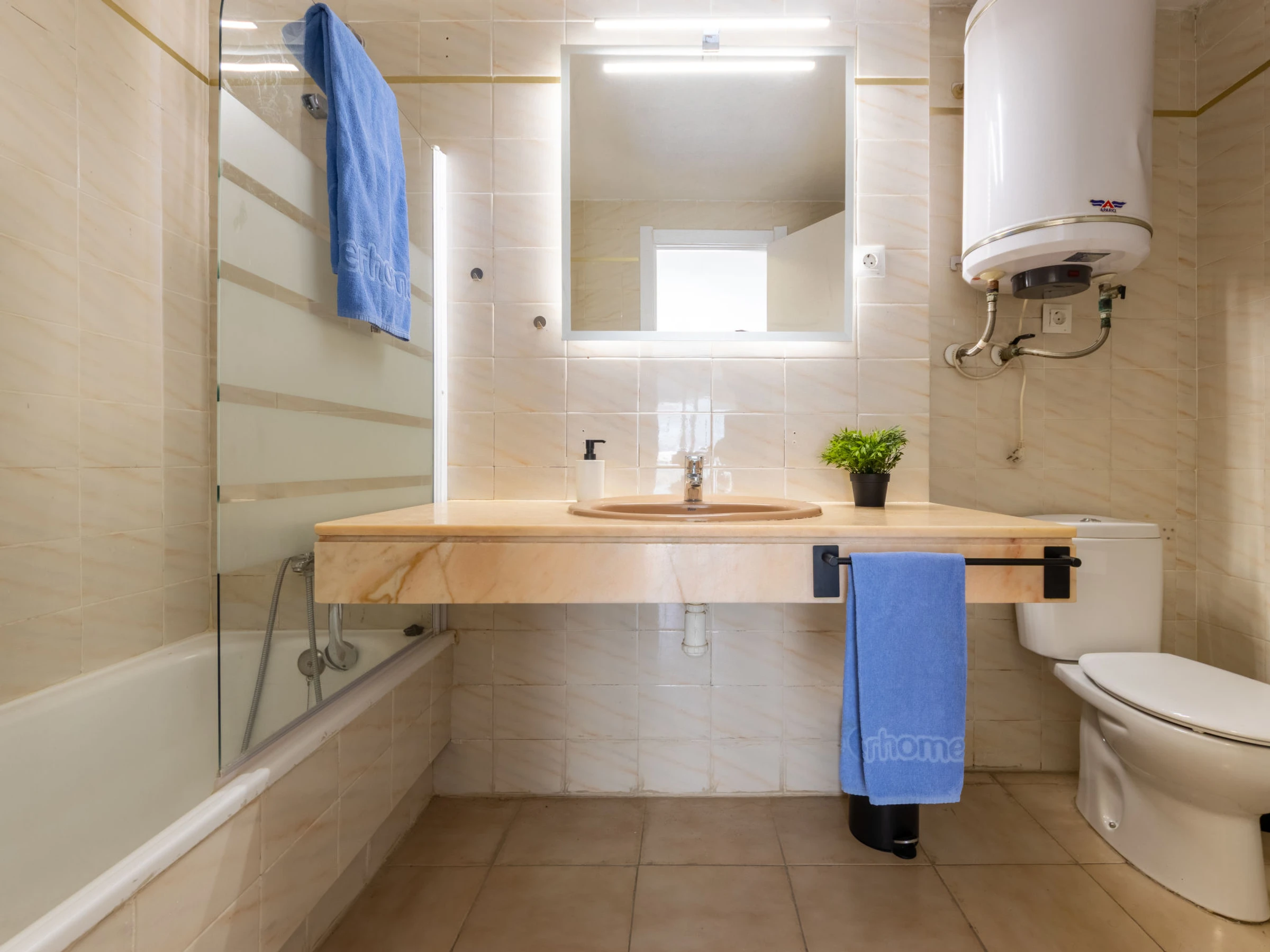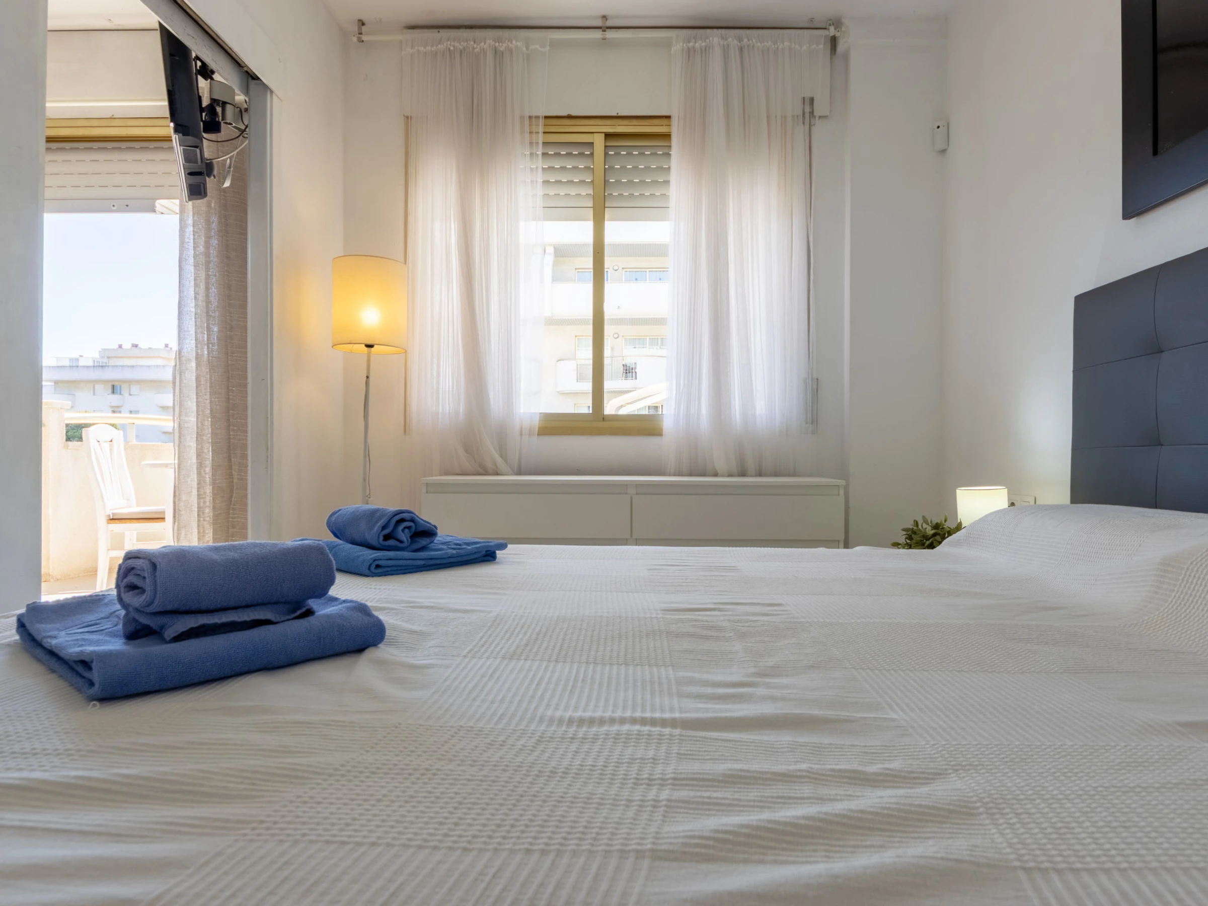 "Arquus II", 2-room apartment 30 m2 on 4th floor. Simple and practical furnishings: living/dining room with 1 double sofabed (1 x 135 cm, length 190 cm), digital TV, flat screen, air conditioning and forced-air heating. Exit to the balcony. 1 room with 1 french bed (150 cm, length 200 cm). Exit to the terrace. Open kitchen (3 ceramic glass hob hotplates, toaster, kettle, microwave, electric coffee machine) with boiler (50 litres). Bath/WC. Heating not available in all rooms. Terrace furniture. View of the resort. Facilities: washing machine, iron, hair dryer. Internet (WiFi, free). Please note: non-smokers only. TV only ES. [hidden] // Reg. Nr.: ESFCTU00004302400035776100000000000000000[hidden]1