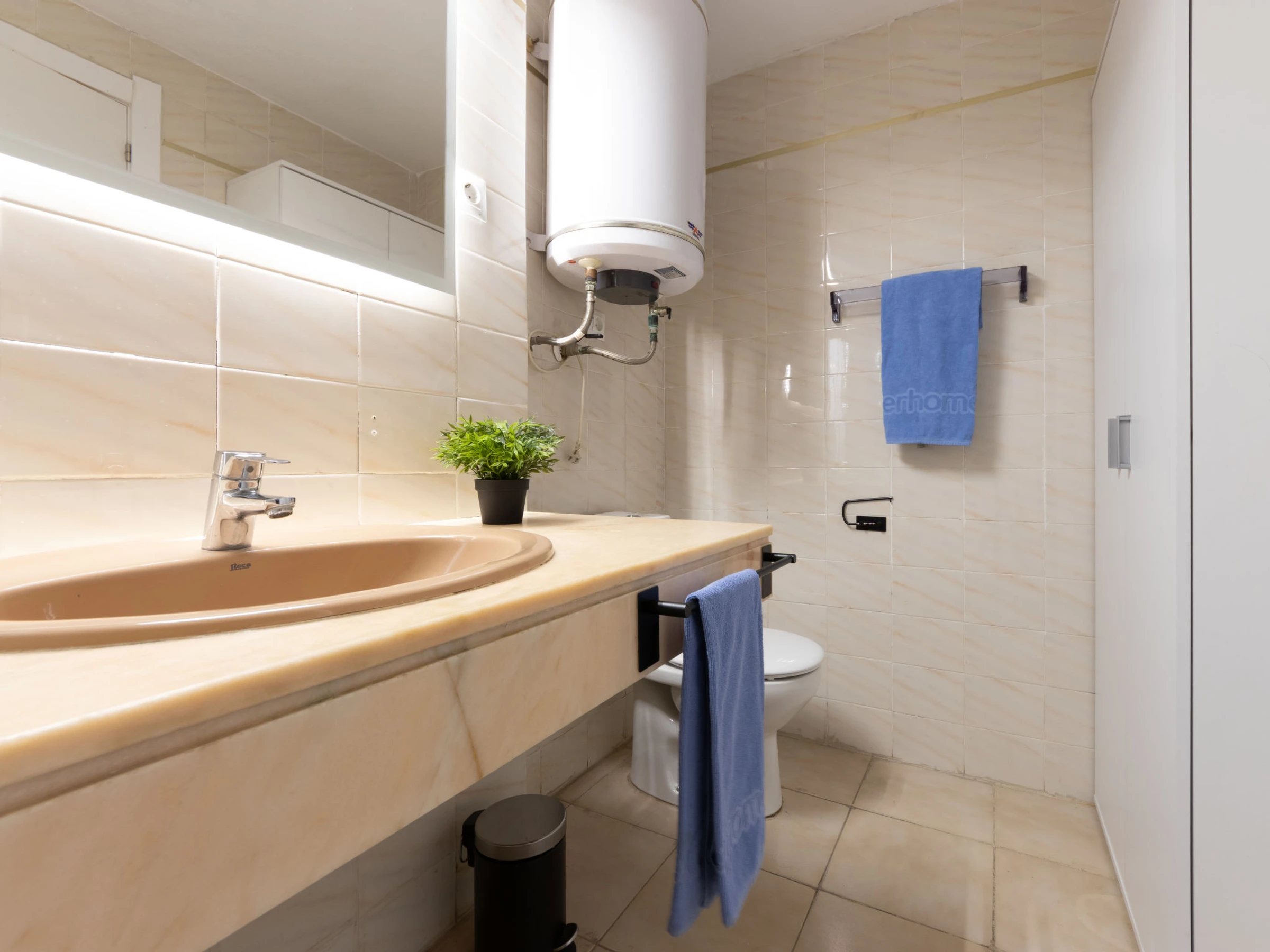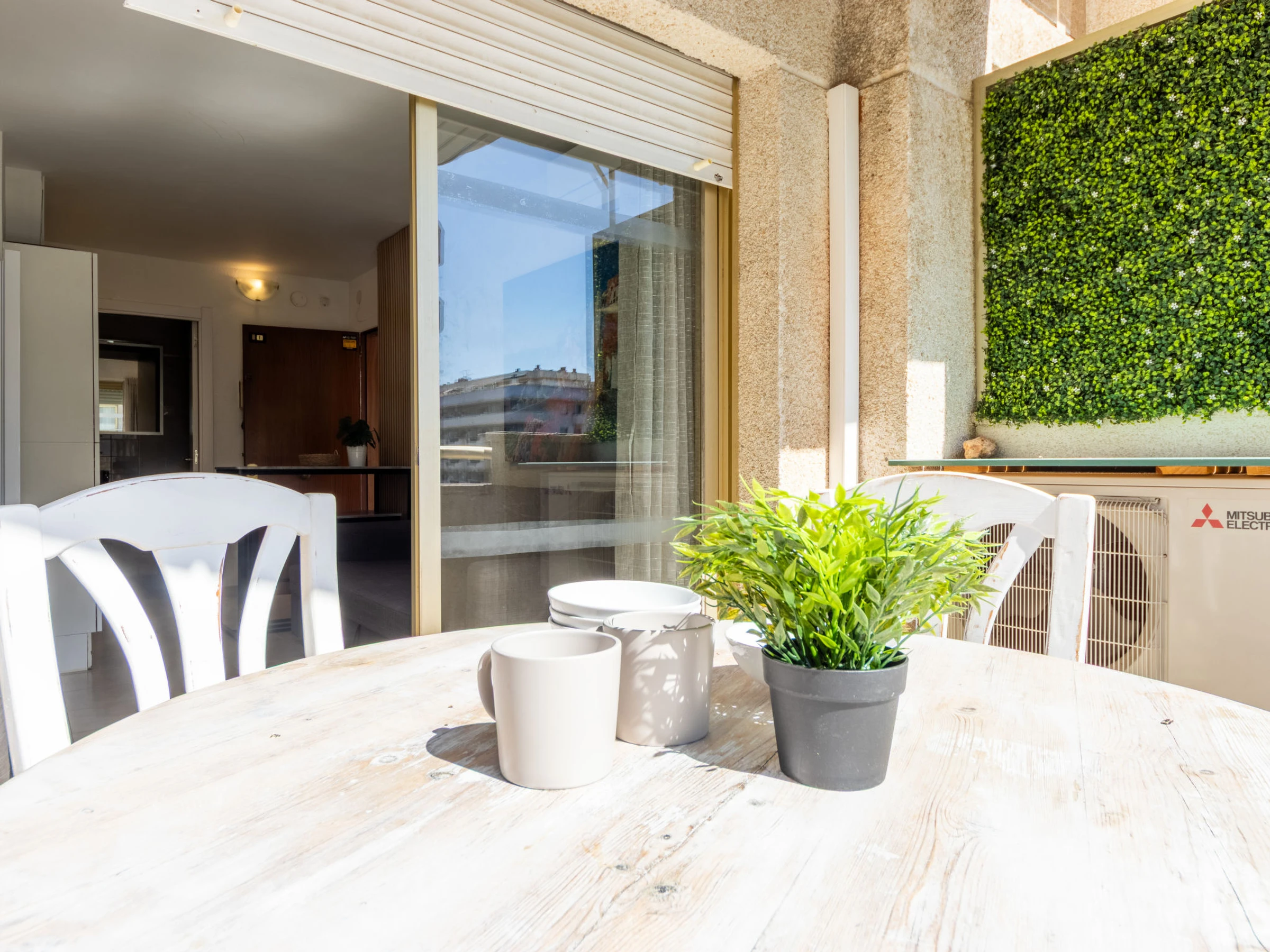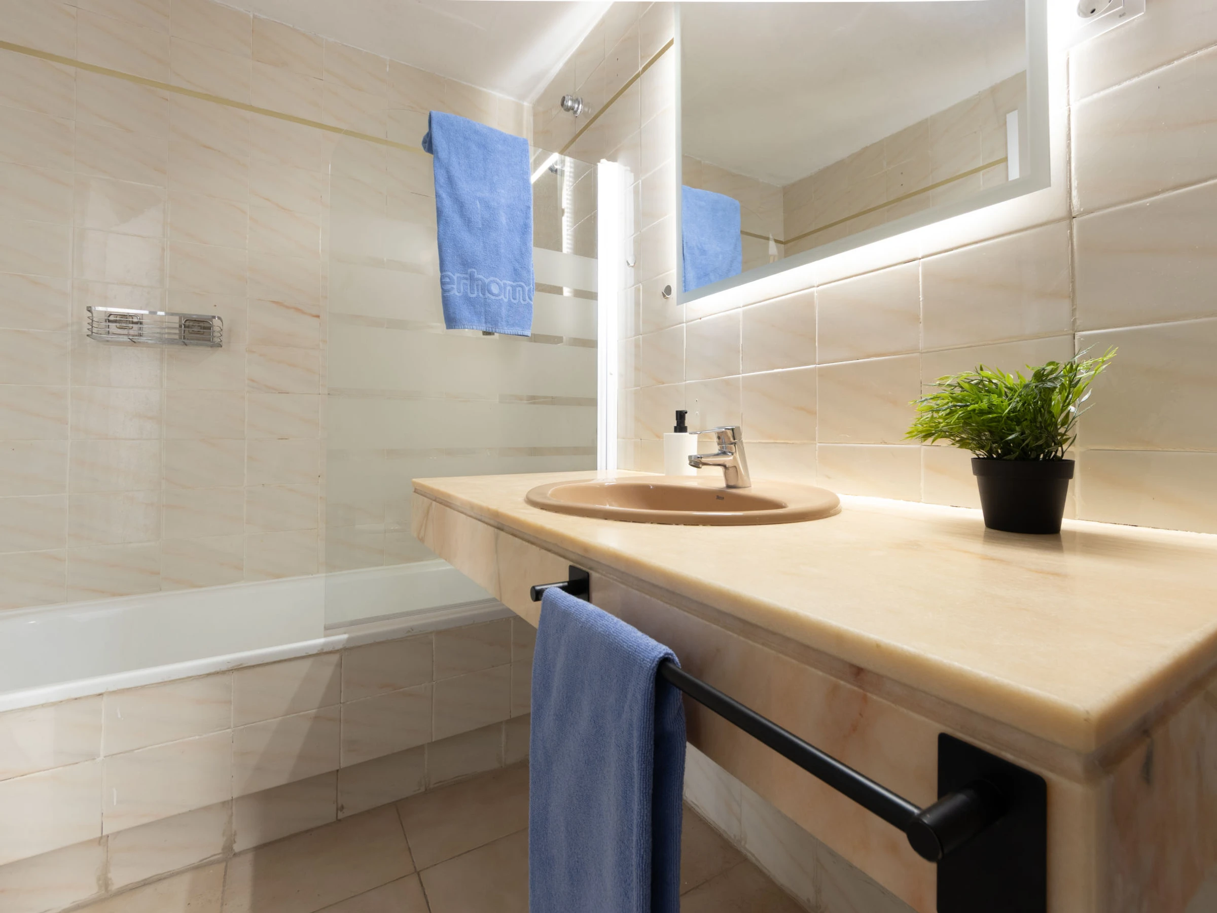 "Arquus II", 2-room apartment 30 m2 on 4th floor. Simple and practical furnishings: living/dining room with 1 double sofabed (1 x 135 cm, length 190 cm), digital TV, flat screen, air conditioning and forced-air heating. Exit to the balcony. 1 room with 1 french bed (150 cm, length 200 cm). Exit to the terrace. Open kitchen (3 ceramic glass hob hotplates, toaster, kettle, microwave, electric coffee machine) with boiler (50 litres). Bath/WC. Heating not available in all rooms. Terrace furniture. View of the resort. Facilities: washing machine, iron, hair dryer. Internet (WiFi, free). Please note: non-smokers only. TV only ES. [hidden] // Reg. Nr.: ESFCTU00004302400035776100000000000000000[hidden]1