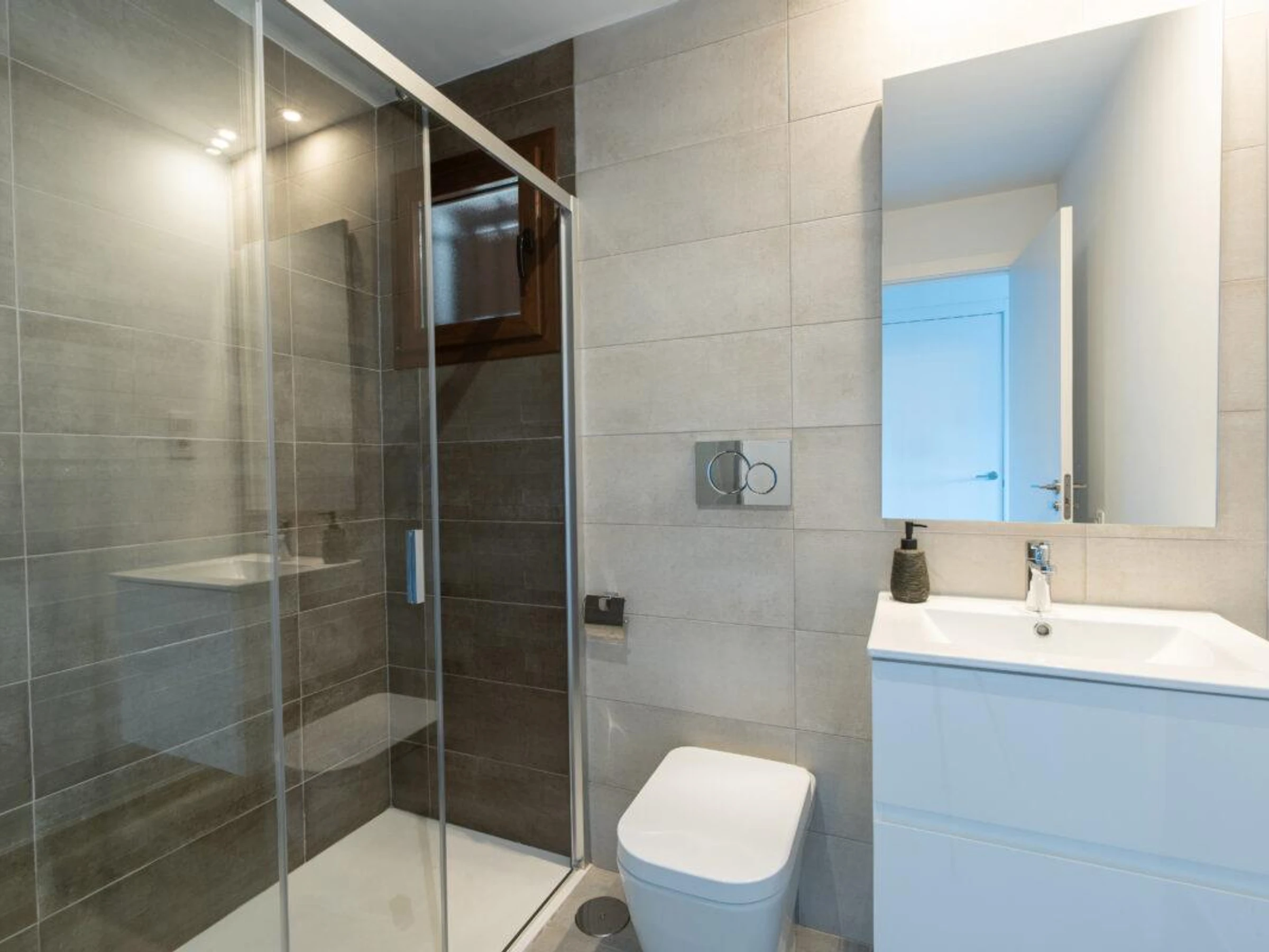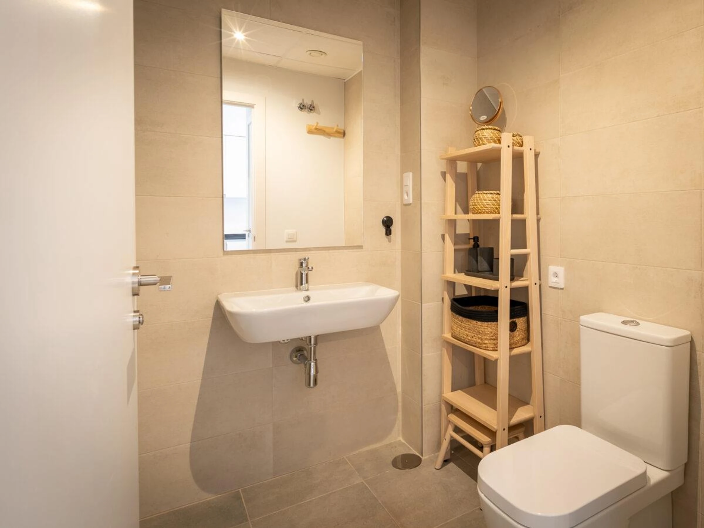 * bathroom with single washbasin, shower and toilet Exterior of the apartment