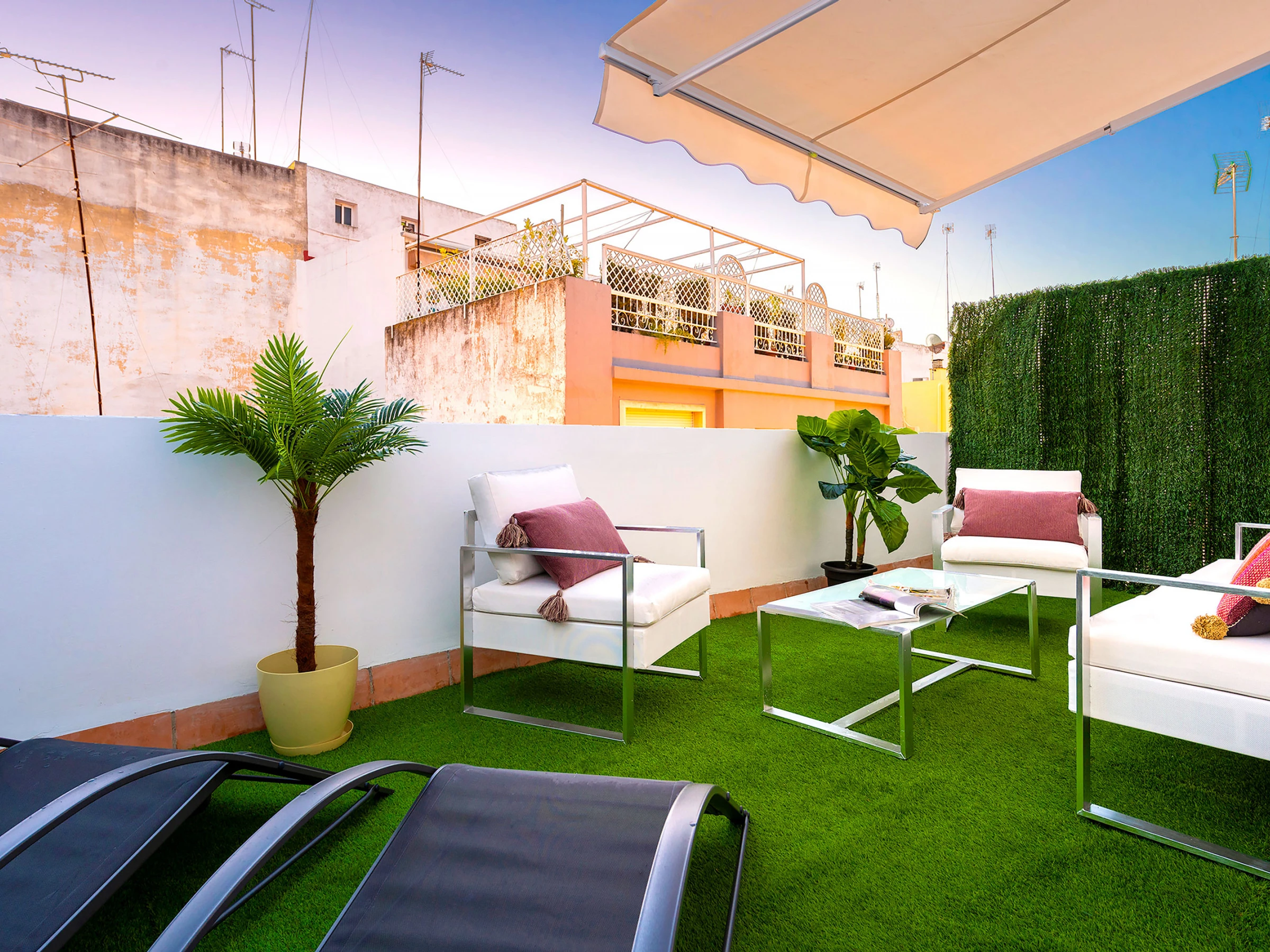 Upon entering the apartment you’d find one of the bedrooms on the right, with two single beds, exterior and bright. It disposes of a complete bathroom en suite. On the left we have a small patio with grass, table and chairs. It’s the perfect place to enjoy breakfast or have a glass of wine.