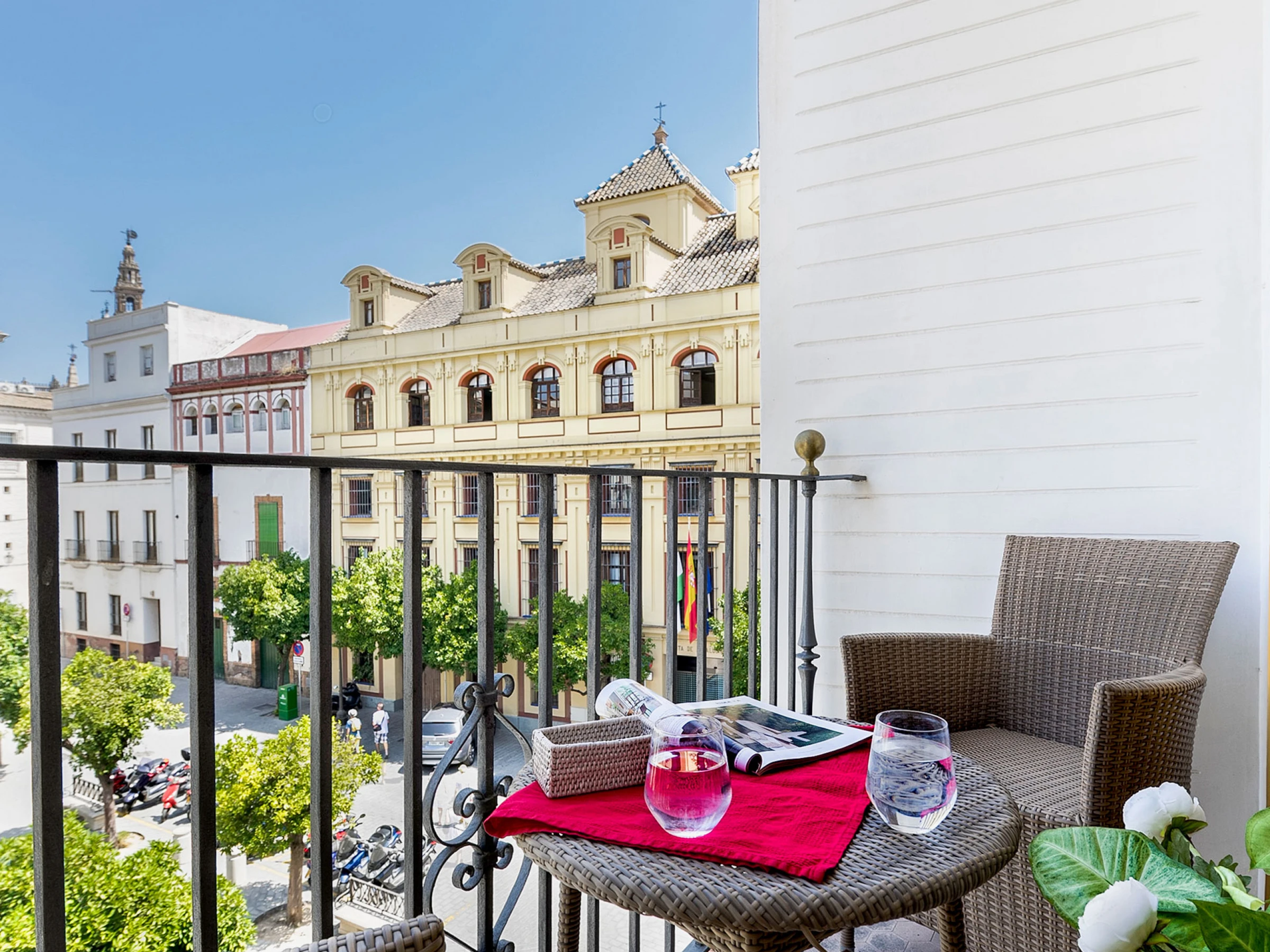 The living room is bright and elegant, with two exterior balconies that can be enjoyed as small terraces—ideal for reading, dining, or enjoying a glass of wine with views of the historic Plaza de la Contratación. The kitchen is separate, spacious, modern, and fully equipped, with ventilation opening into the living room.