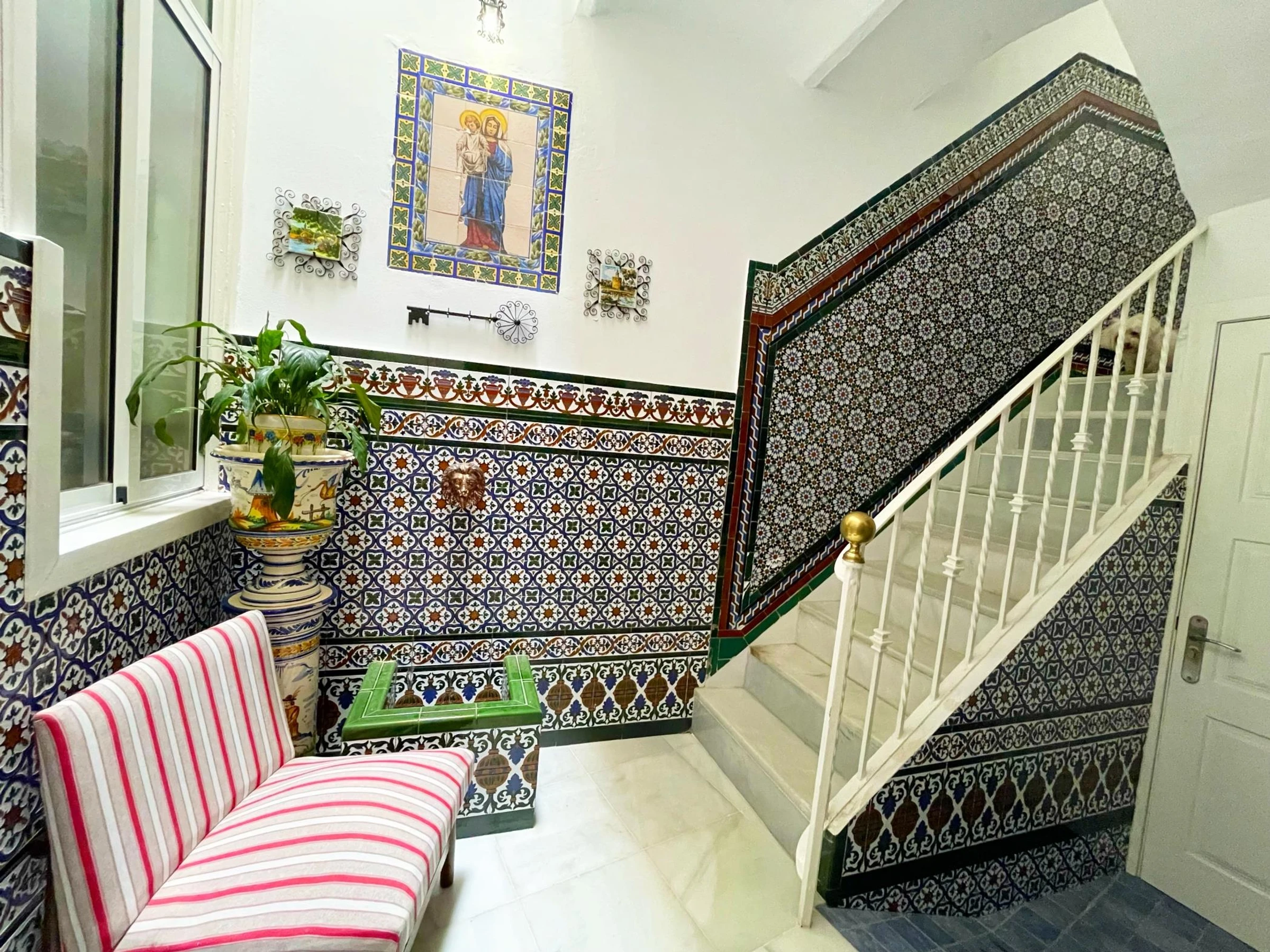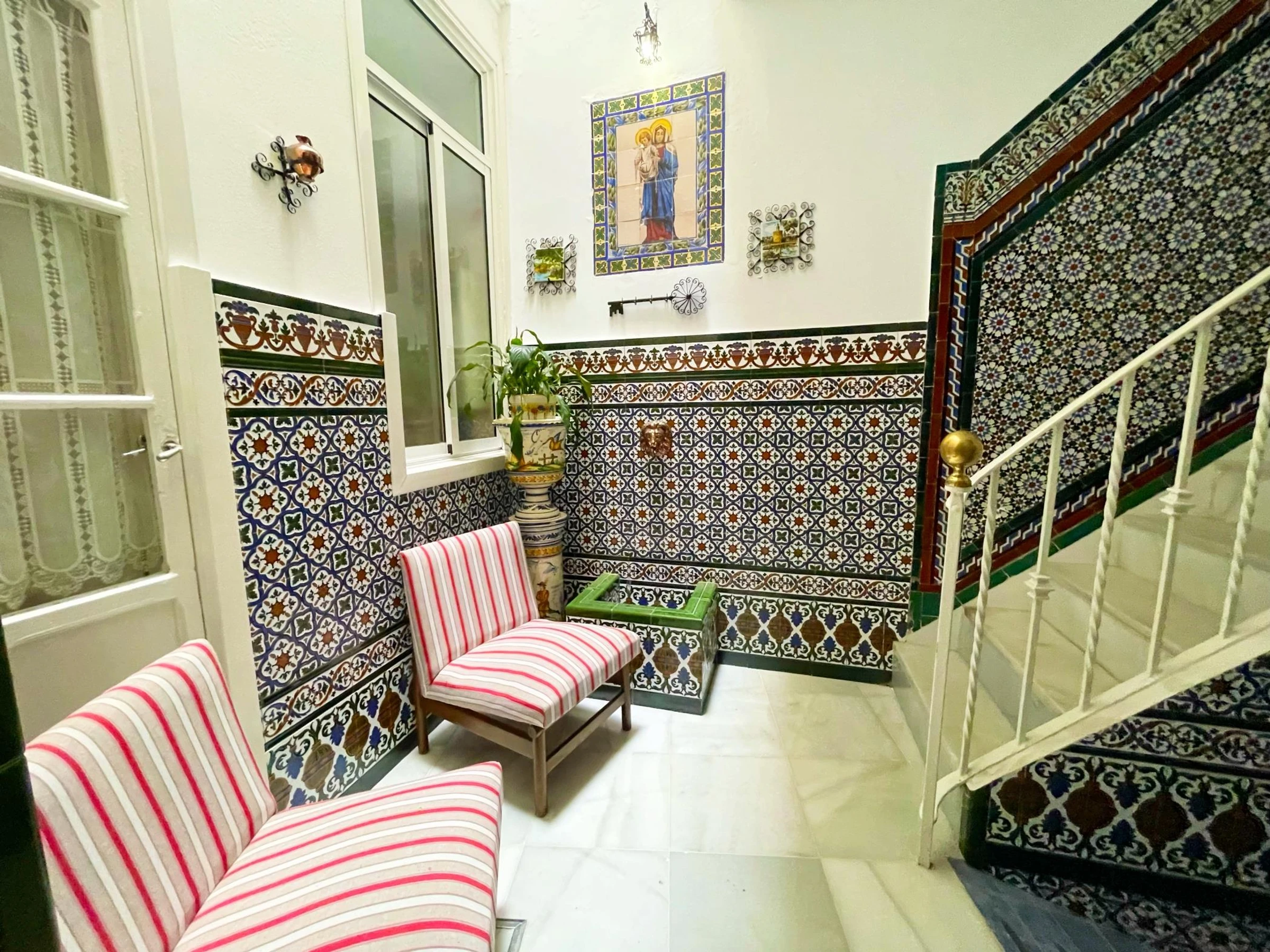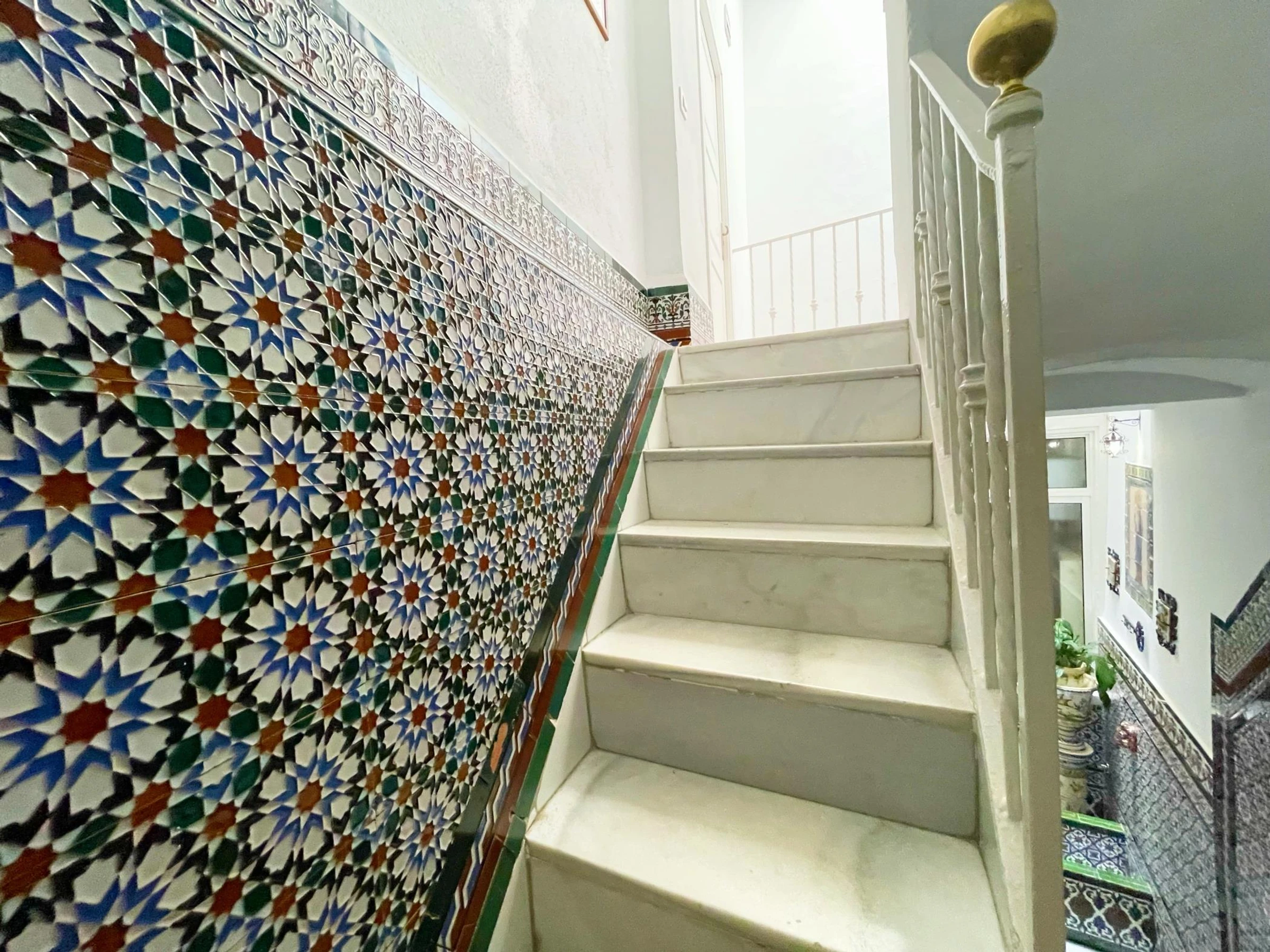 First floor: small communal courtyard at the entrance. Old staircase with walls tiled with old ceramic tiles from Seville.