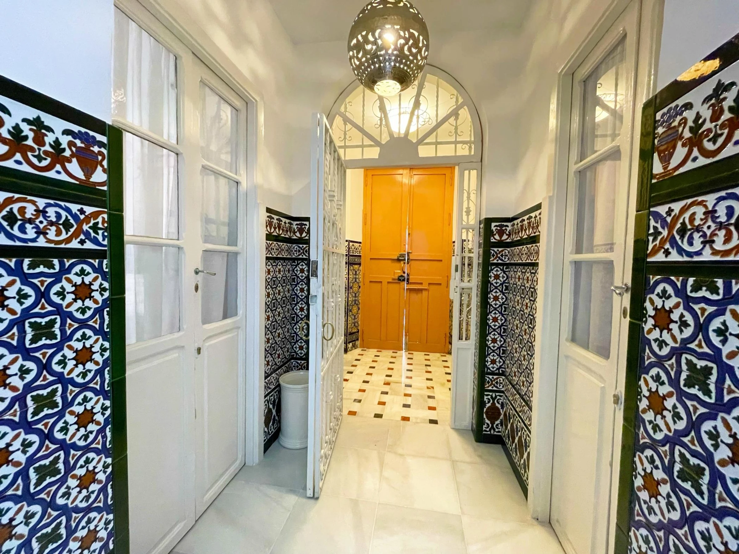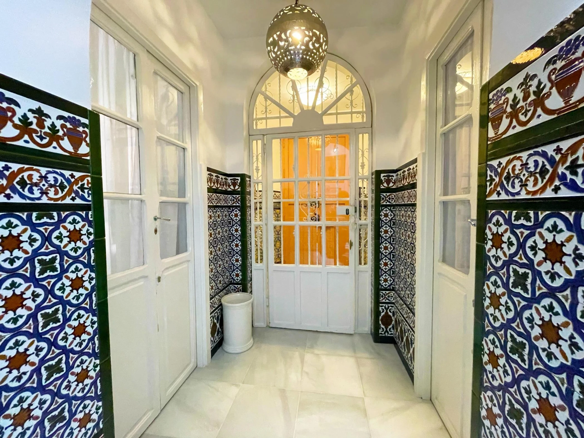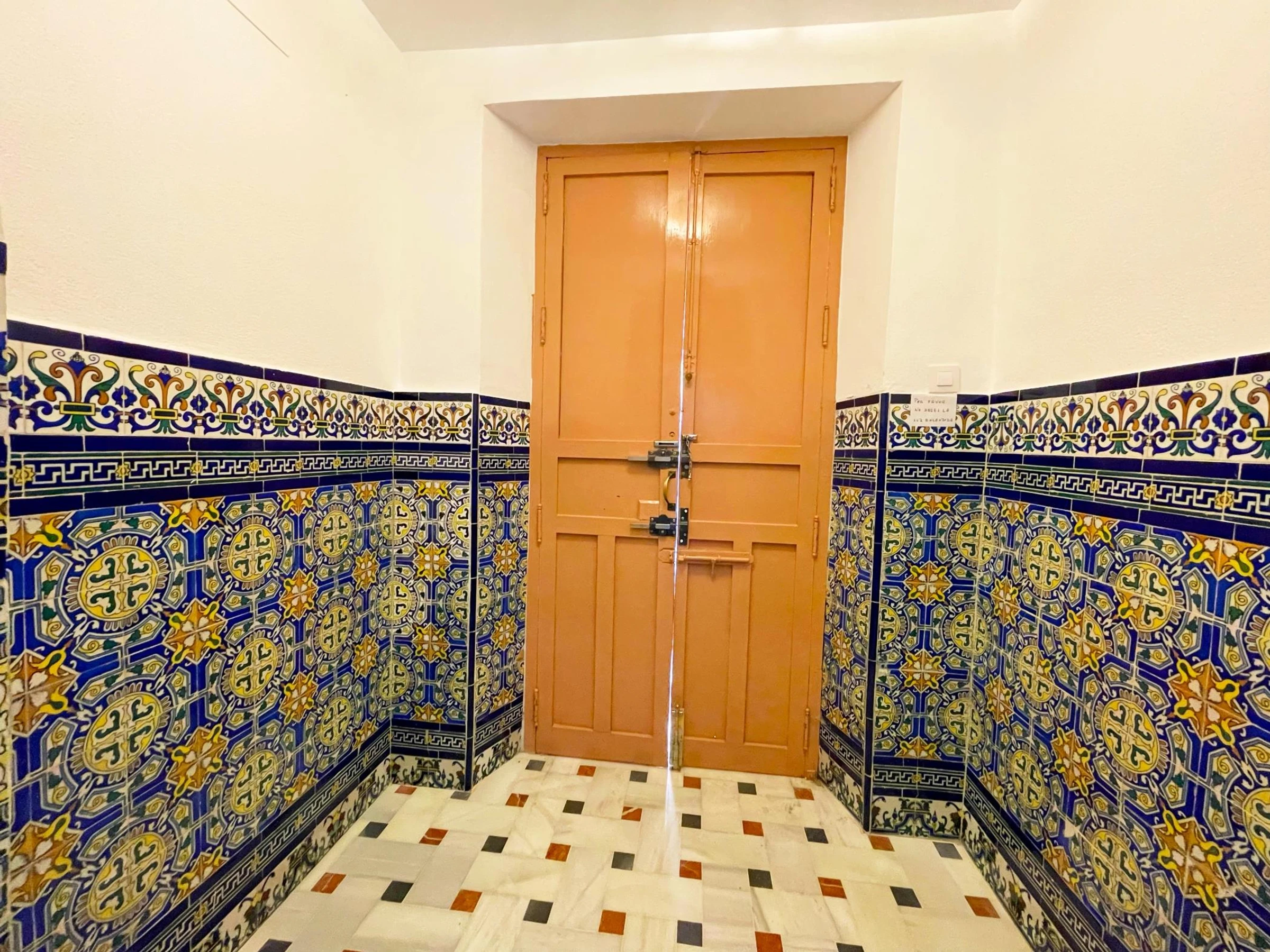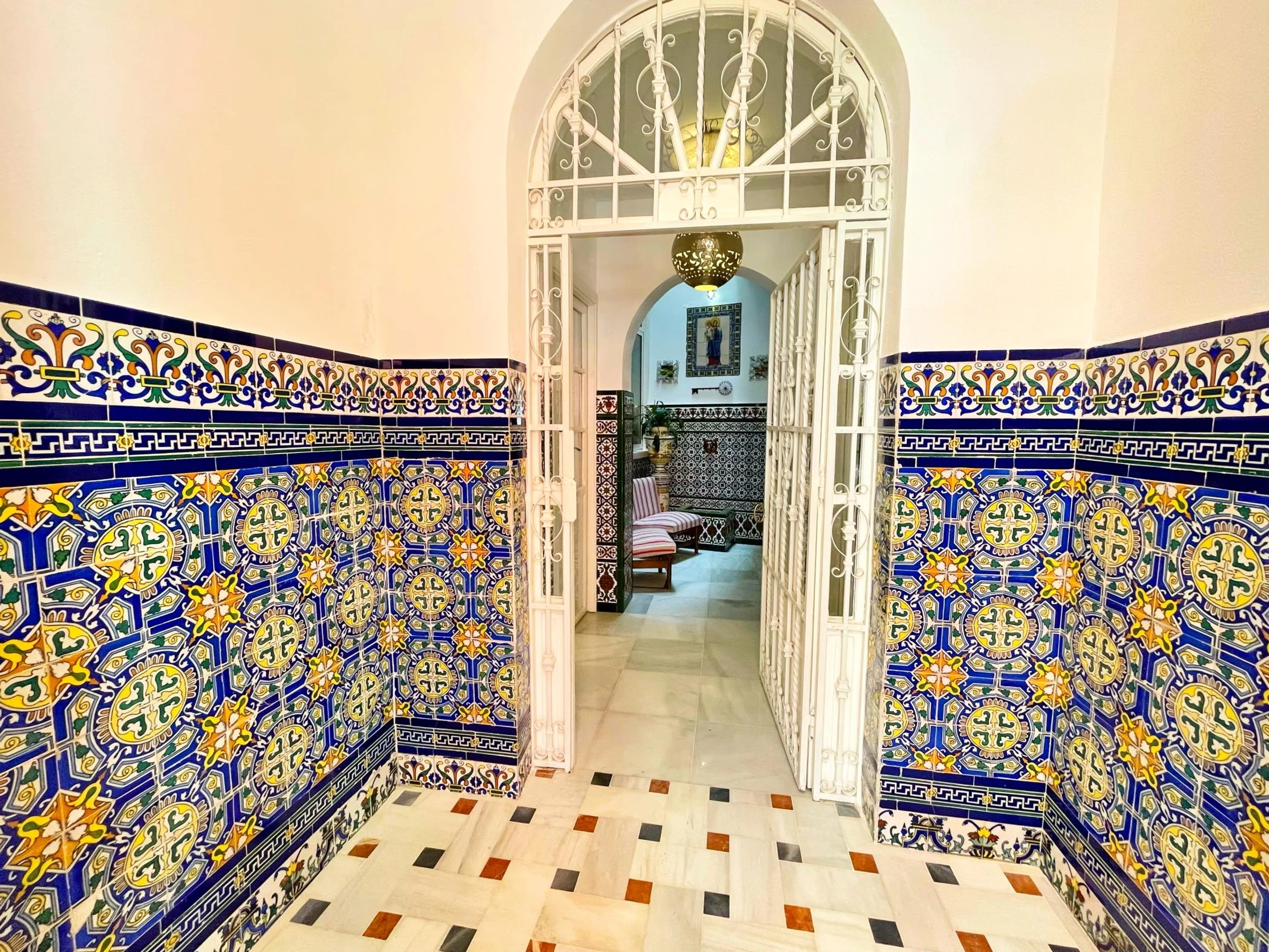 First floor: small communal courtyard at the entrance. Old staircase with walls tiled with old ceramic tiles from Seville.