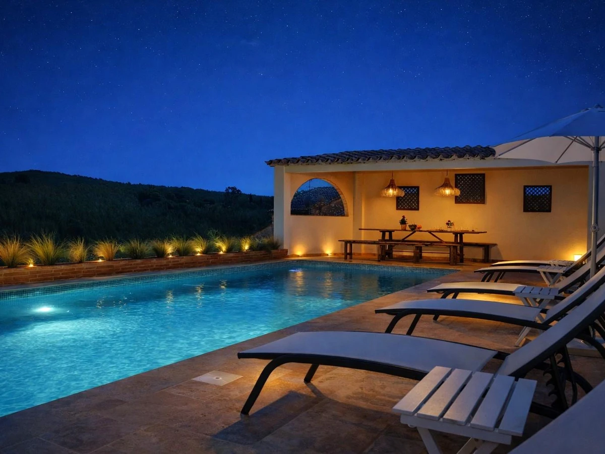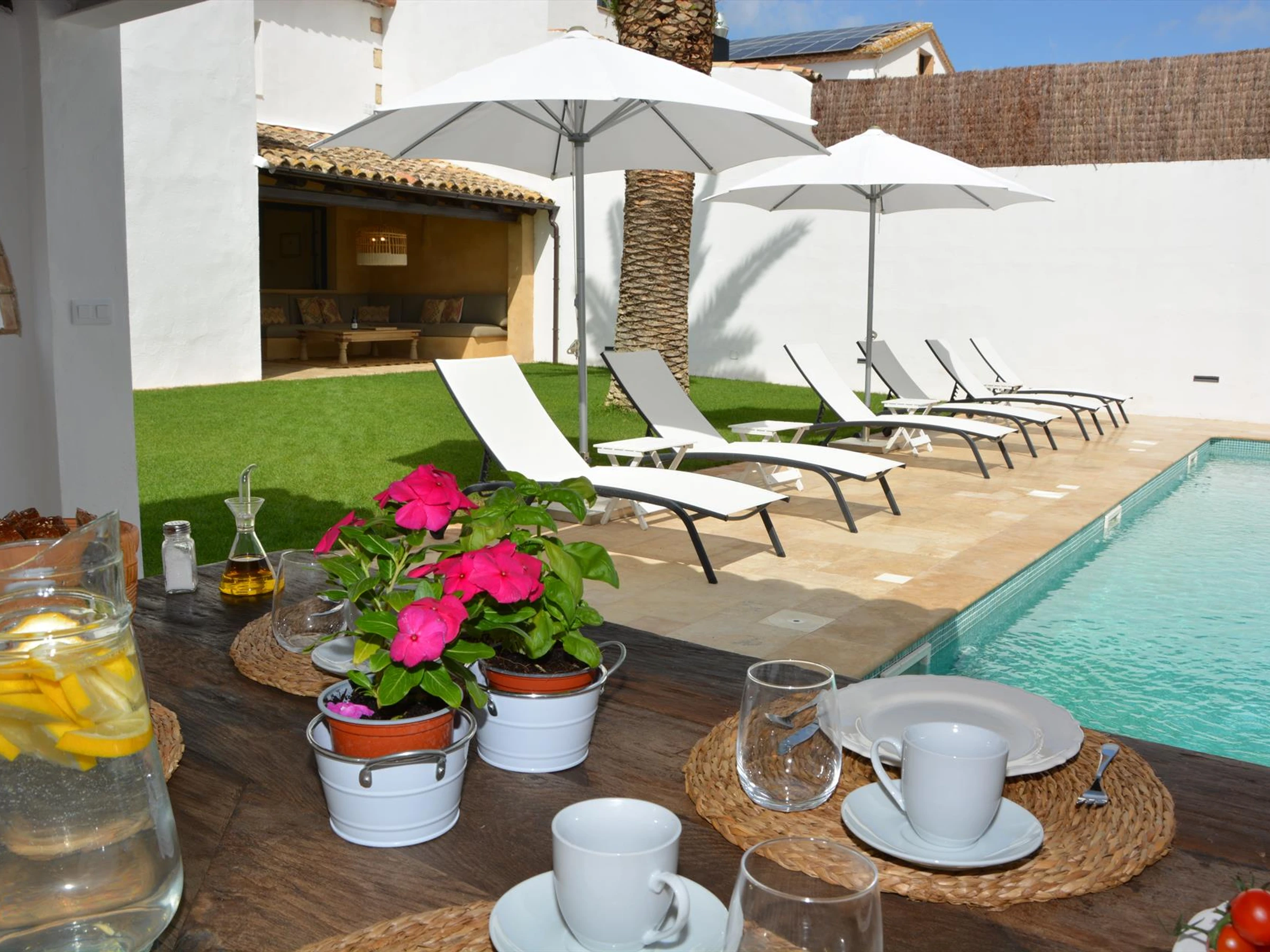 Outdoor chill-out area under a pergola, ideal for al fresco dining and