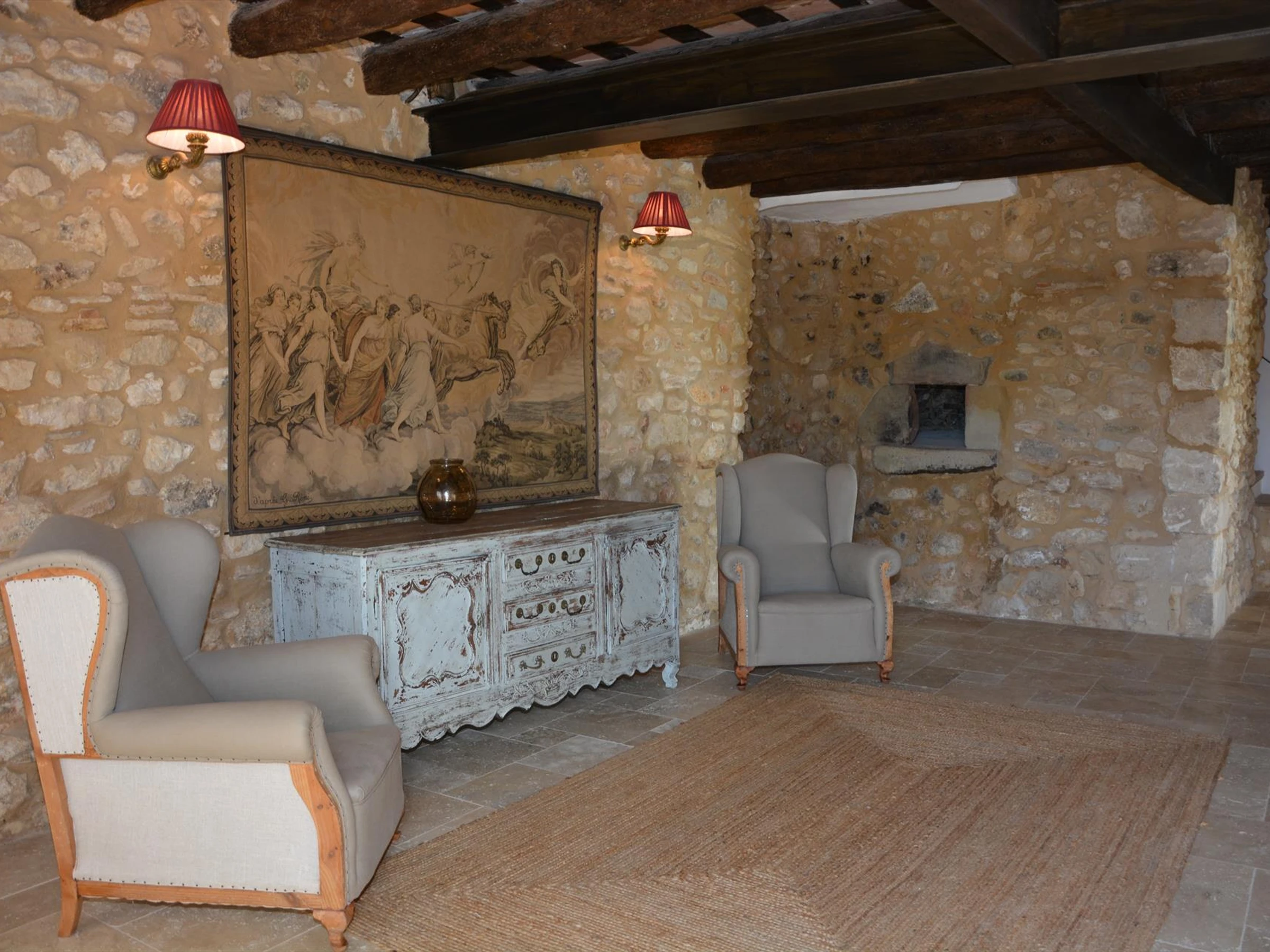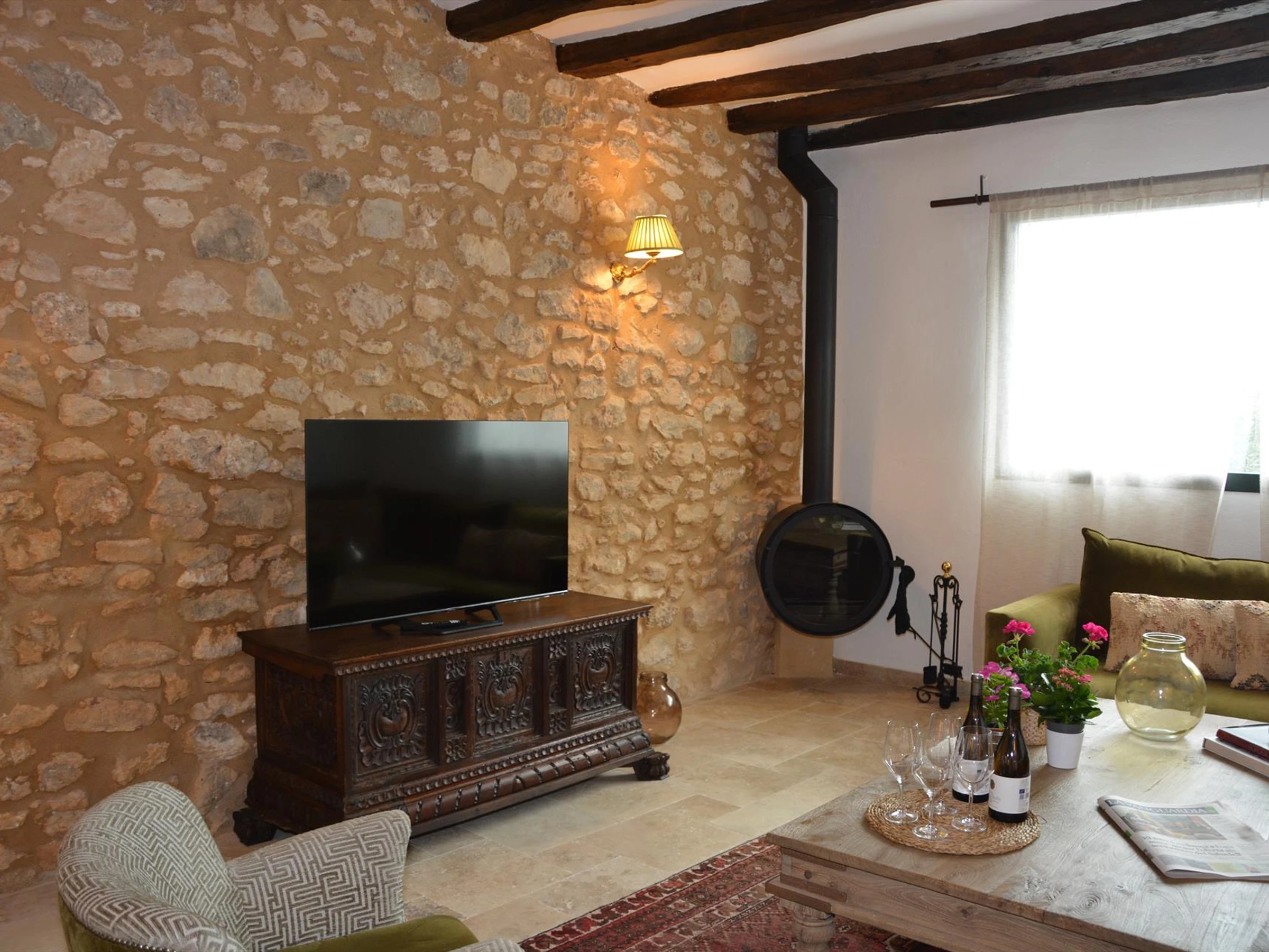 Main living room with fireplace and stone walls, ideal for sharing a glass of