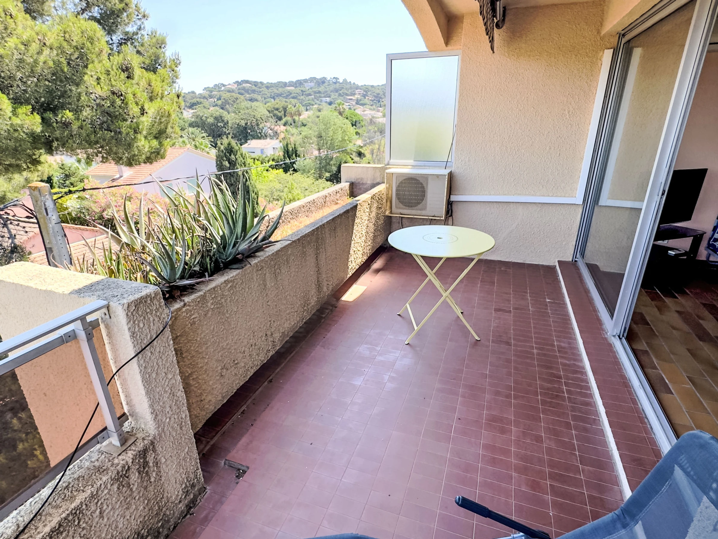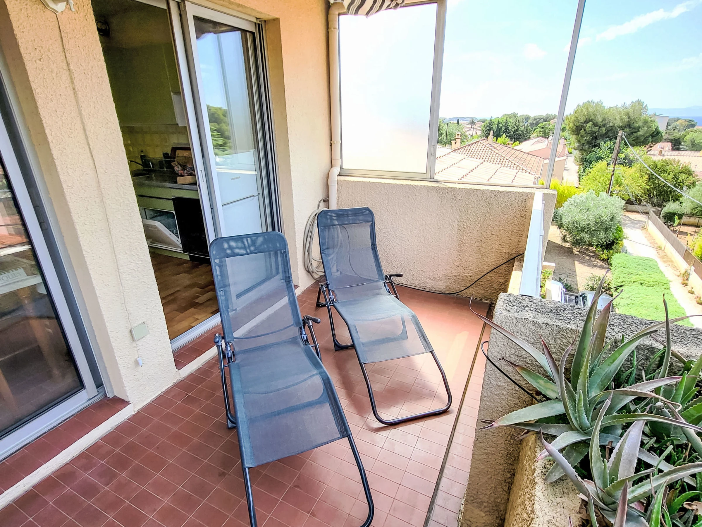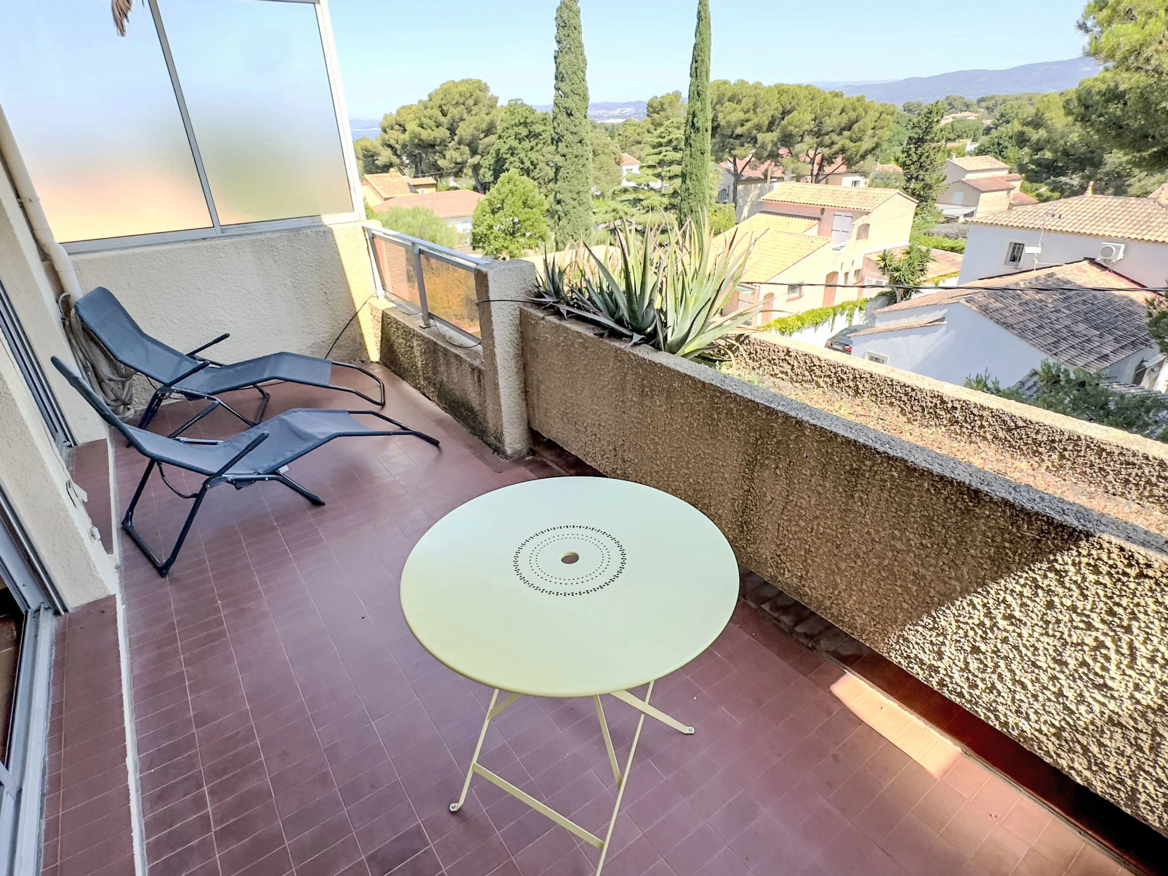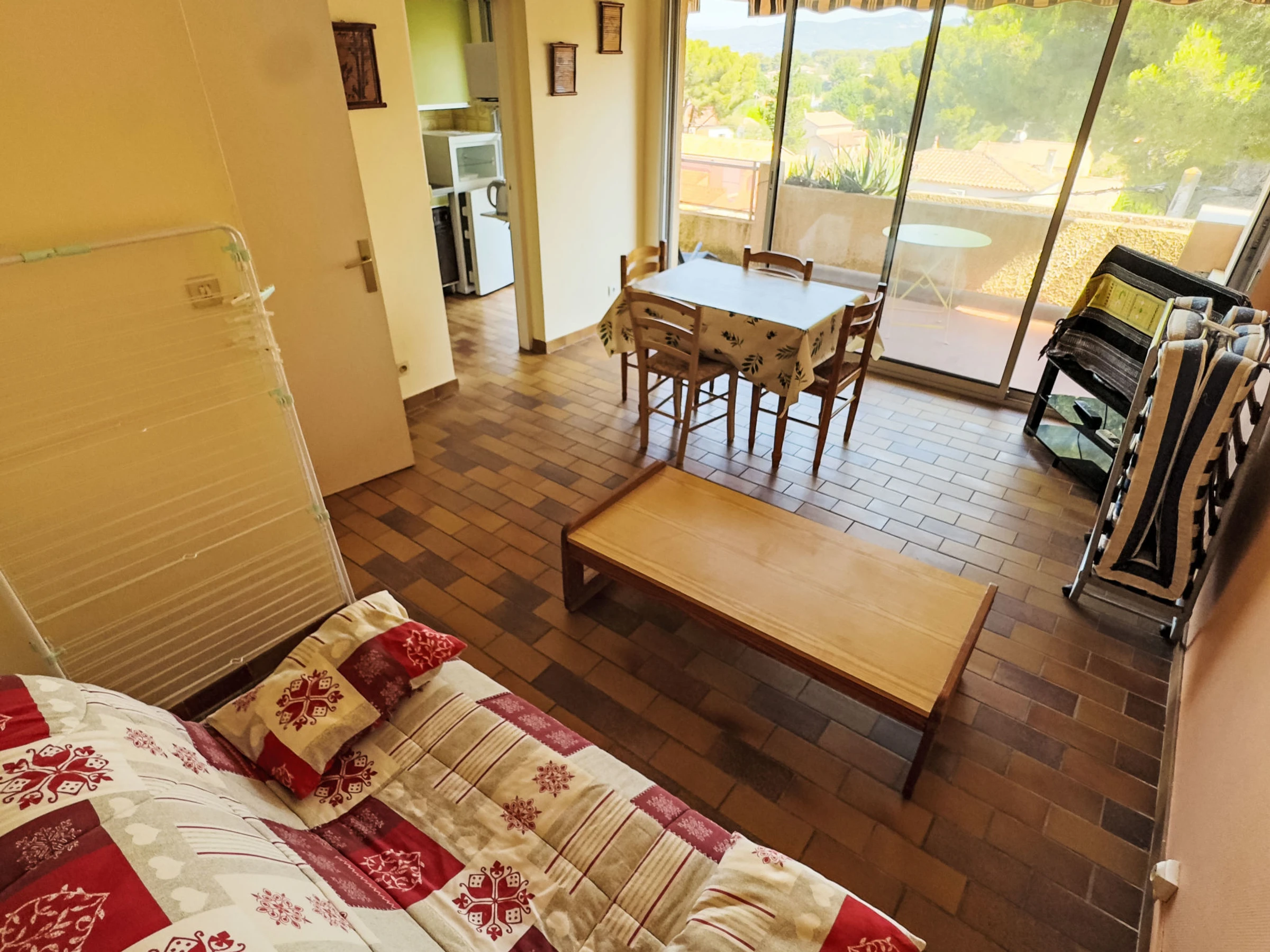 1-room apartment 28 m2 on 3rd floor. Comfortable furnishings: living/dining room with 1 sofabed (140 cm, length 190 cm), dining table and TV (flat screen). Exit to the veranda. Entrance hall with 1 bed (80 cm, length 190 cm). Kitchenette (2 ceramic glass hob hotplates, toaster, kettle, freezer, electric coffee machine, combination microwave). Bath/WC. Electric heating. Terrace 15 m2, roofed. Terrace furniture. Partial view of the sea. Facilities: Internet (WiFi, extra). Please note: non-smokers only. TV only FR. Smoke alarm, no lift. Offer by a private individual according to Art. 155, IV of CGI.