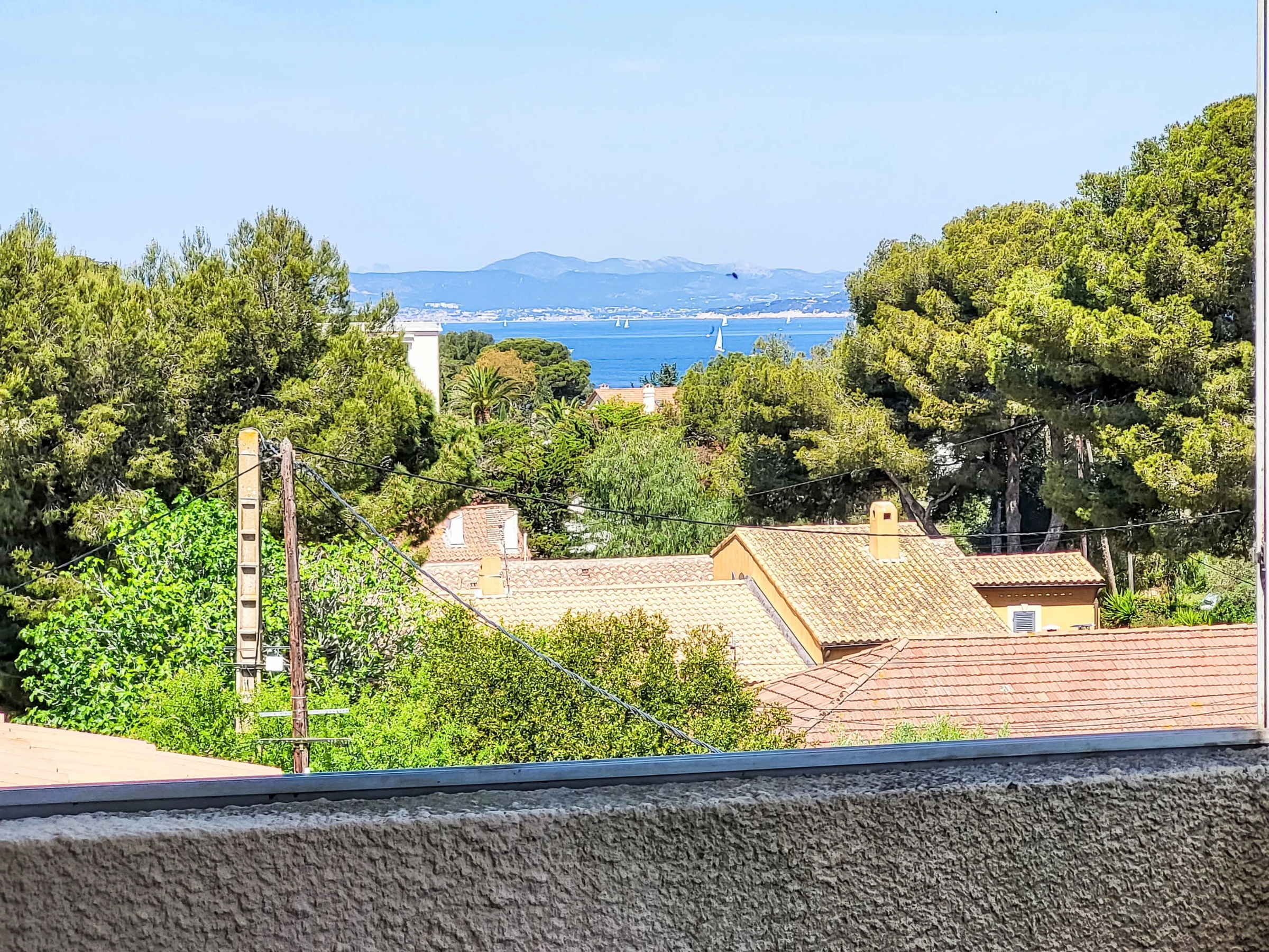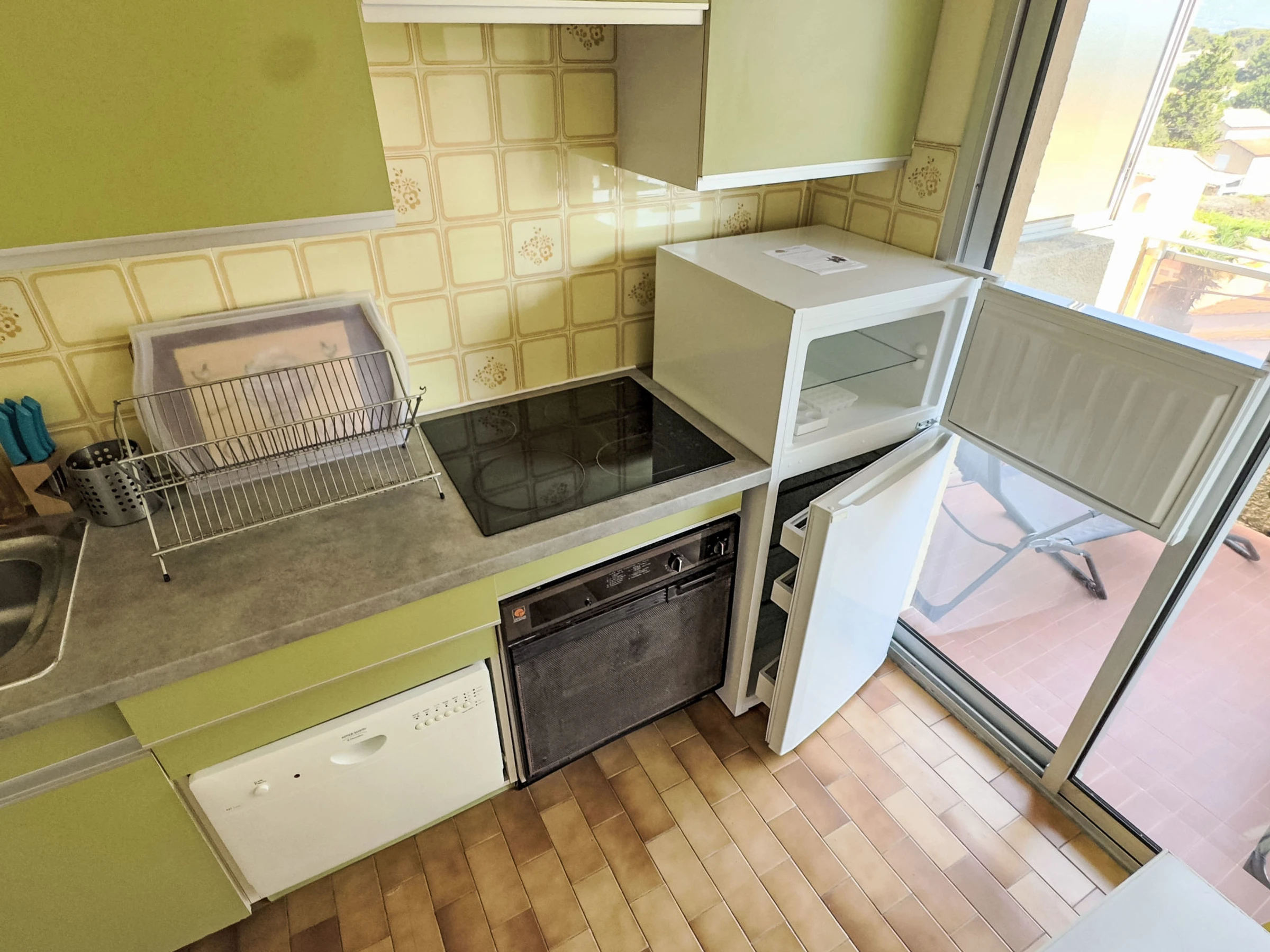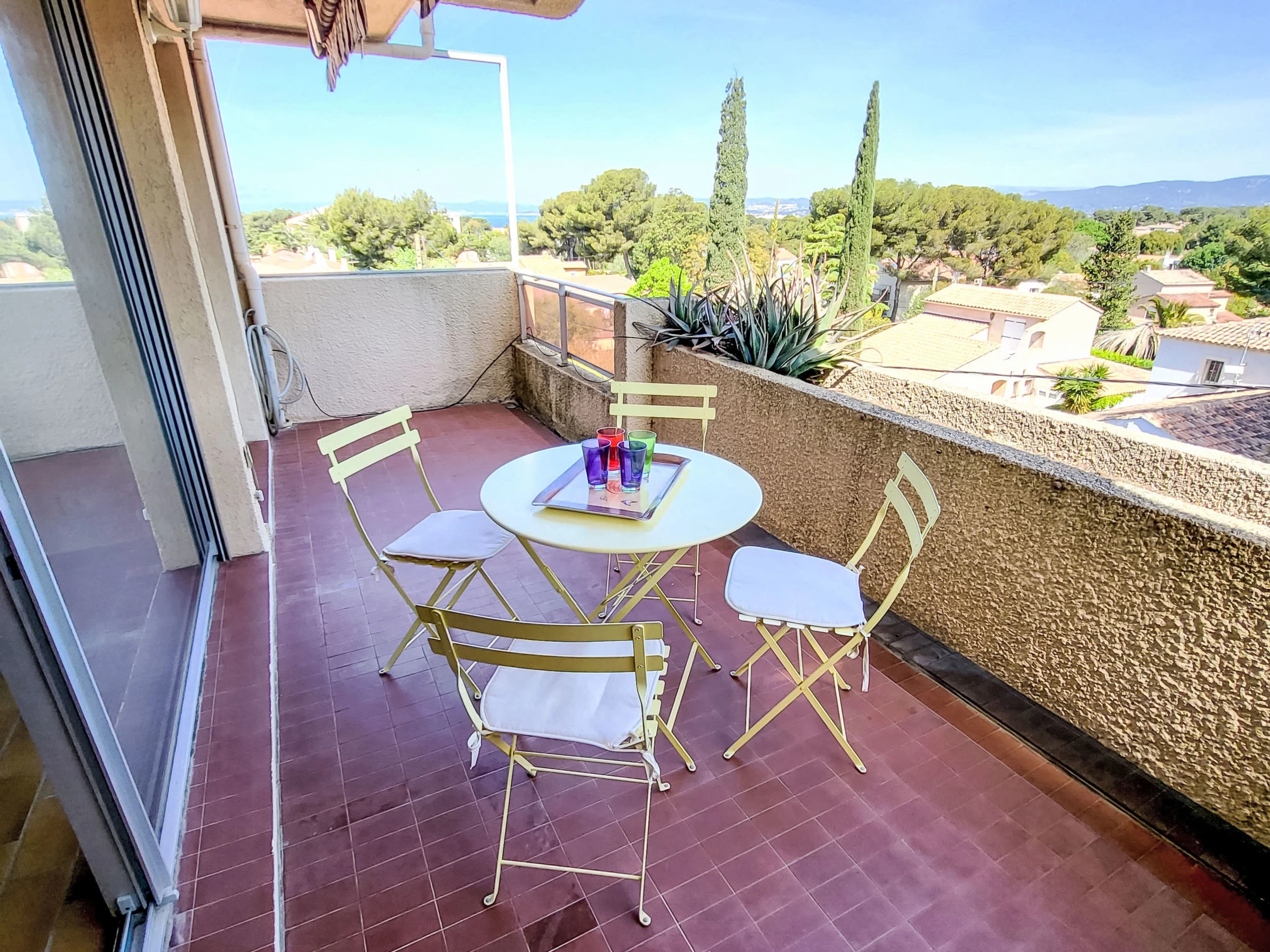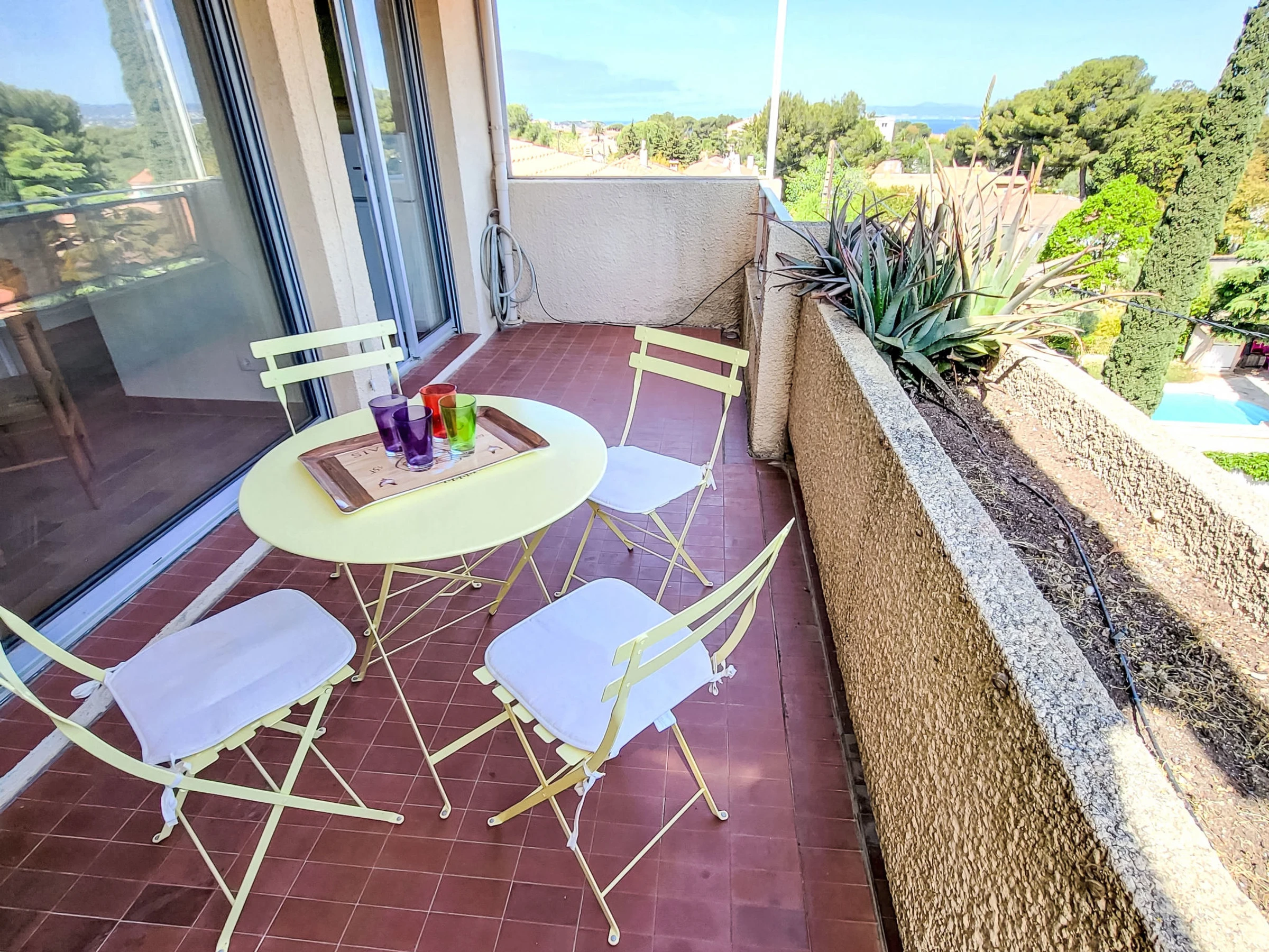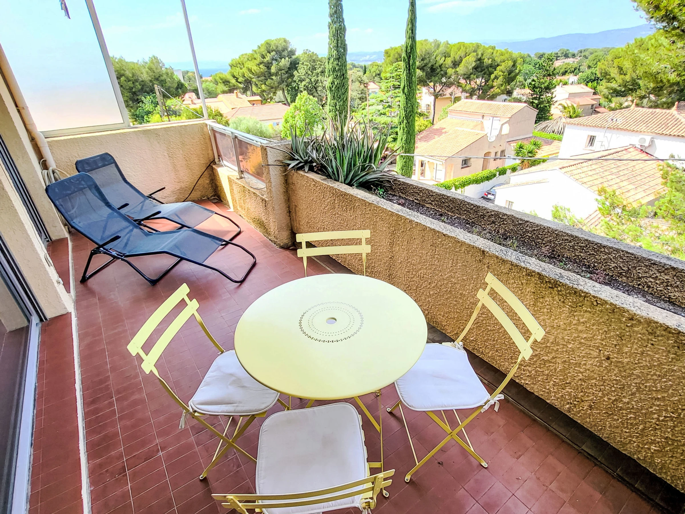 1-room apartment 28 m2 on 3rd floor. Comfortable furnishings: living/dining room with 1 sofabed (140 cm, length 190 cm), dining table and TV (flat screen). Exit to the veranda. Entrance hall with 1 bed (80 cm, length 190 cm). Kitchenette (2 ceramic glass hob hotplates, toaster, kettle, freezer, electric coffee machine, combination microwave). Bath/WC. Electric heating. Terrace 15 m2, roofed. Terrace furniture. Partial view of the sea. Facilities: Internet (WiFi, extra). Please note: non-smokers only. TV only FR. Smoke alarm, no lift. Offer by a private individual according to Art. 155, IV of CGI.