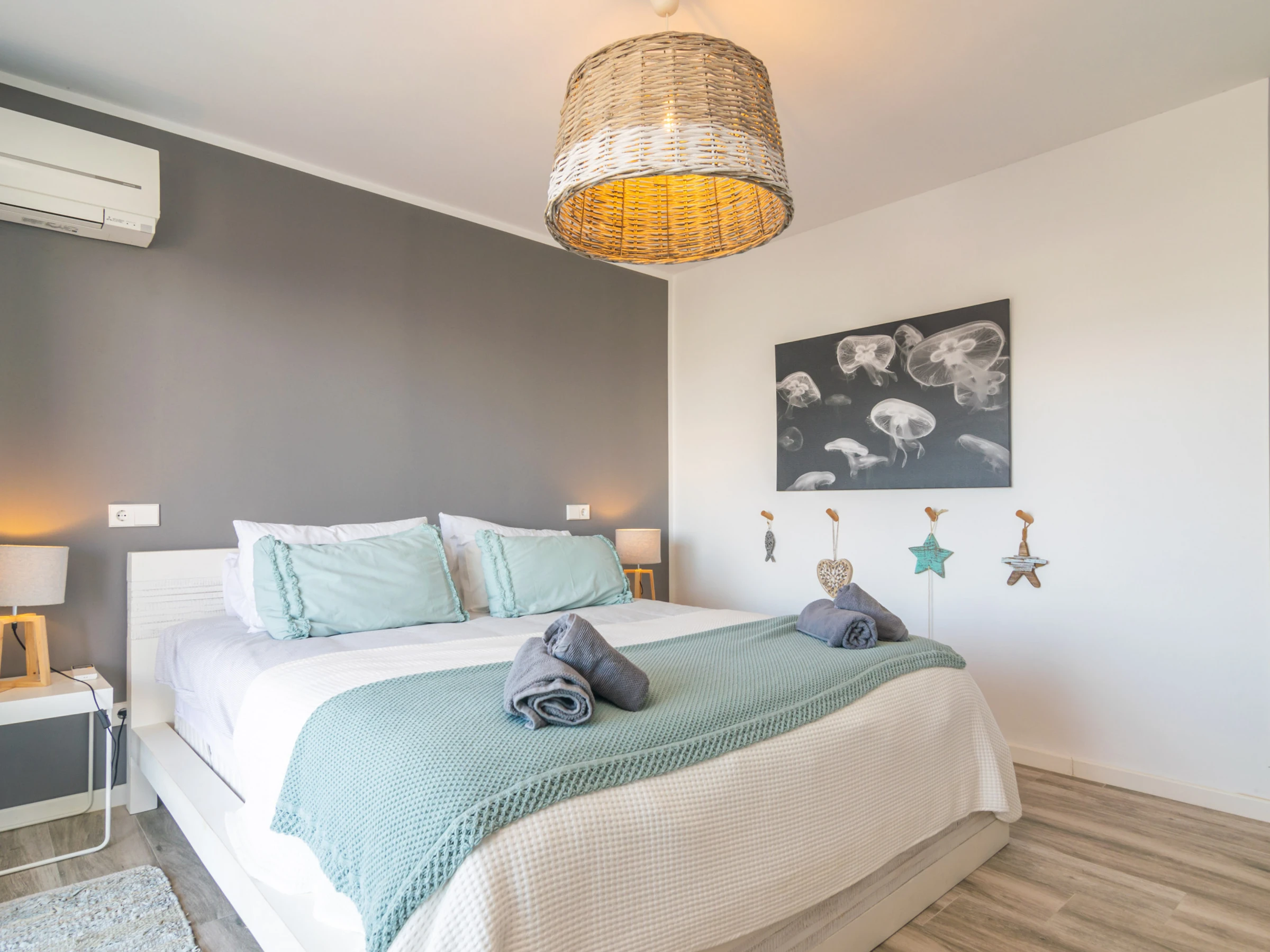 The modern house, decorated with great style and marine ornaments, is distributed over two floors. On the ground floor, there is a spacious open floor plan living area with two sofas, a Smart TV, AC, and a decorative fireplace. The open kitchen is equipped with an induction hob and all the amenities to cook delicious meals. The dining area offers unbeatable views of the pool. Completing the ground floor, you will find a guest toilet. Once upstairs, on the first floor, you will find the 5 bedrooms, the first one with a double bed, TV, AC, access to the balcony, wardrobe, and en suite bathroom with shower. The second bedroom, with a double bed, includes among its amenities AC, wardrobe, and desk, and also has access to the balcony. The third bedroom has a double bed with a bunk bed. The fourth bedroom has a double bed, AC, wardrobe, and en-suite bathroom with shower. The last bedroom also has a double bed and wardrobe. Finally, on this floor, there is another bathroom with a shower. It is worth mentioning that the flat has a washing machine, dryer, iron and ironing board. And if you are traveling with children, we can also provide a cot and a high chair.