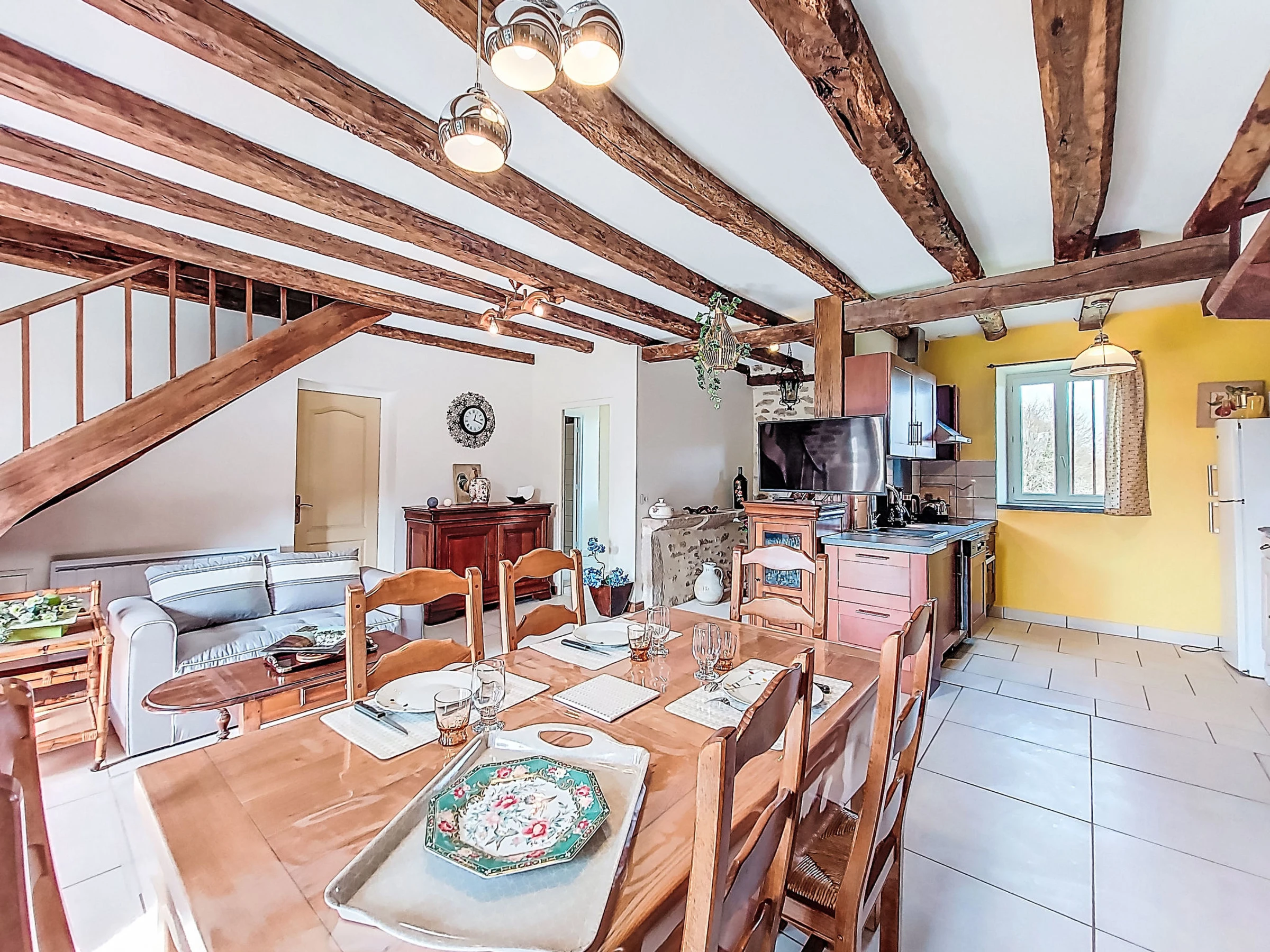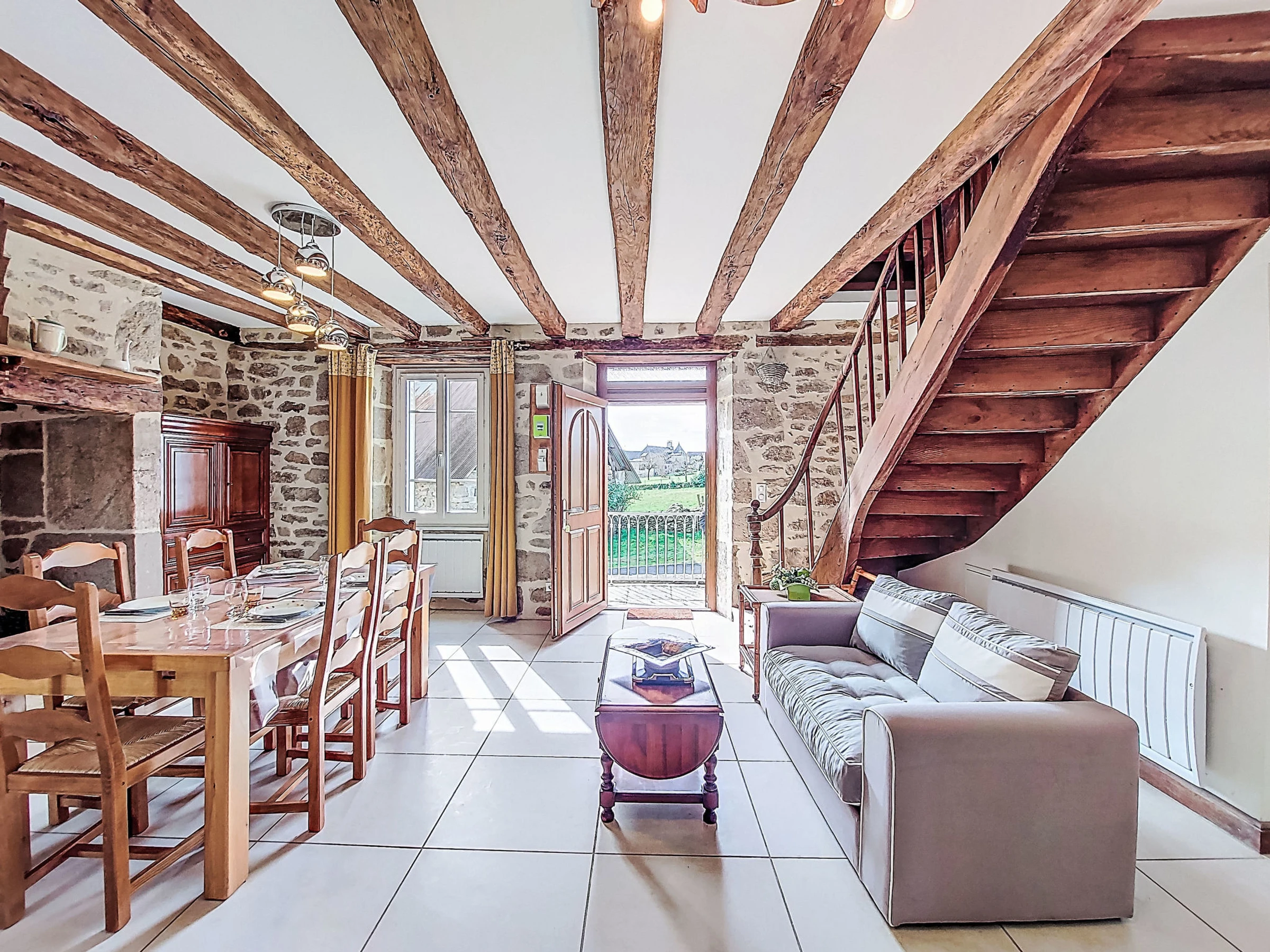 "Gîte Saint Sauveur", 2-room house 50 m2. Comfortable and rustic furnishings: living/dining room with open-hearth fireplace (only for decoration), dining table and TV (flat screen). 1 large room with 1 bed (90 cm, length 190 cm), 1 french bed (140 cm, length 190 cm), TV. Kitchen (oven, dishwasher, 3 induction hot plates, toaster, kettle, microwave, freezer, electric coffee machine). Shower, sep. WC. Electric heating. Facilities: washing machine. Please note: maximum 2 pets/ dogs allowed. Smoke alarm. Offer by a private individual according to Art. 155, IV of CGI.