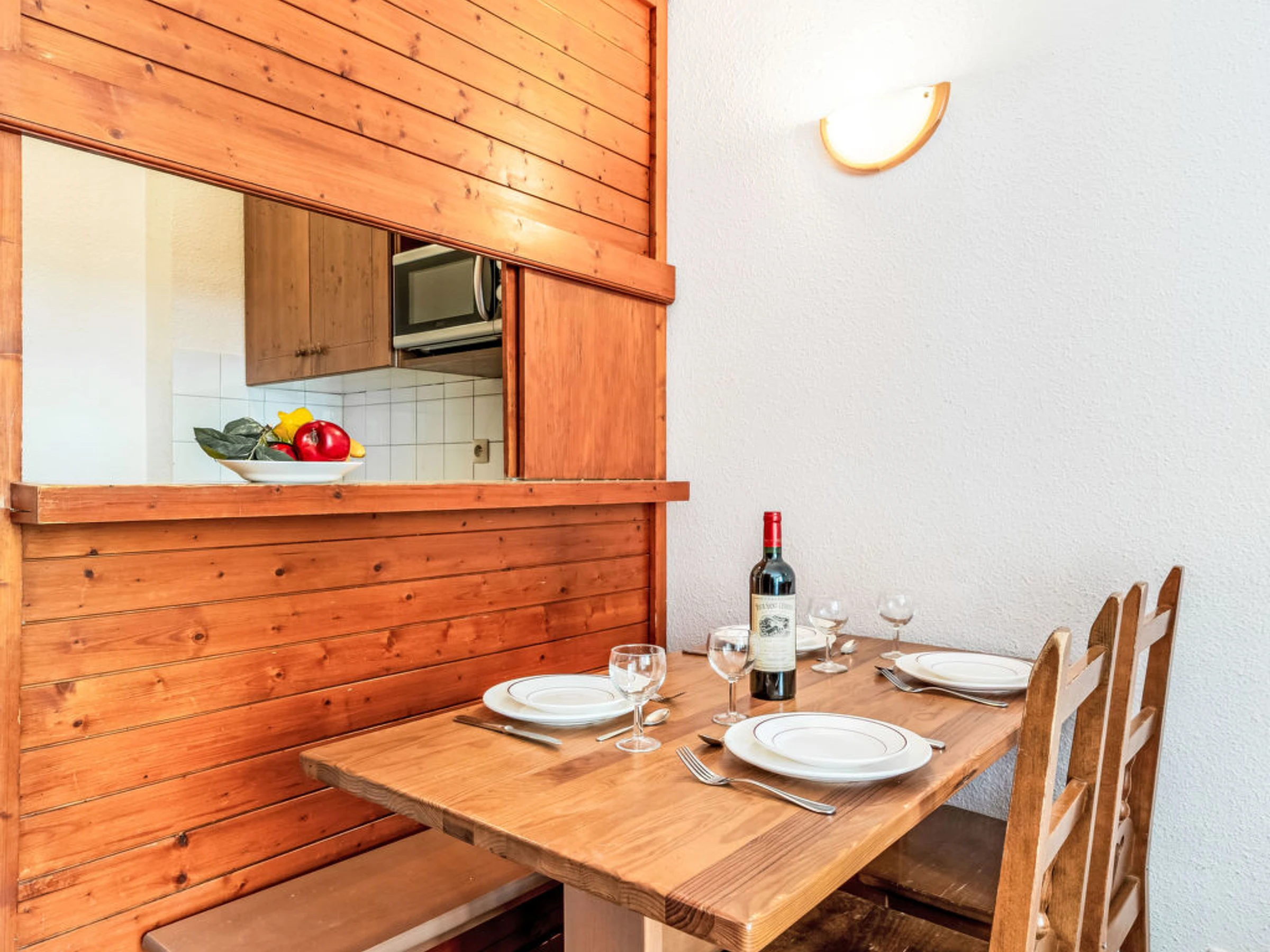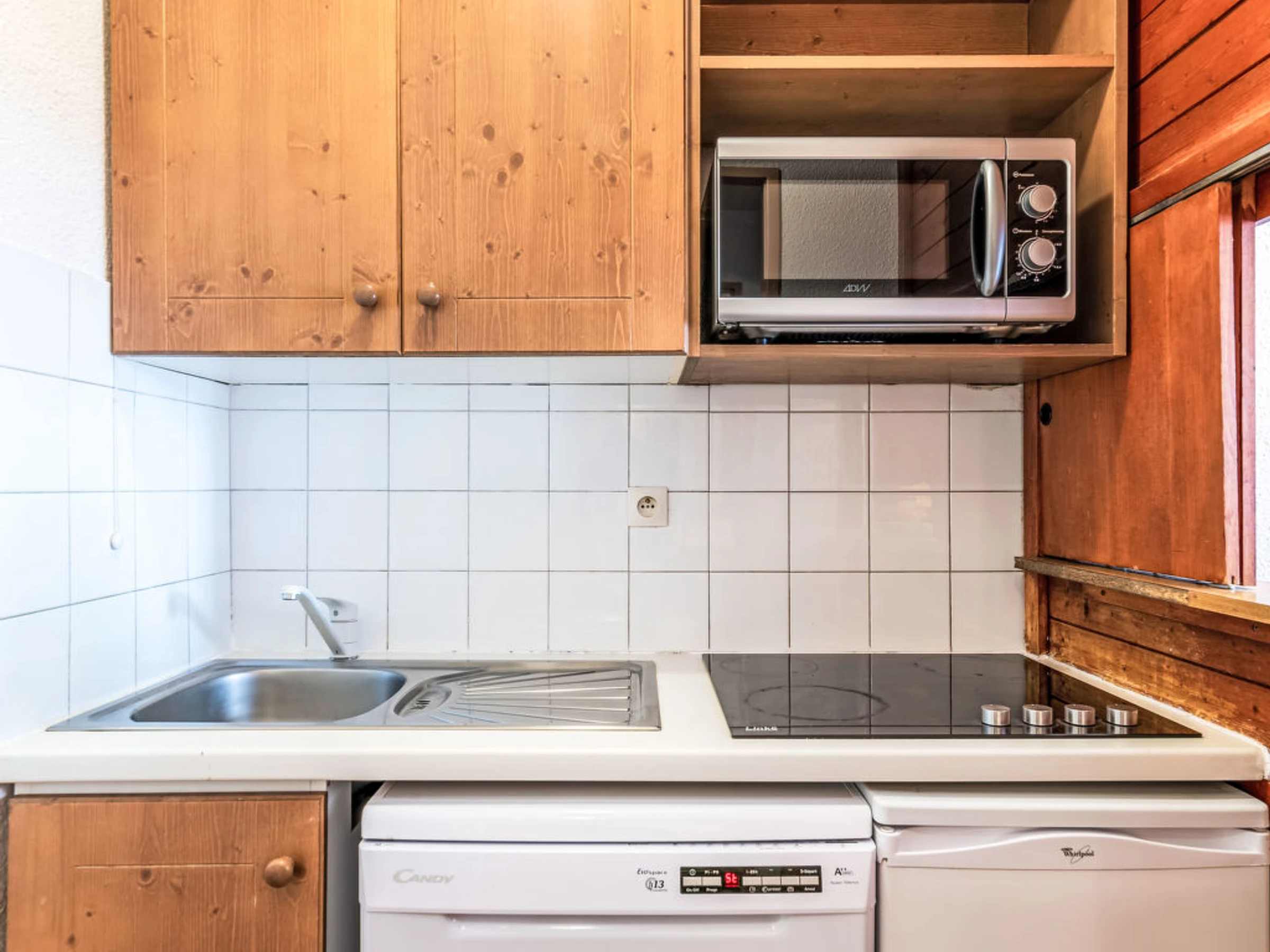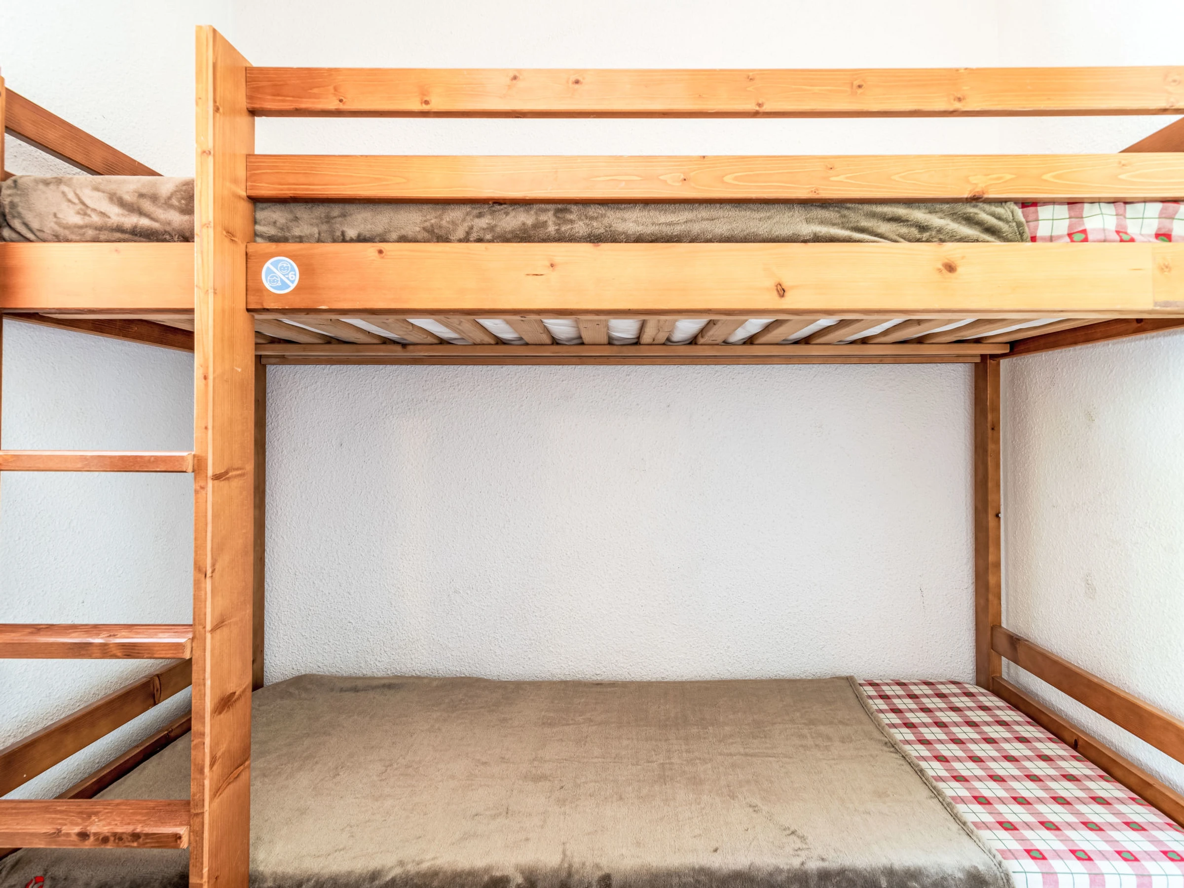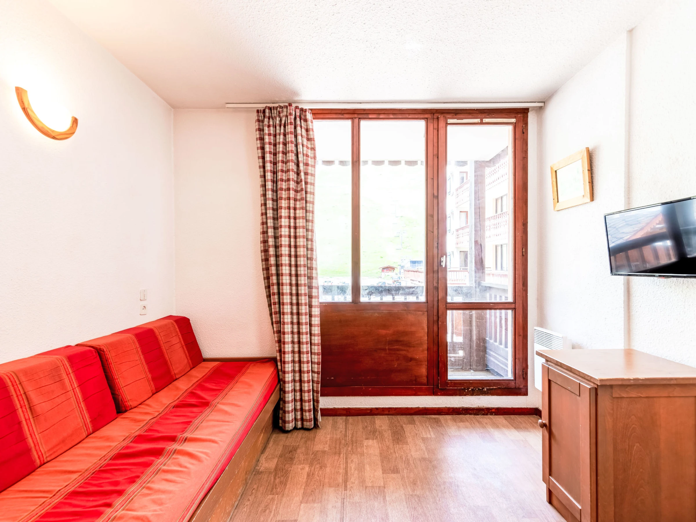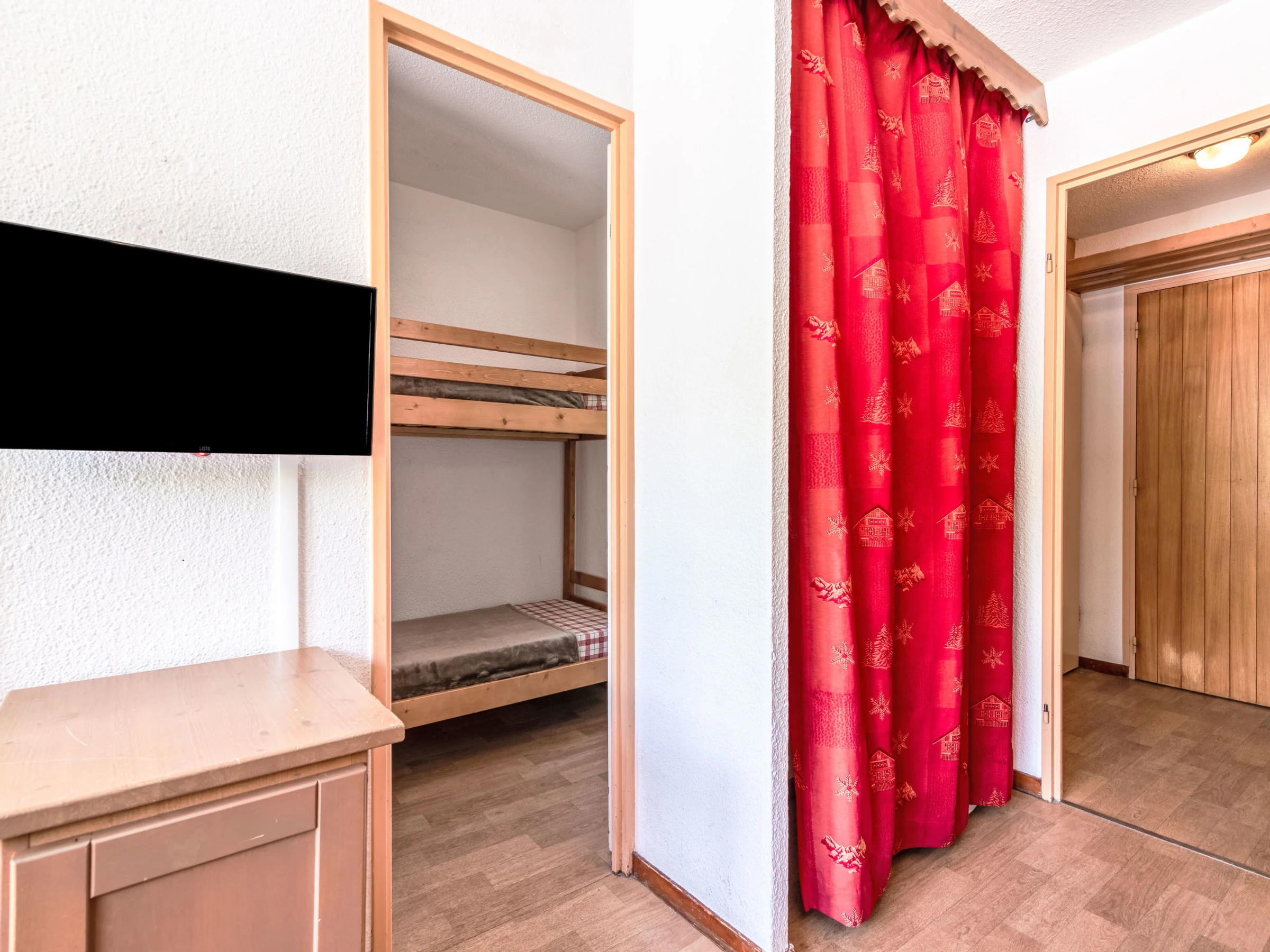 1-room studio 24 m2 on 1st floor. Living/dining room with 1 pull-out bed (2 pers. 2 x 80 cm, length 190 cm), TV (flat screen). Exit to the balcony, west facing position. Sleeping alcove with 1 x 2 bunk beds (80 cm, length 190 cm). Kitchenette (dishwasher, 4 ceramic glass hob hotplates, toaster, kettle, microwave, electric coffee machine). Bathroom, sep. WC. Electric heating. View of the mountains and the ski run. Facilities: Internet (WiFi, extra). Please note: non-smokers only. Smoke alarm. Instead of an enclosed bedroom, some sleeping areas are located in an open-plan area (gallery, alcove, etc.). Offer by a private individual according to Art. 155, IV of CGI.