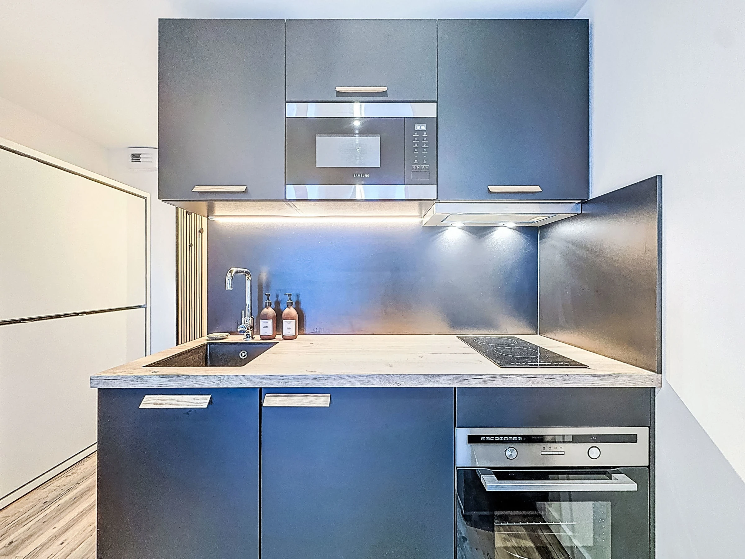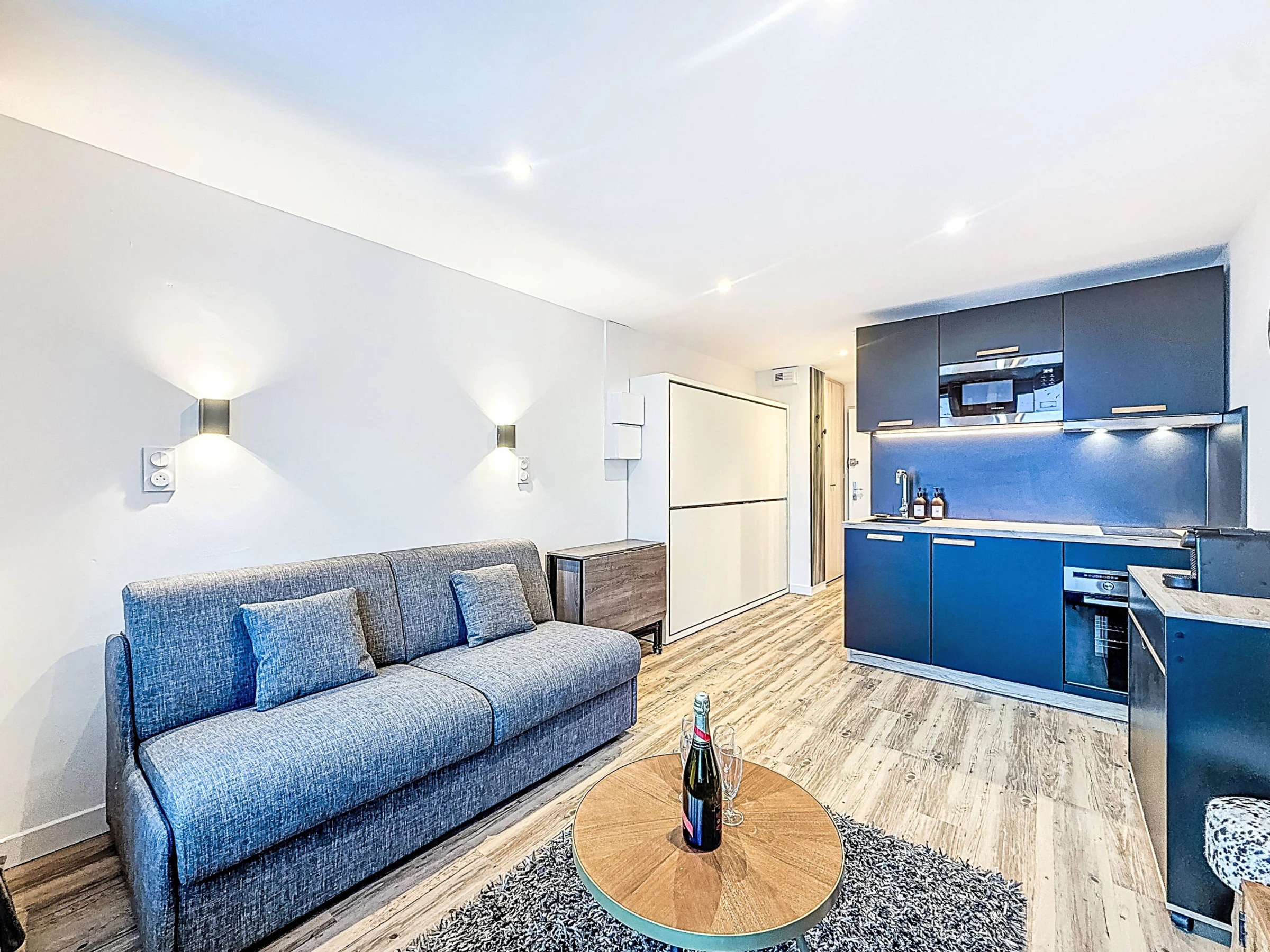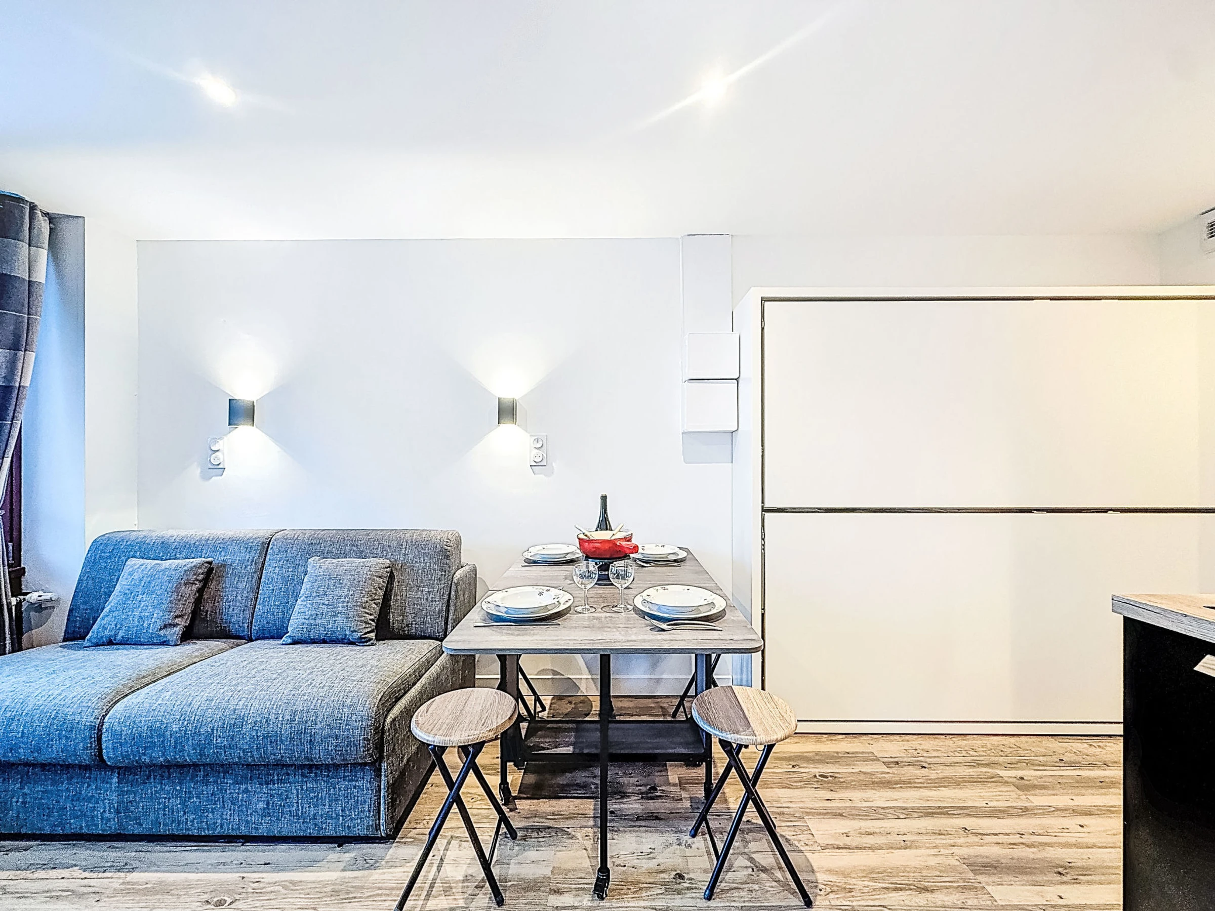 "Curling B3 51", 1-room studio 22 m2, south-west facing position. Fully renovated in 2025, comfortable furnishings: entrance hall with 1 x 2 bunk beds (80 cm, length 190 cm). Living/dining room with 1 double sofabed (1 x 140 cm, length 190 cm), TV and heating stove. Exit to the balcony, south facing position and west facing position. Open kitchen (2 hot plates, oven, toaster, kettle, electric coffee machine). Bath/WC. Very beautiful view of the mountains. Facilities: Internet (WiFi, extra). Please note: smoke alarm. Instead of an enclosed bedroom, some sleeping areas are located in an open-plan area (gallery, alcove, etc.). Offer by a private individual according to Art. 155, IV of CGI.