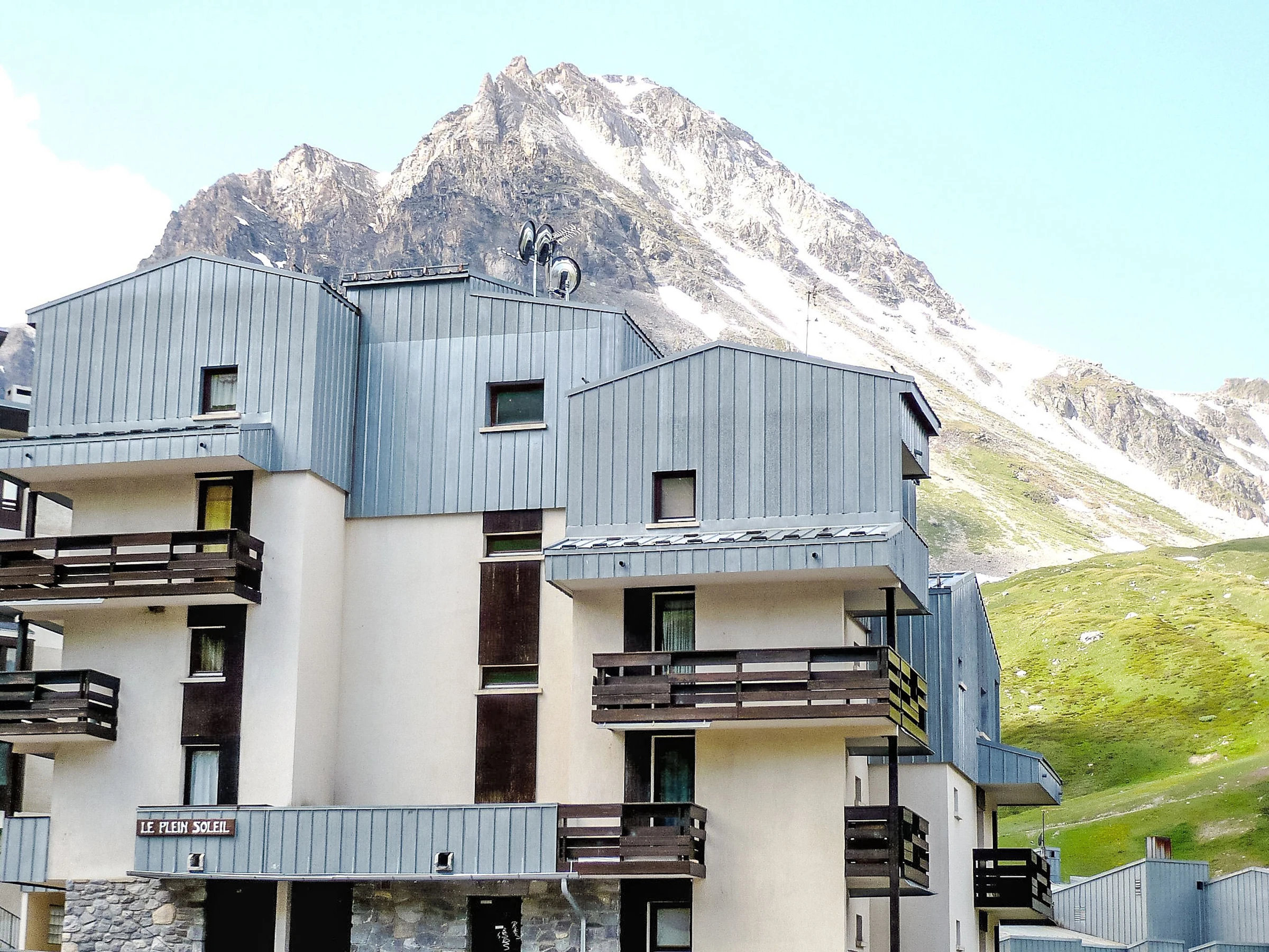 Tignes Val Claret: Apartment block "Plein Soleil (Val Claret)", 5 storeys. In the complex: lift, storage room for skis, central heating system. Supermarket, restaurant 50 m, bus stop 500 m, indoor swimming pool 2.2 km. Sports centre 2 km, skisport facilities 50 m, children's ski school 200 m. Well-known ski regions can easily be reached: TIGNES VAL D'ISERE 50 m. Please note: groups of teenagers on request only. Ski bus (free of charge).