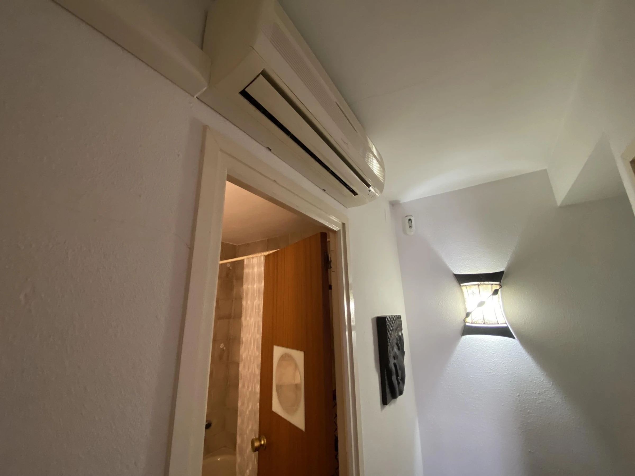 Upstairs, the two bedrooms are conveniently located with air conditioning in the hallway, ensuring a pleasant temperature throughout the sleeping area.