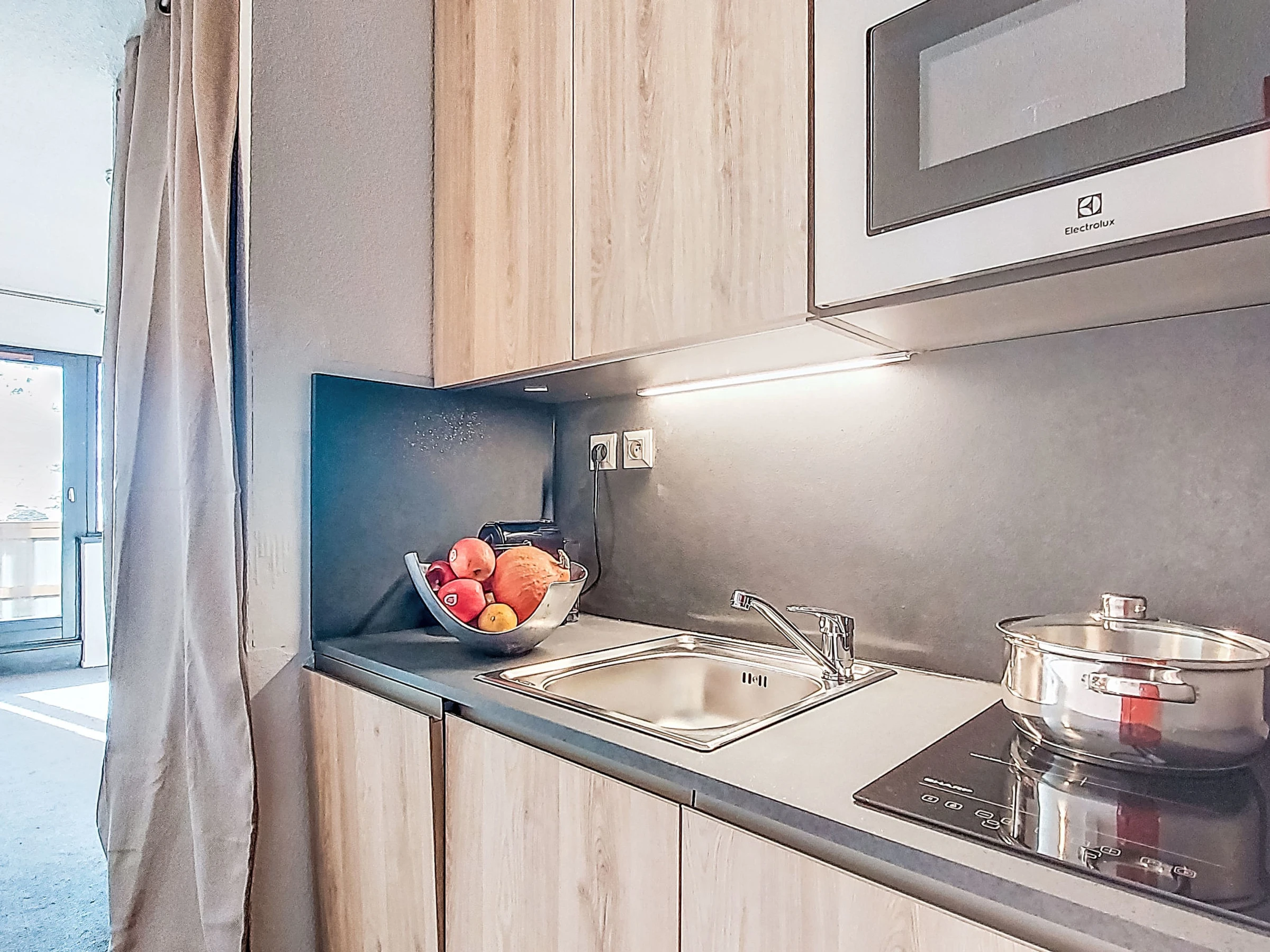 1-room studio 21 m2 on 6th floor, south facing position. Comfortable furnishings: living/dining room with 1 pull-out bed (1 pers. 2 x 80 cm, length 190 cm), dining table, TV, flat screen and electric heating. Exit to the balcony, south facing position. Entrance hall with kitchen corner. Sleeping alcove with 1 x 2 bunk beds (80 cm, length 190 cm). Kitchenette (2 hot plates, dishwasher, toaster, kettle, microwave, grill, electric coffee machine). Bathroom, sep. WC. Carpet. Small balcony 3 m2. Beautiful panoramic view of the mountains, the valley, the ski run and the resort. Facilities: safe. Internet (WiFi, extra). Please note: non-smokers only. Smoke alarm. Offer by a private individual according to Art. 155, IV of CGI. [hidden]