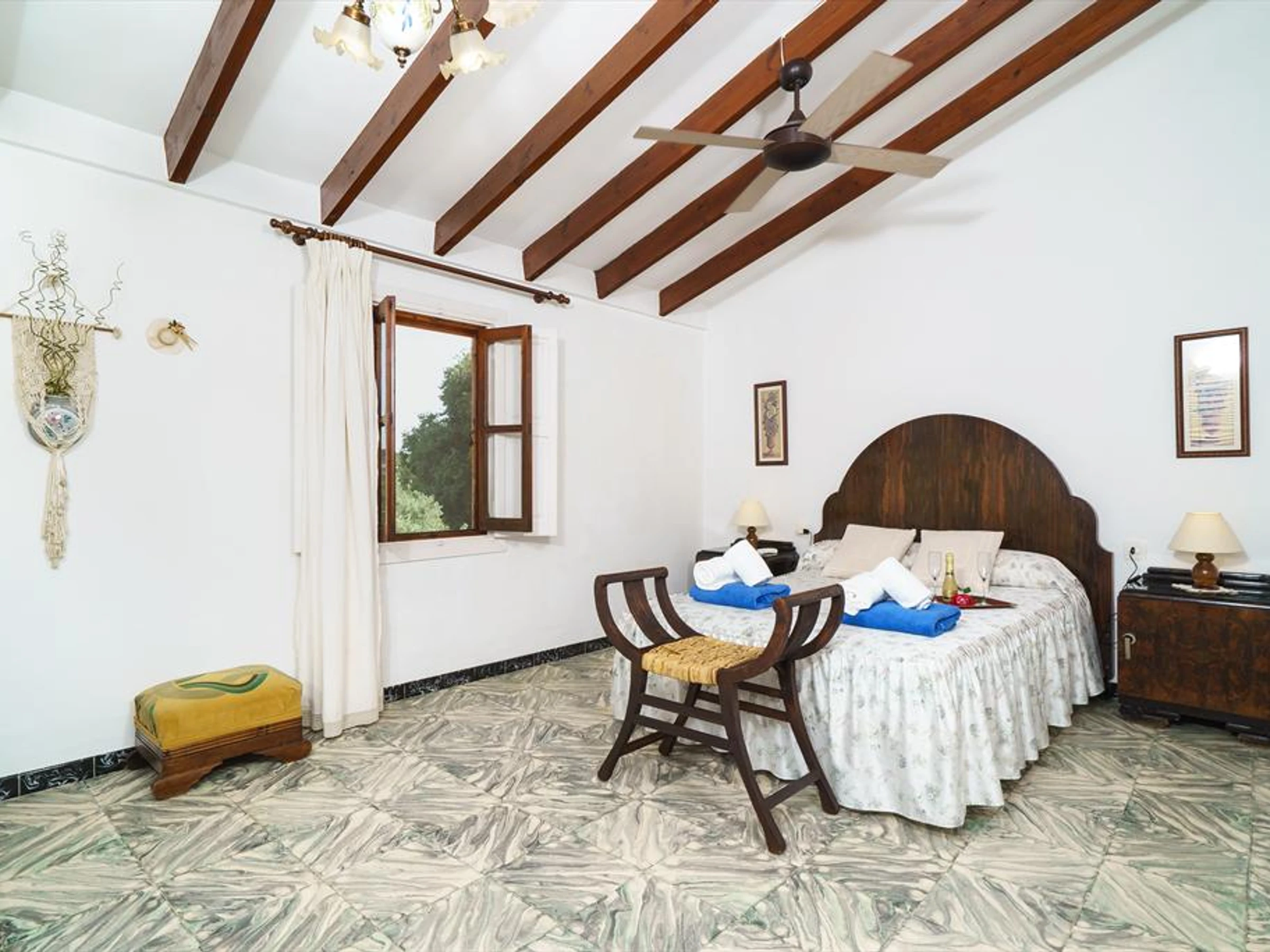 * bedroom with double bed and fan