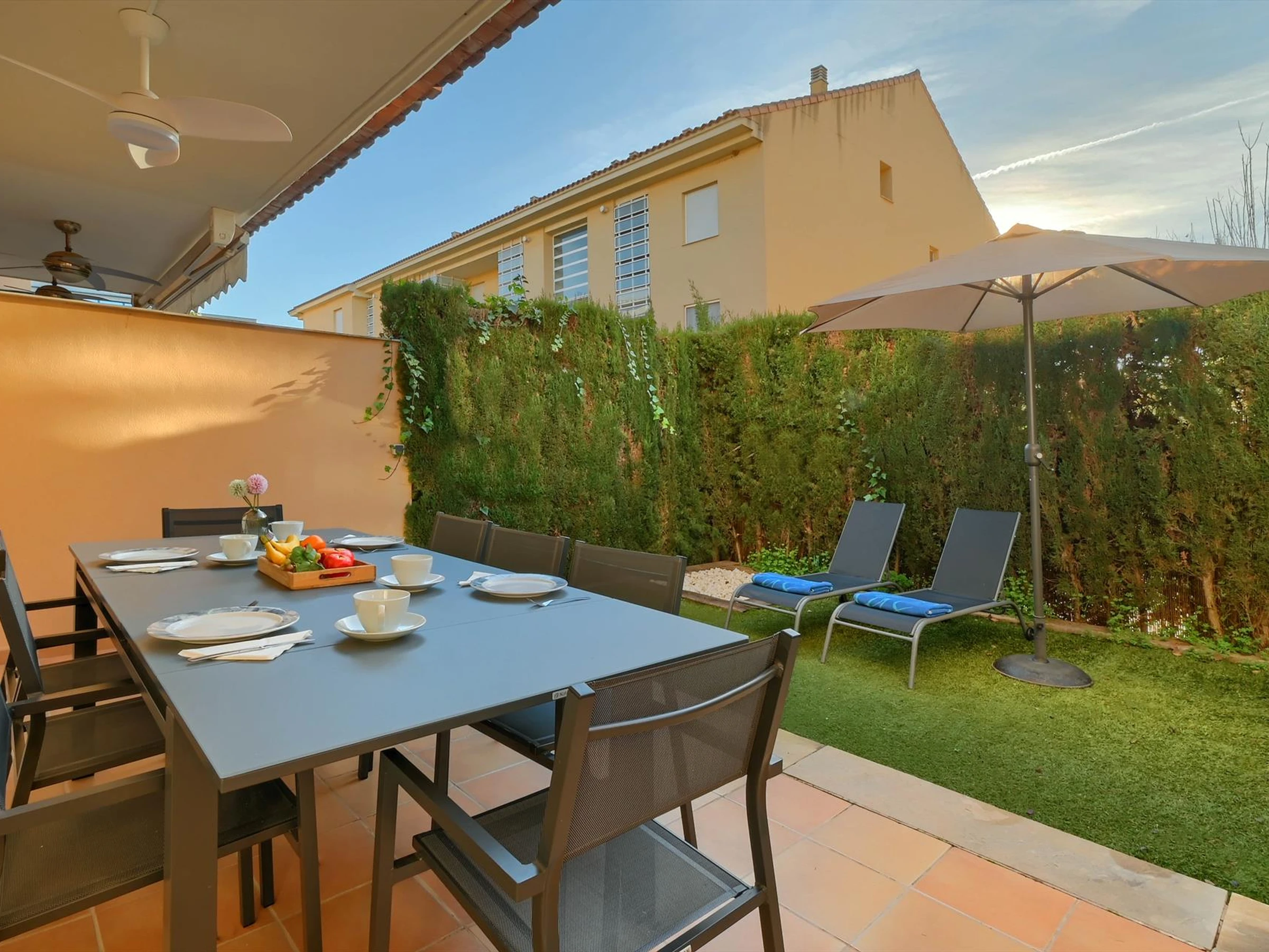 * wonderful lawned garden with trees and garden furniture with sunbeds