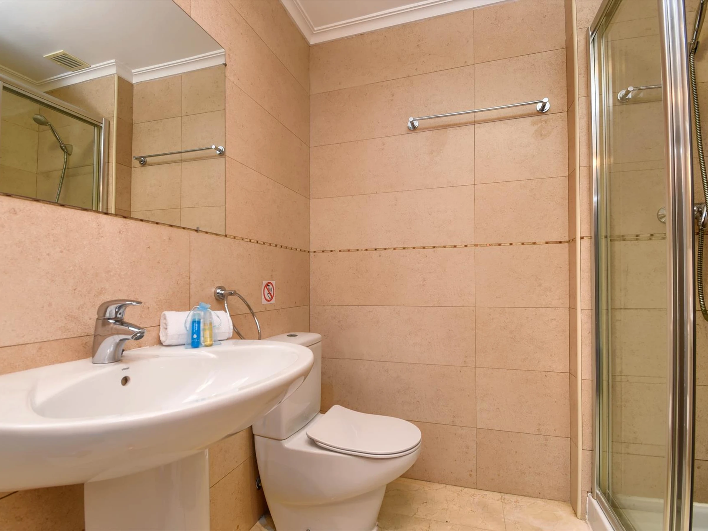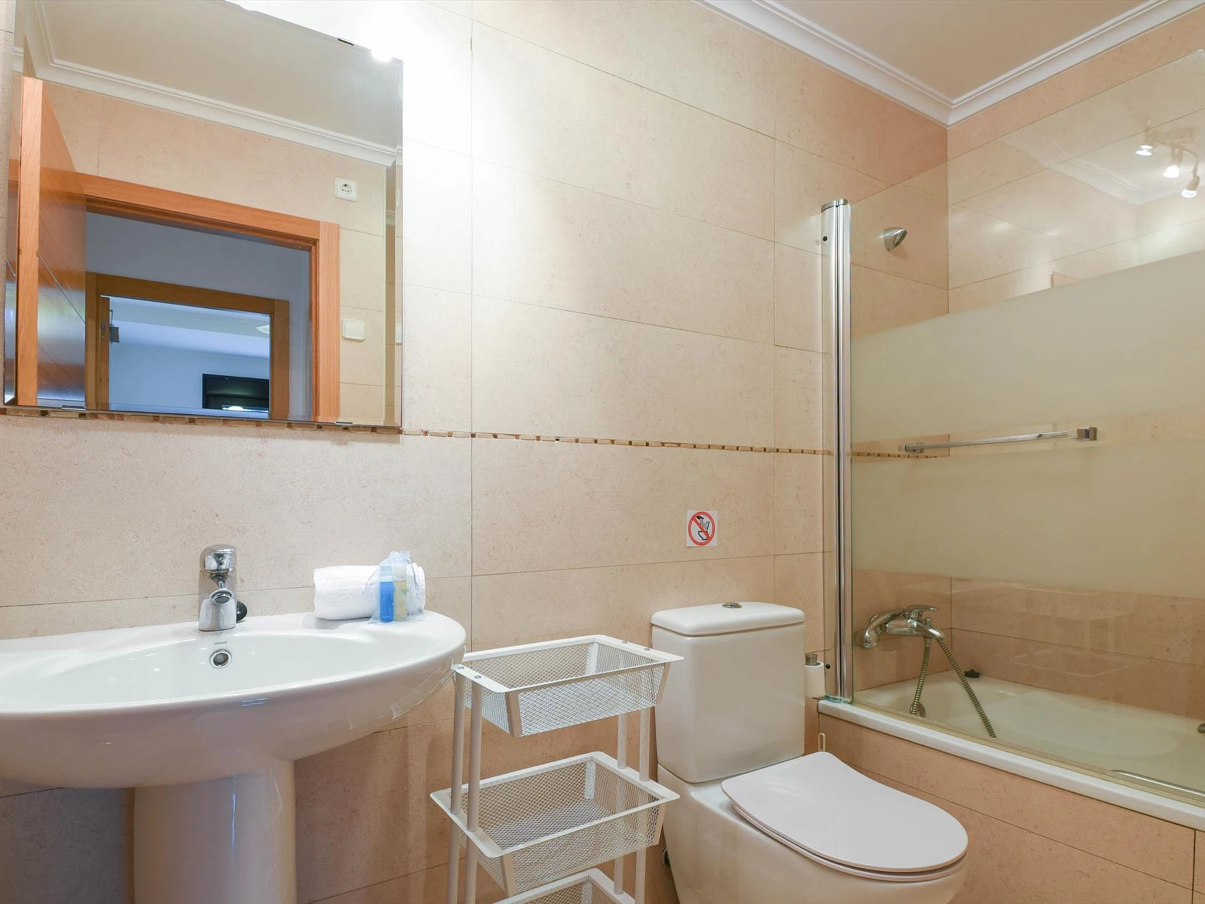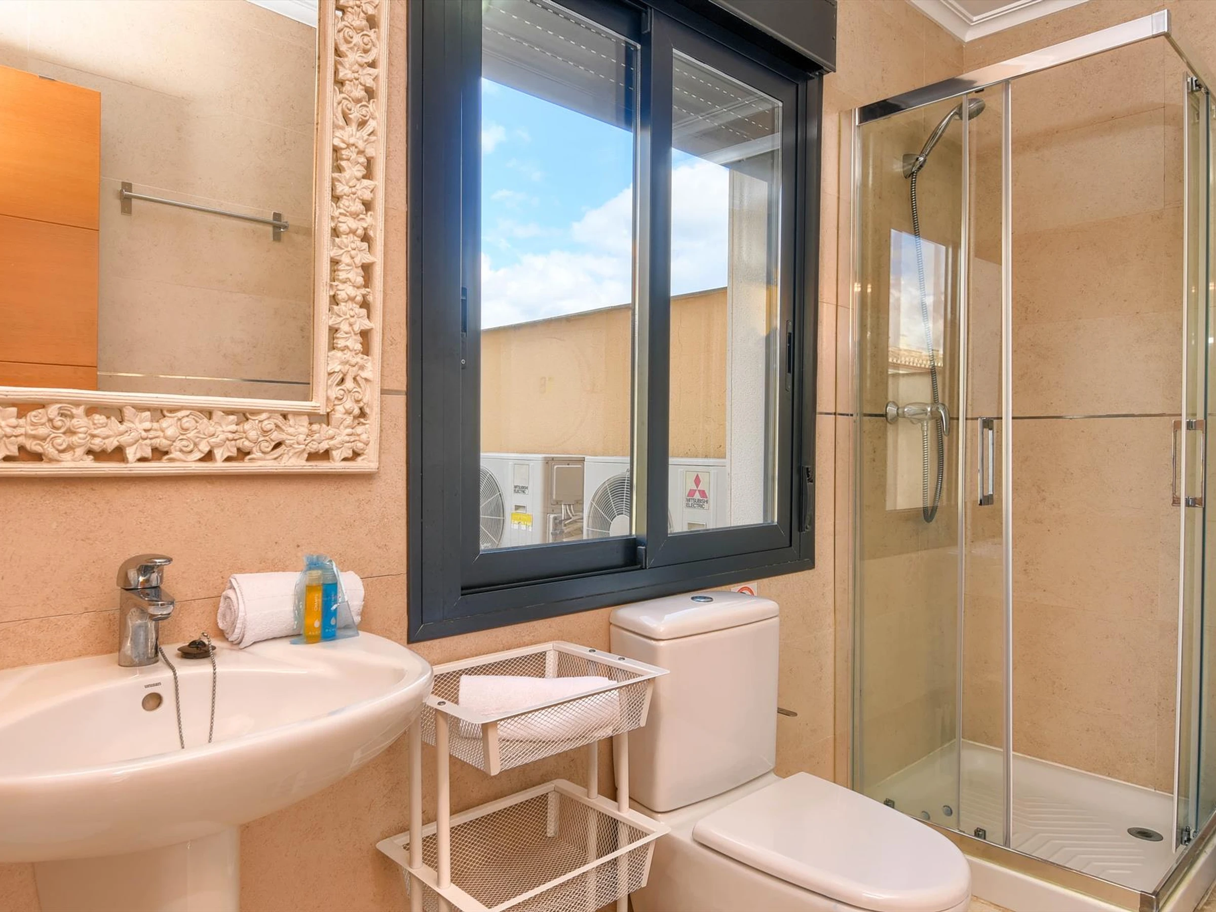 * bathroom with single washbasin, shower and toiletExterior of the apartment