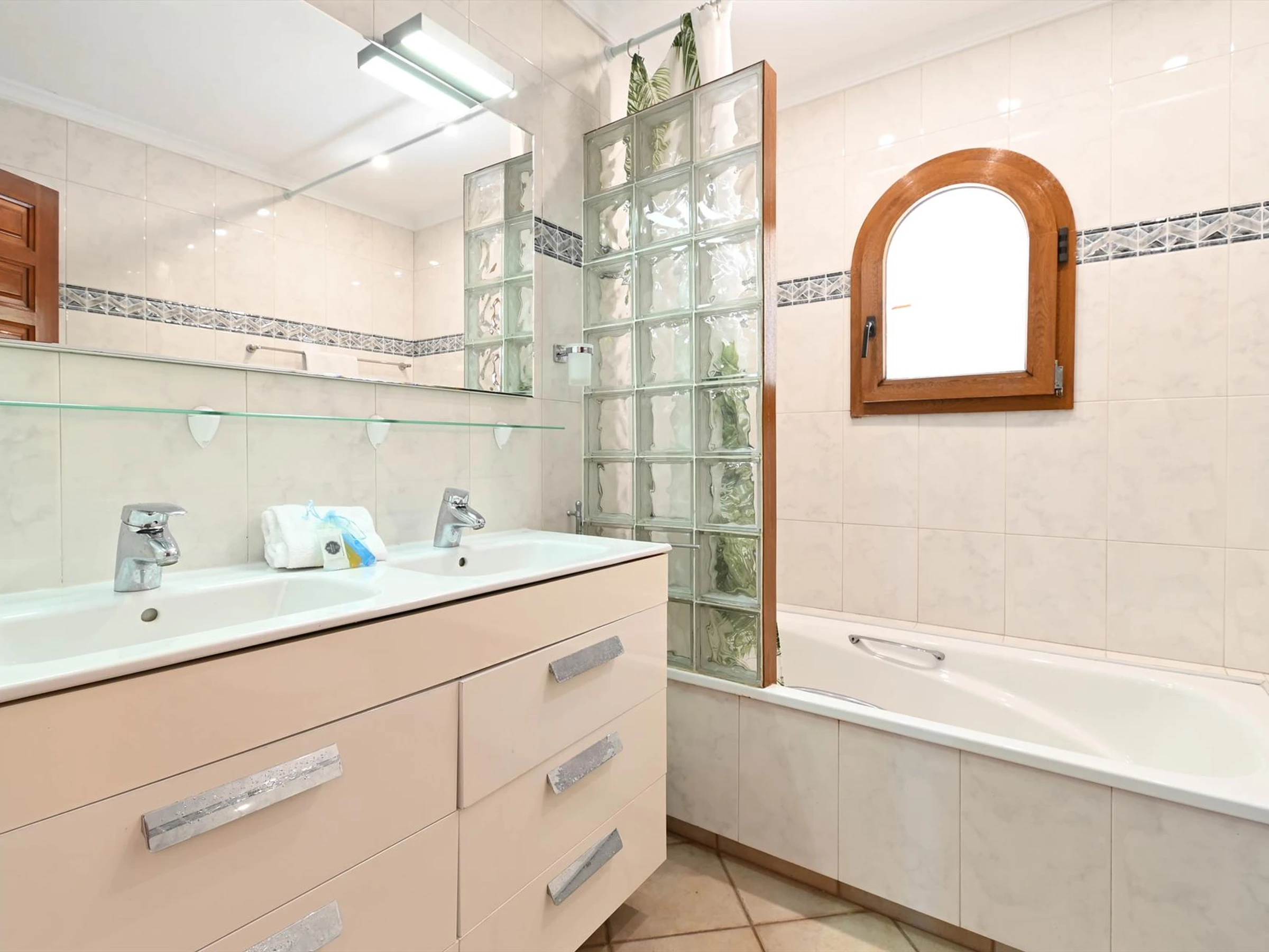 * Bathroom with double washbasin, bath/shower combination and toilet