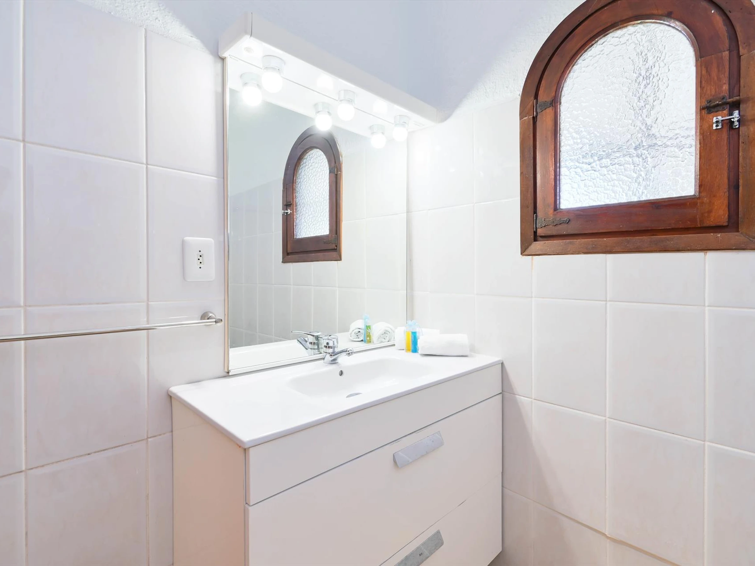 * Bathroom with single washbasin, shower and toilet Exterior of the villa
