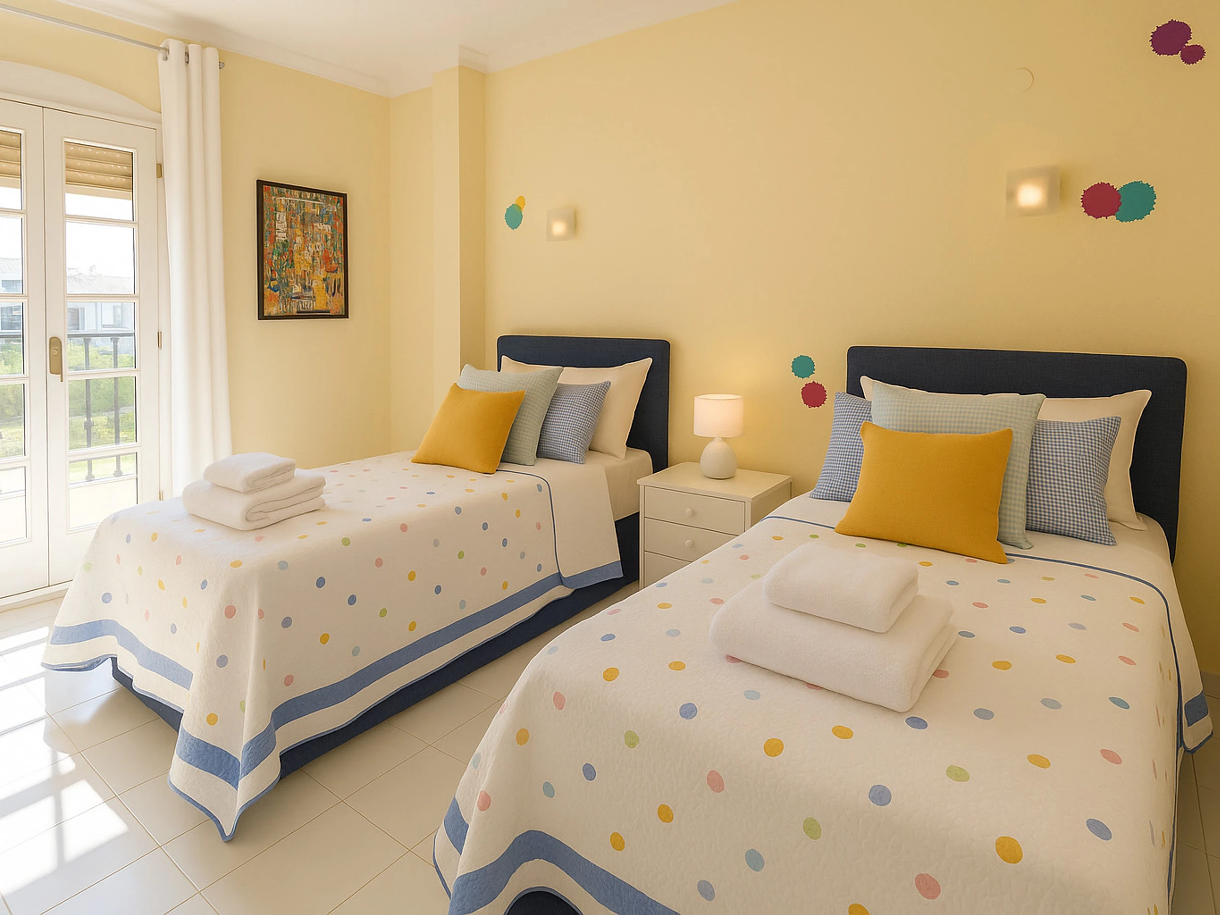Second bedroom with 2 single beds, fan, en-suite bathroom and access to the terrace.