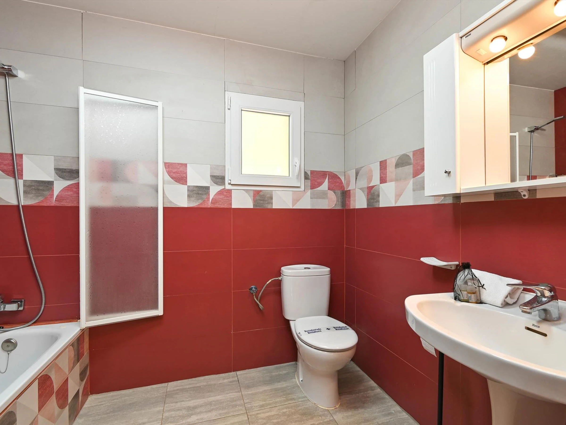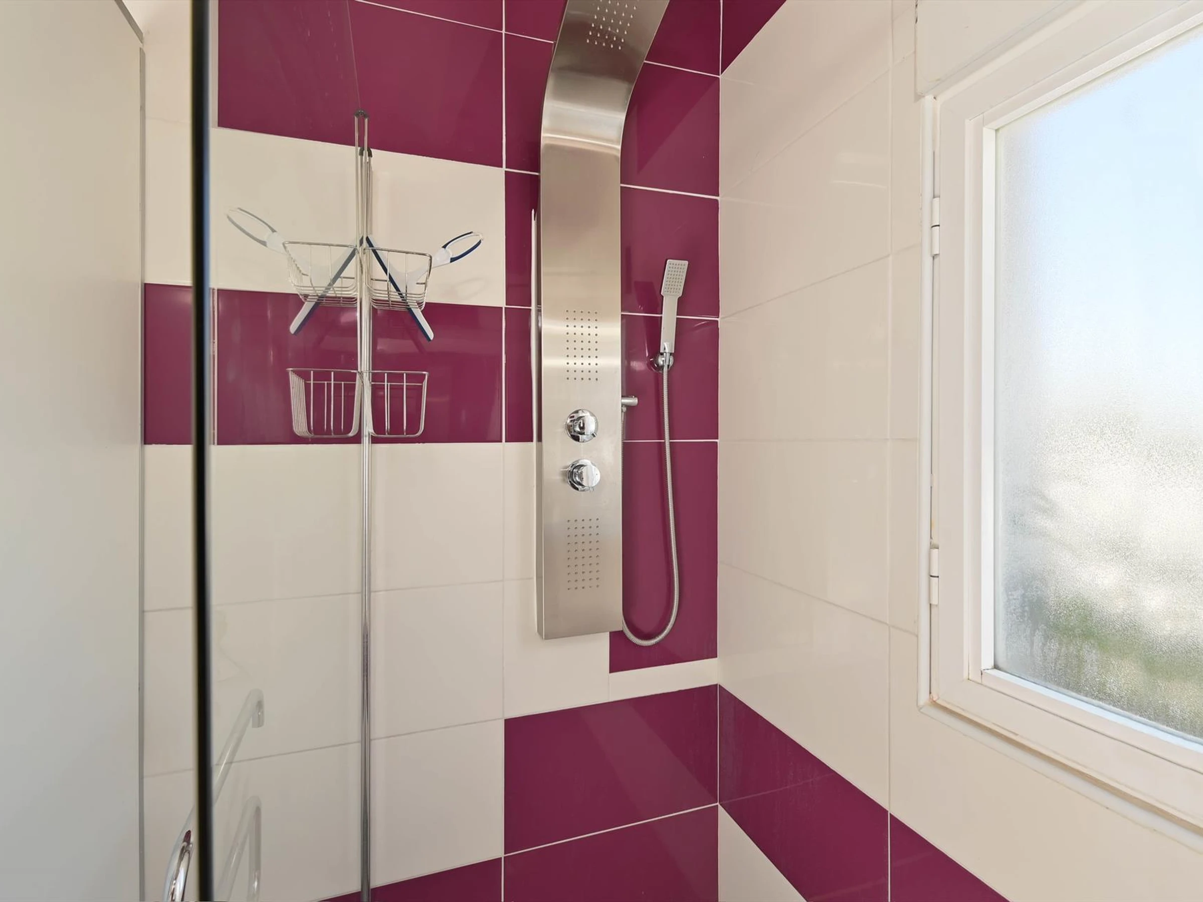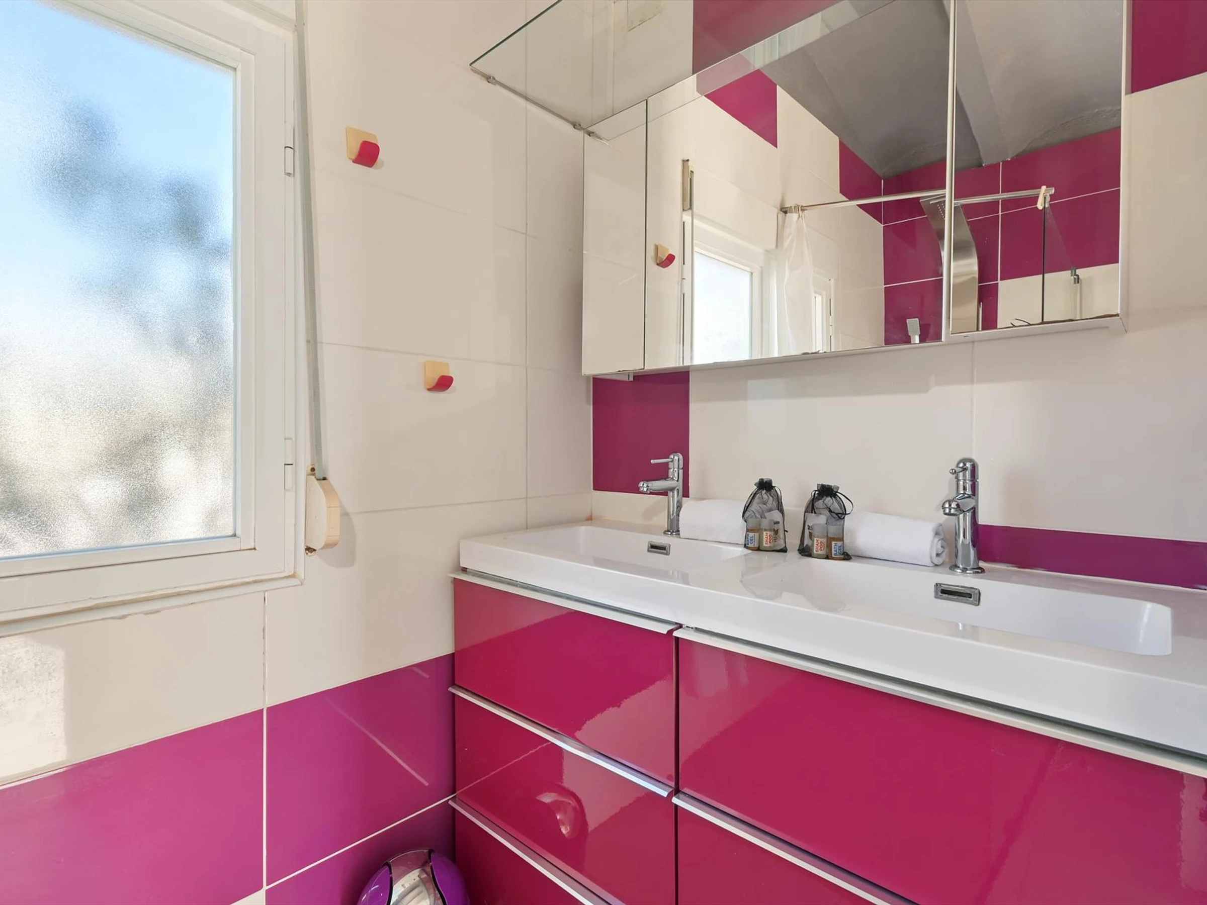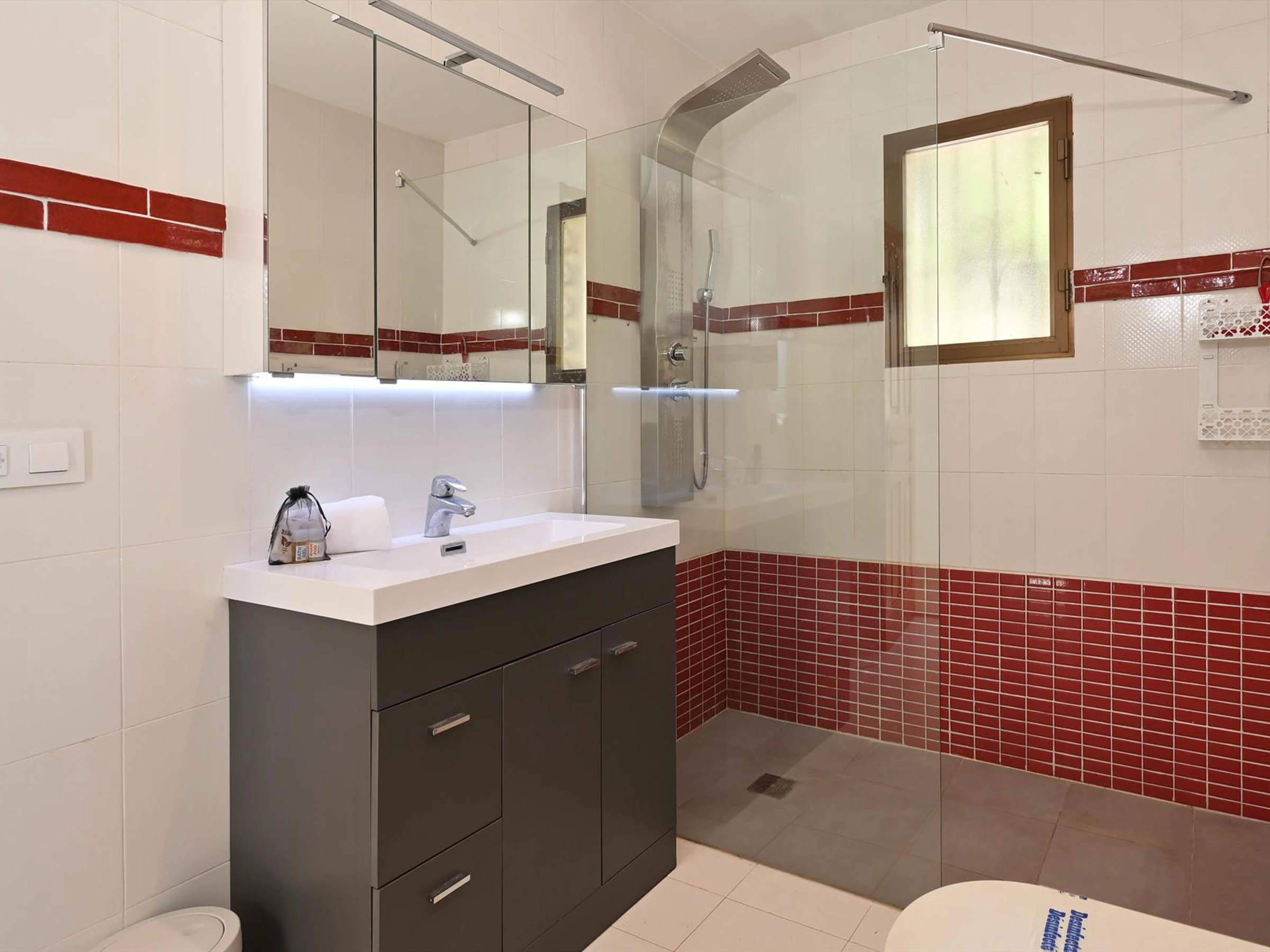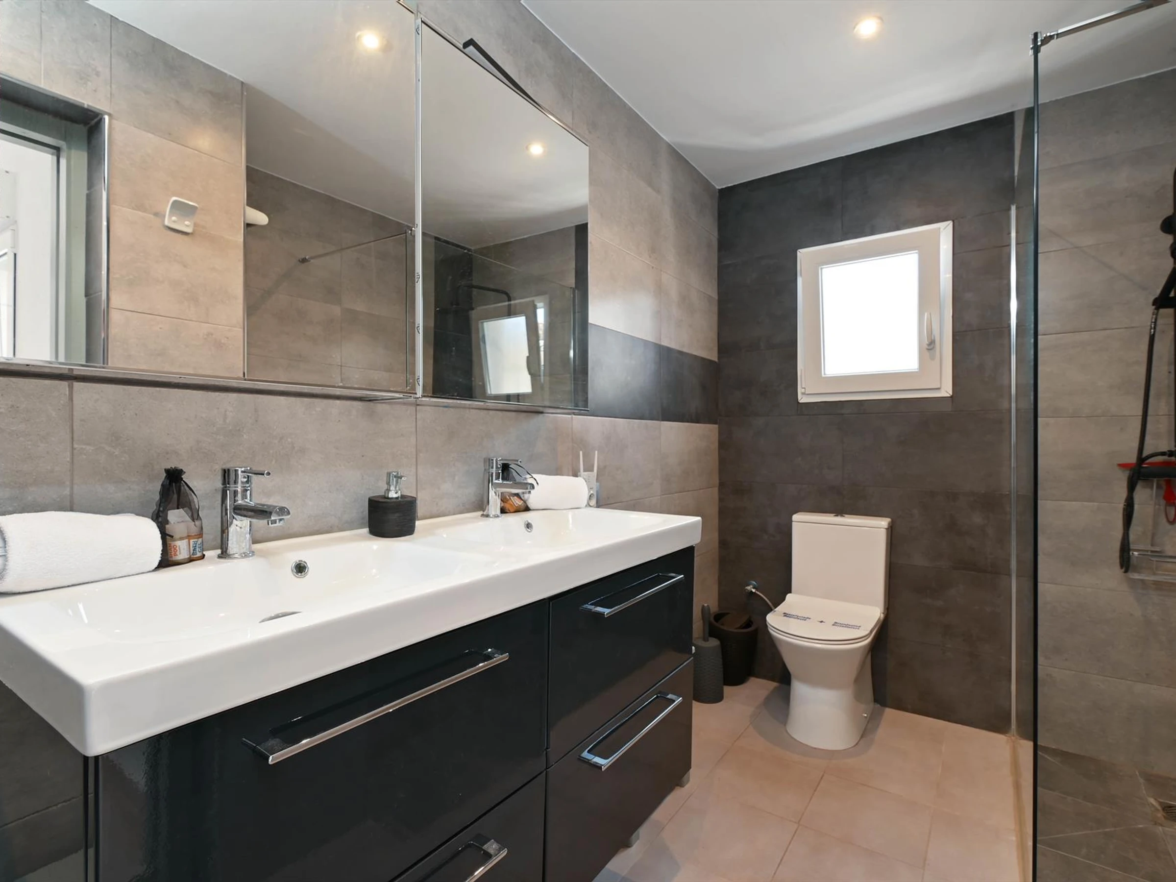 * bathroom with double washbasin, shower, and toiletExterior of the villa