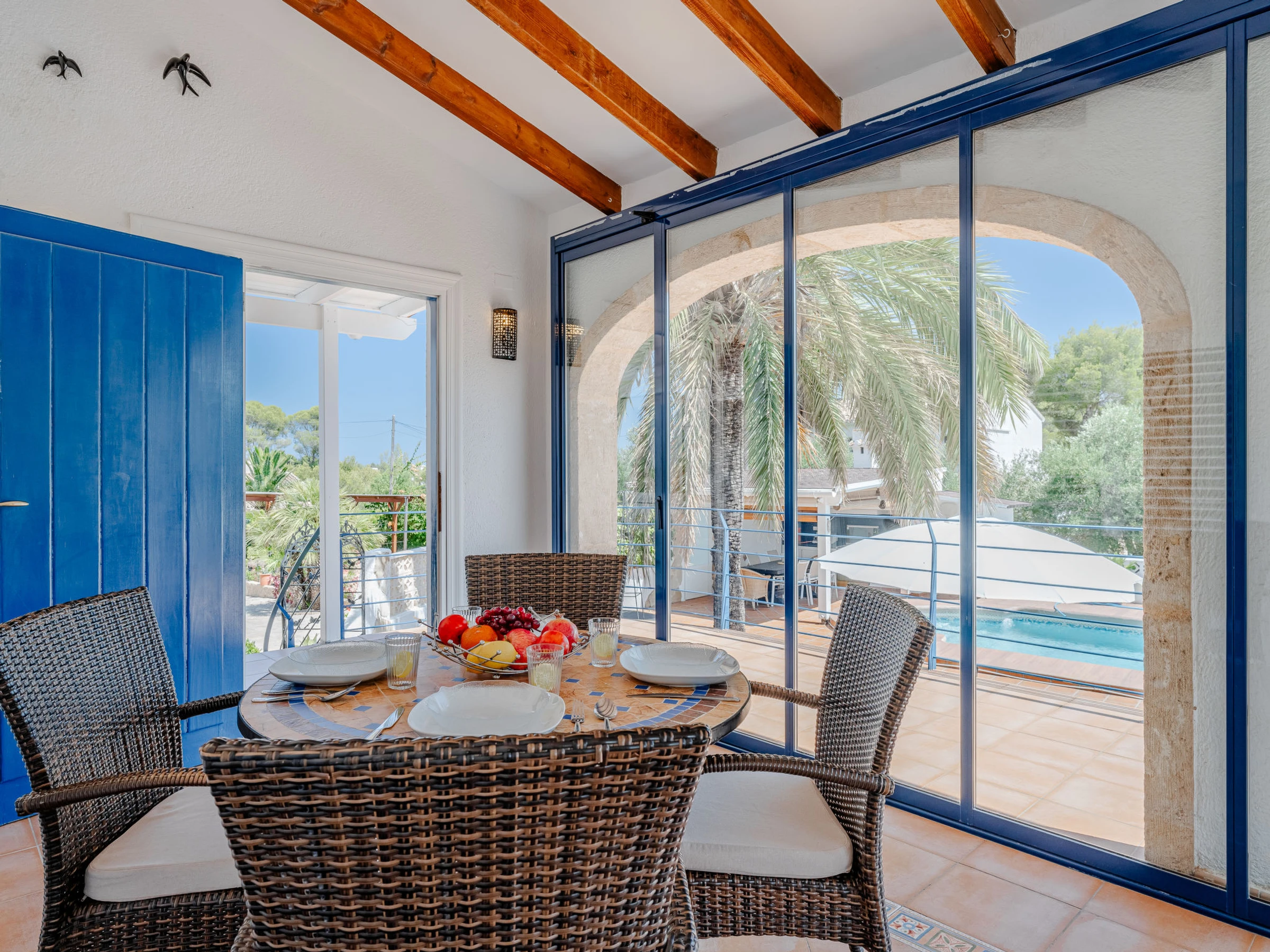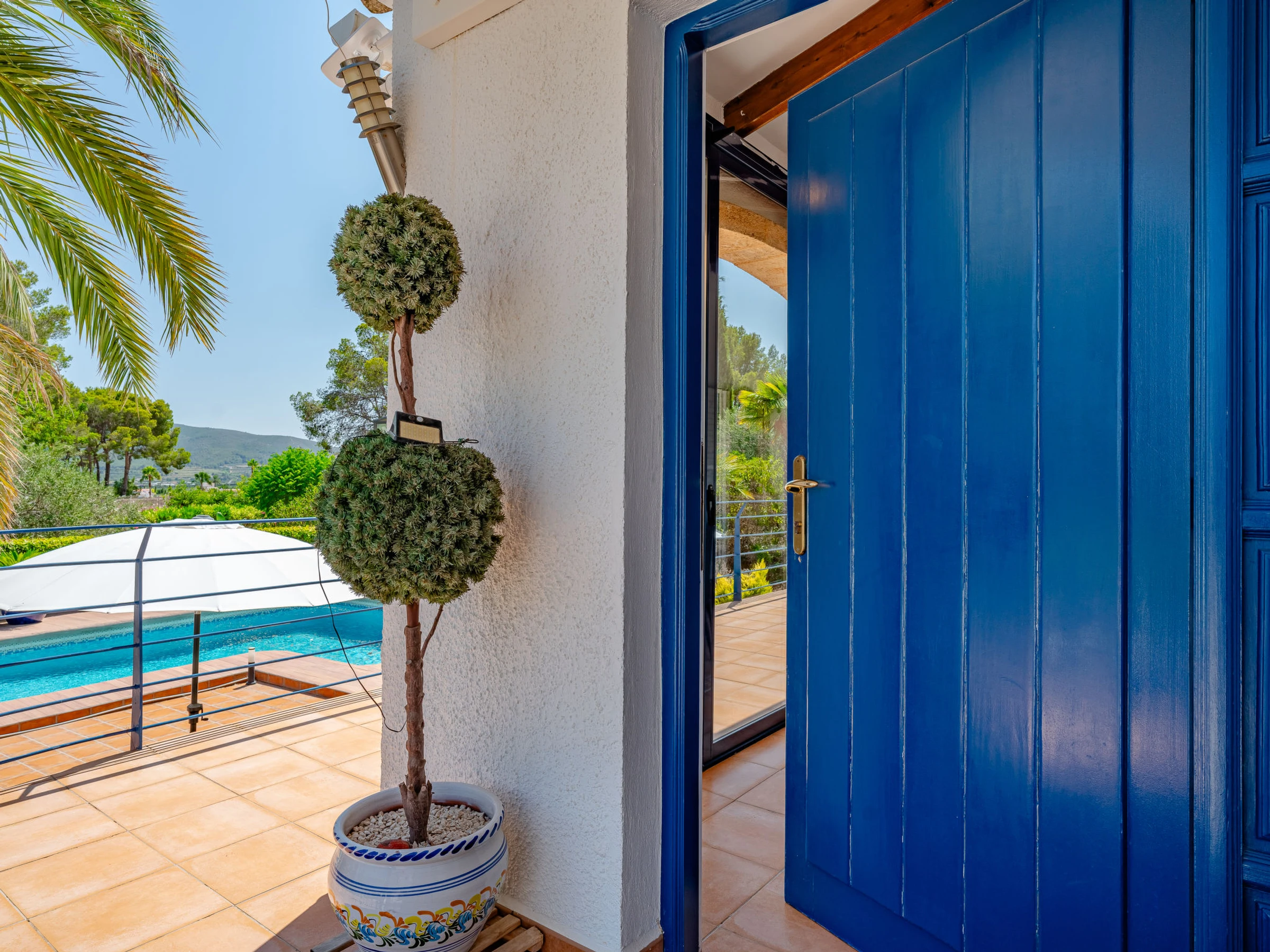 Very large, beautiful house "Baloma Plus". In the district of Montgo Javea, in the resort 3 km from the centre of Javea, in a quiet, sunny position, 5 km from the sea, 5 km from the beach. Private: large, beautiful, well-kept garden (fenced) with lawn and trees, swimming pool angular (5 x 11 m, depth 40 - 220 cm, seasonal availability: [hidden] - [hidden] with internal staircase and salt-electrolysis pool-cleaning system. Outdoor shower, garden furniture, barbecue house, parking. Carport. Supermarket 2 km, restaurant, café 700 m, bus stop 650 m, sandy beach "El Arenal" 6 km, shingle beach "Playa de la Grava" 5 km. Sports harbour 6 km, surf school 6 km, sailing school 6 km, tennis 5.5 km. The owner does not accept any youth groups.