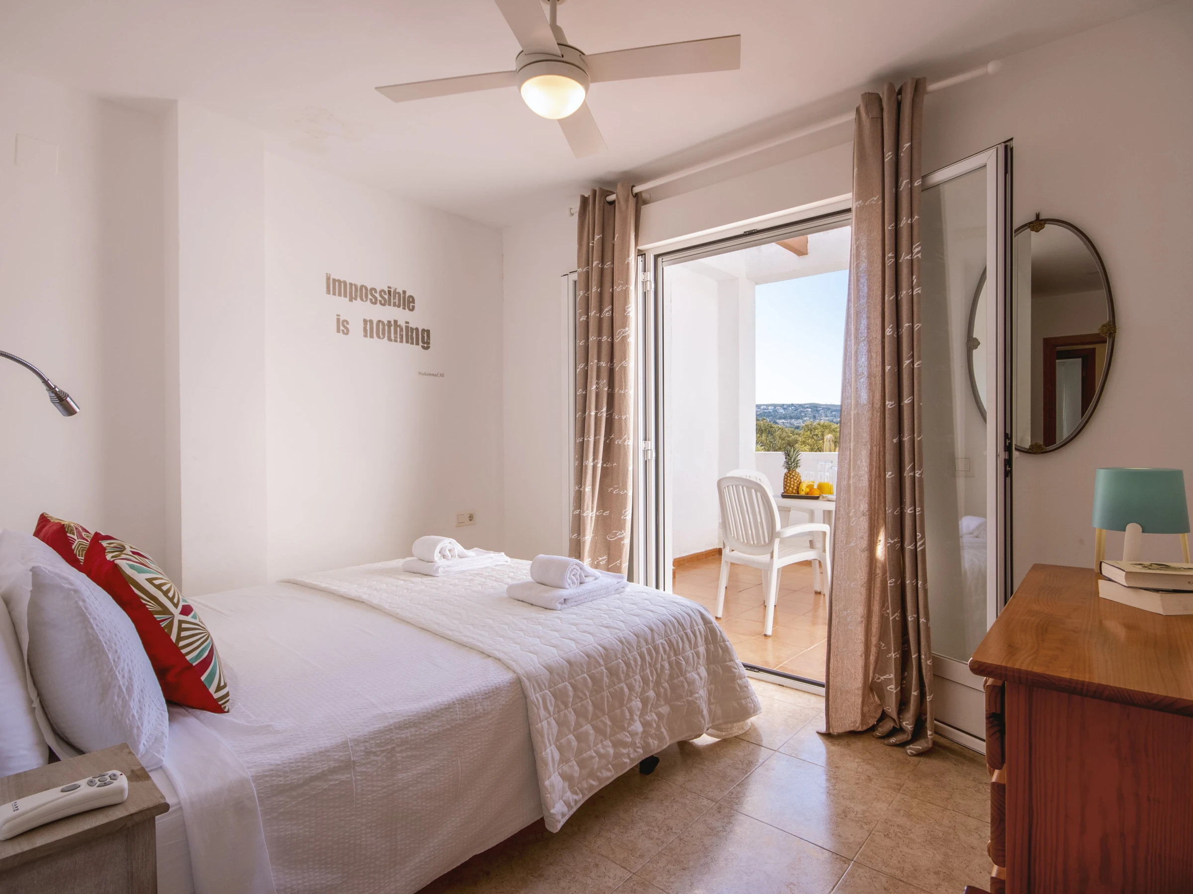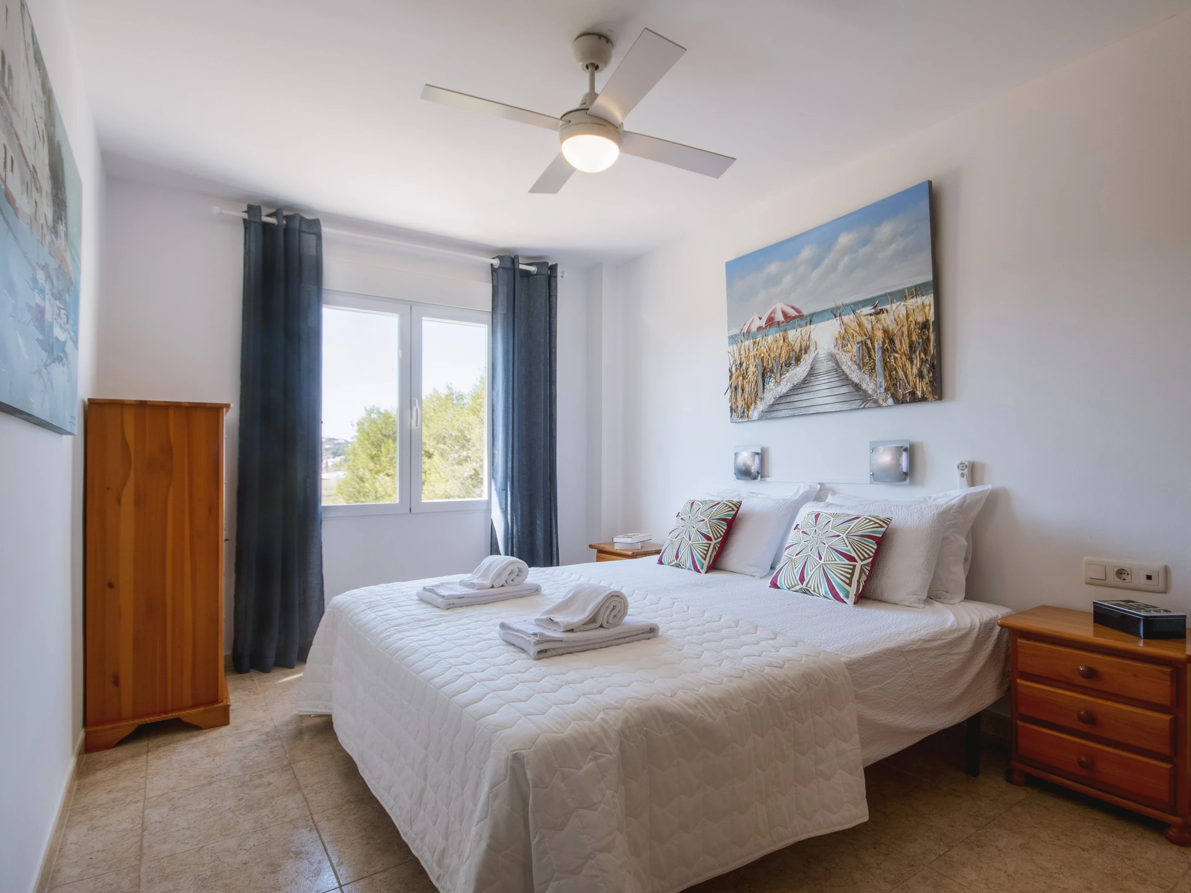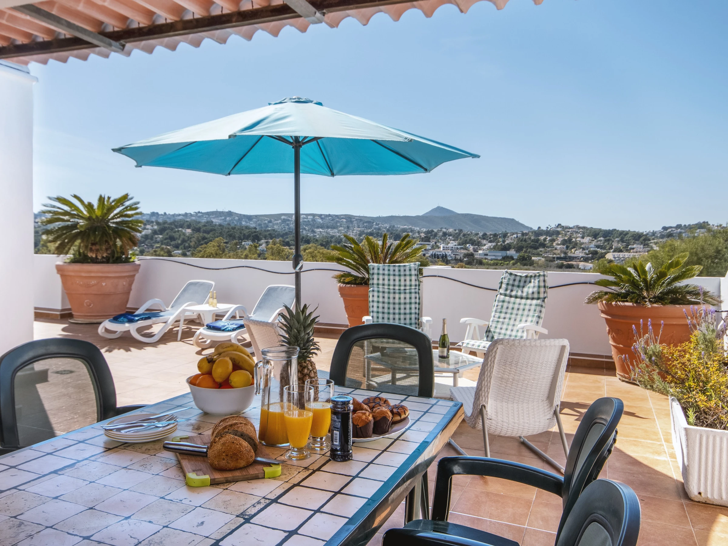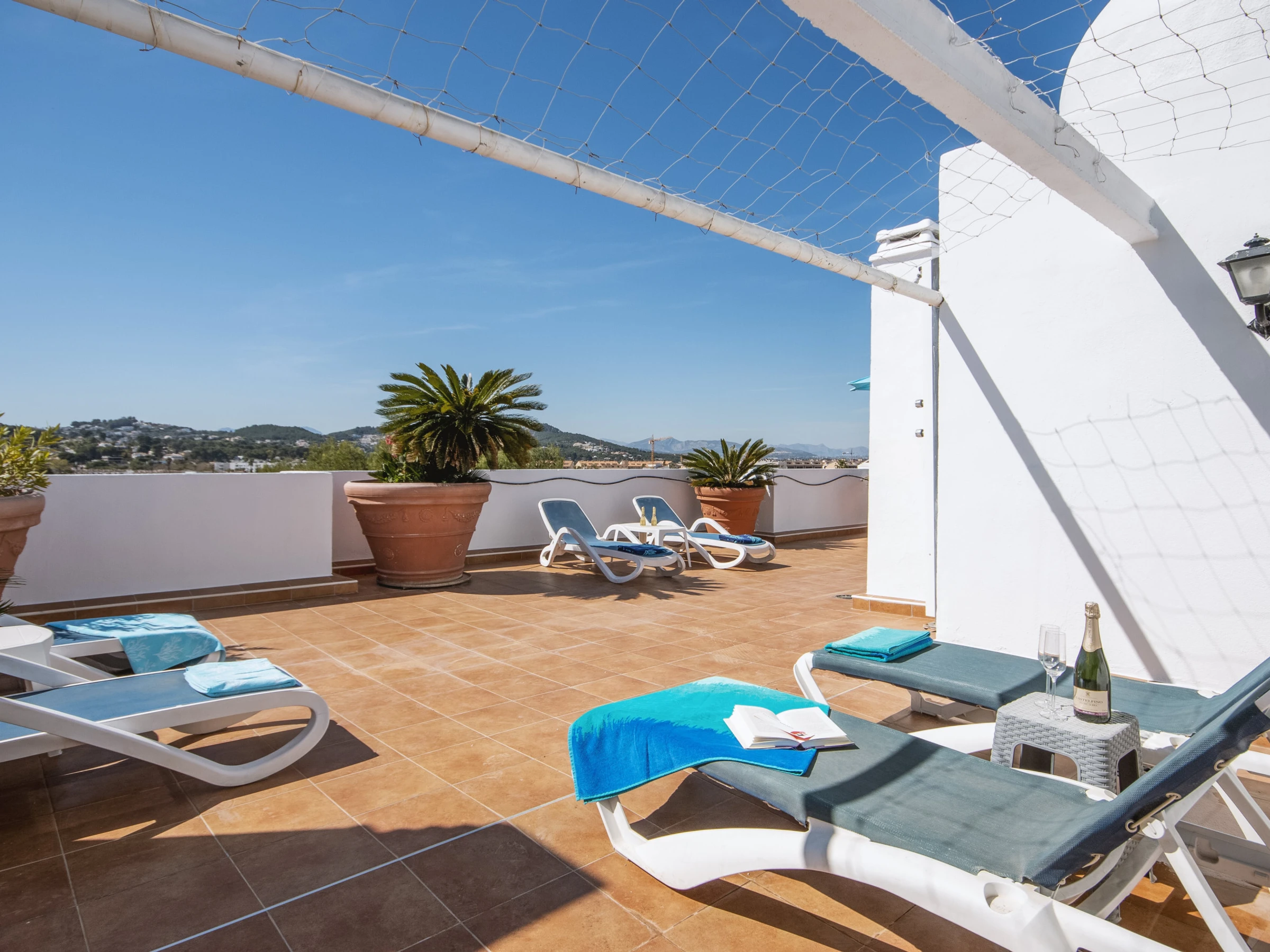 In the apartment itself, the spacious living and dining areas are elegantly furnished and there is a large, conveniently located open-plan kitchen. The bedrooms and bathrooms are on the same level, two of the bedrooms have the same magnificent views as the living room and terrace. Note: air conditioning is only available in the living room. Modern ceiling fans for the bedrooms.