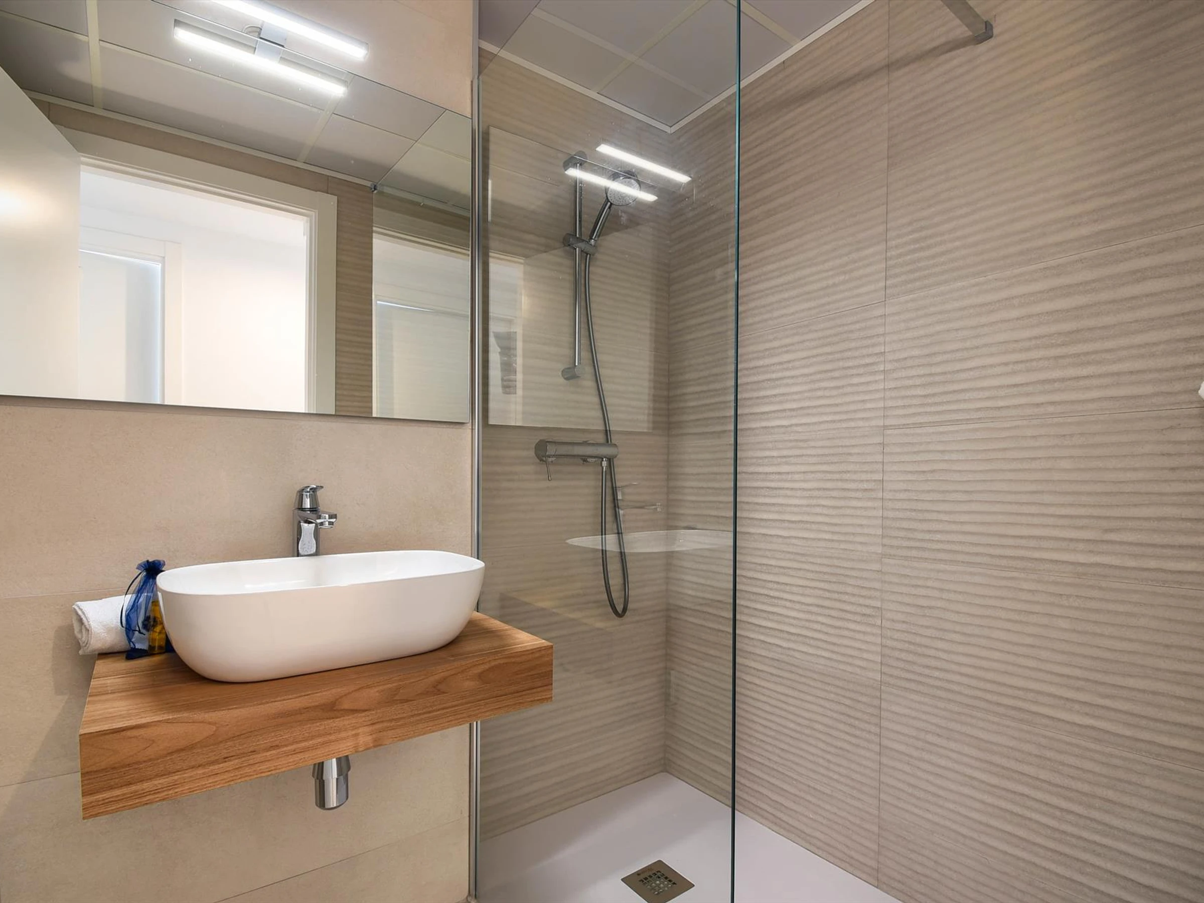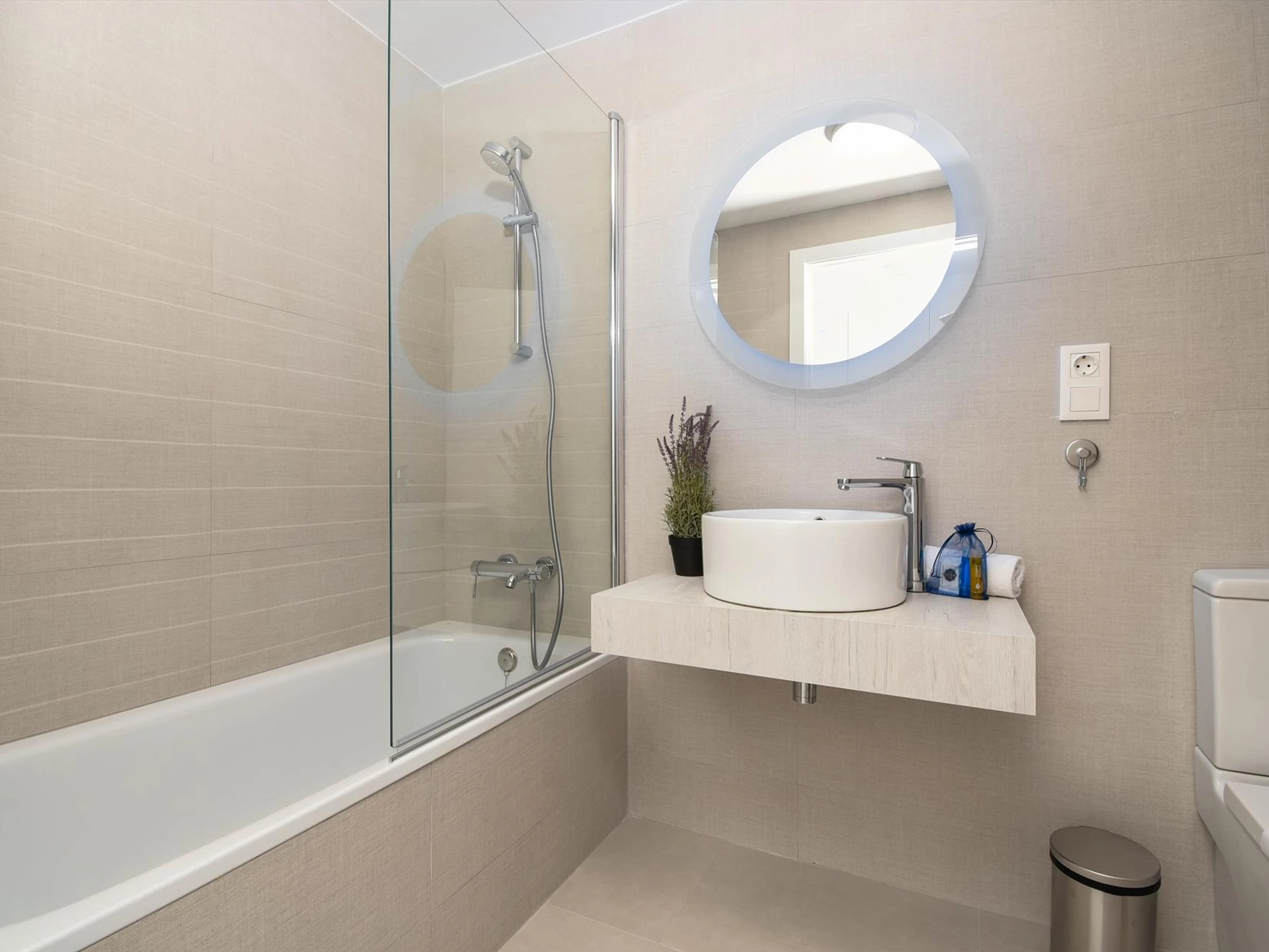 * bathroom with single washbasin, shower and toiletExterior of the apartment