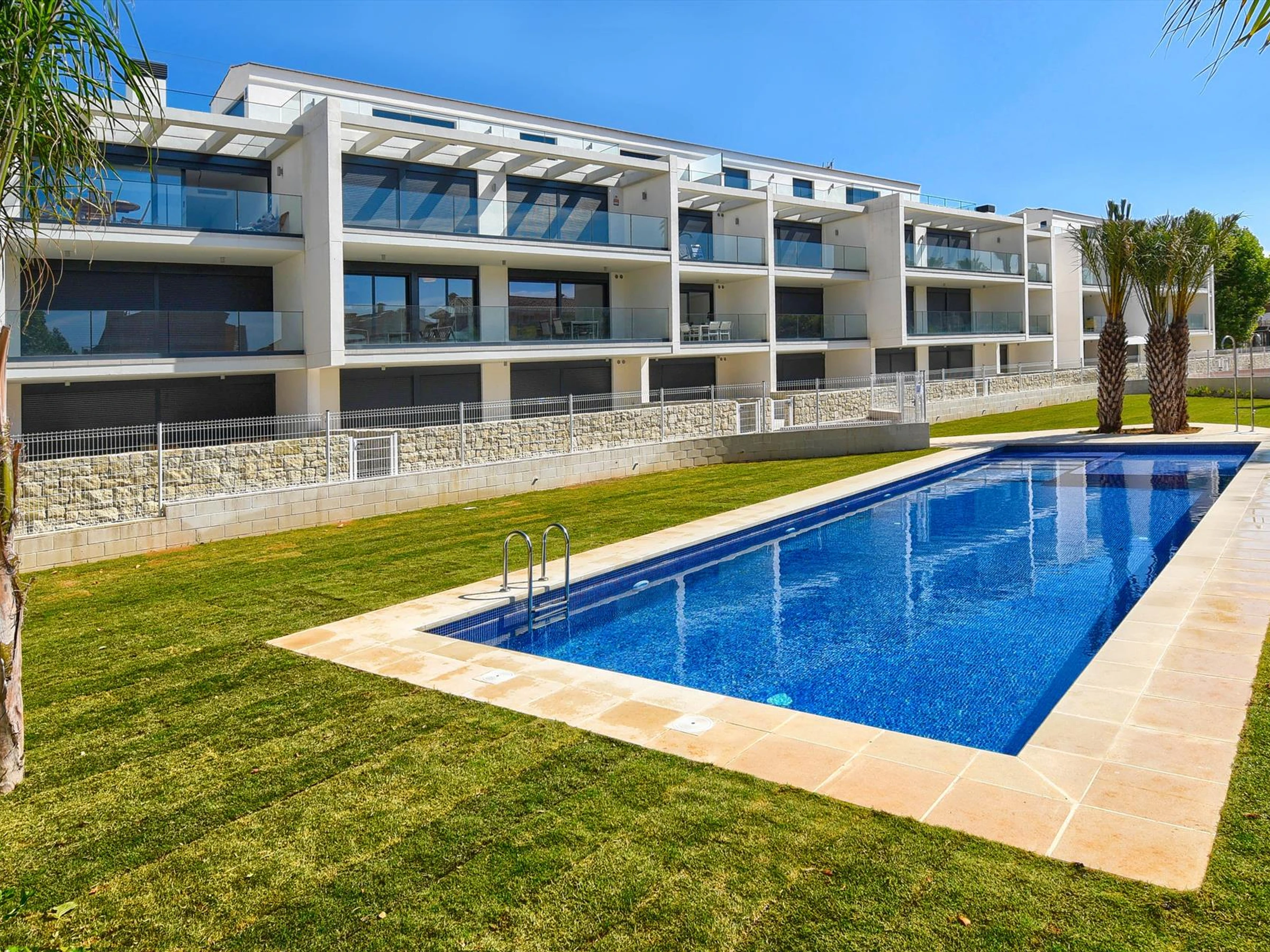 of privacy, a lawned communal garden with trees and wonderful views of the pool