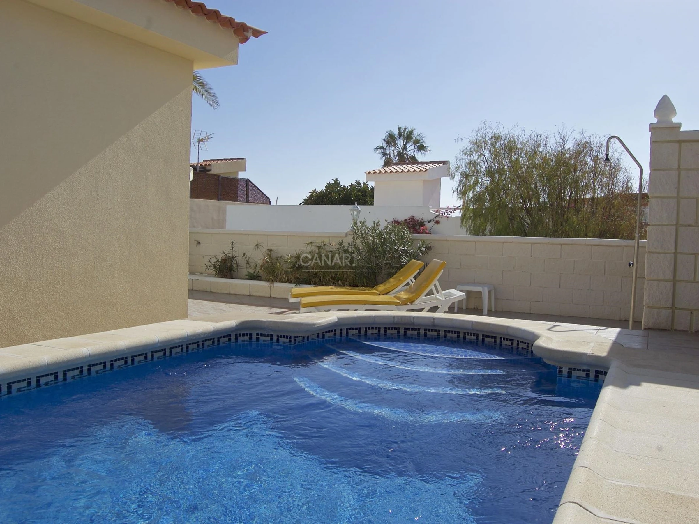 Es una villa muy cómoda de una sola planta y cuenta con piscina privada y terraza con vistas al mar y a la Gomera.
