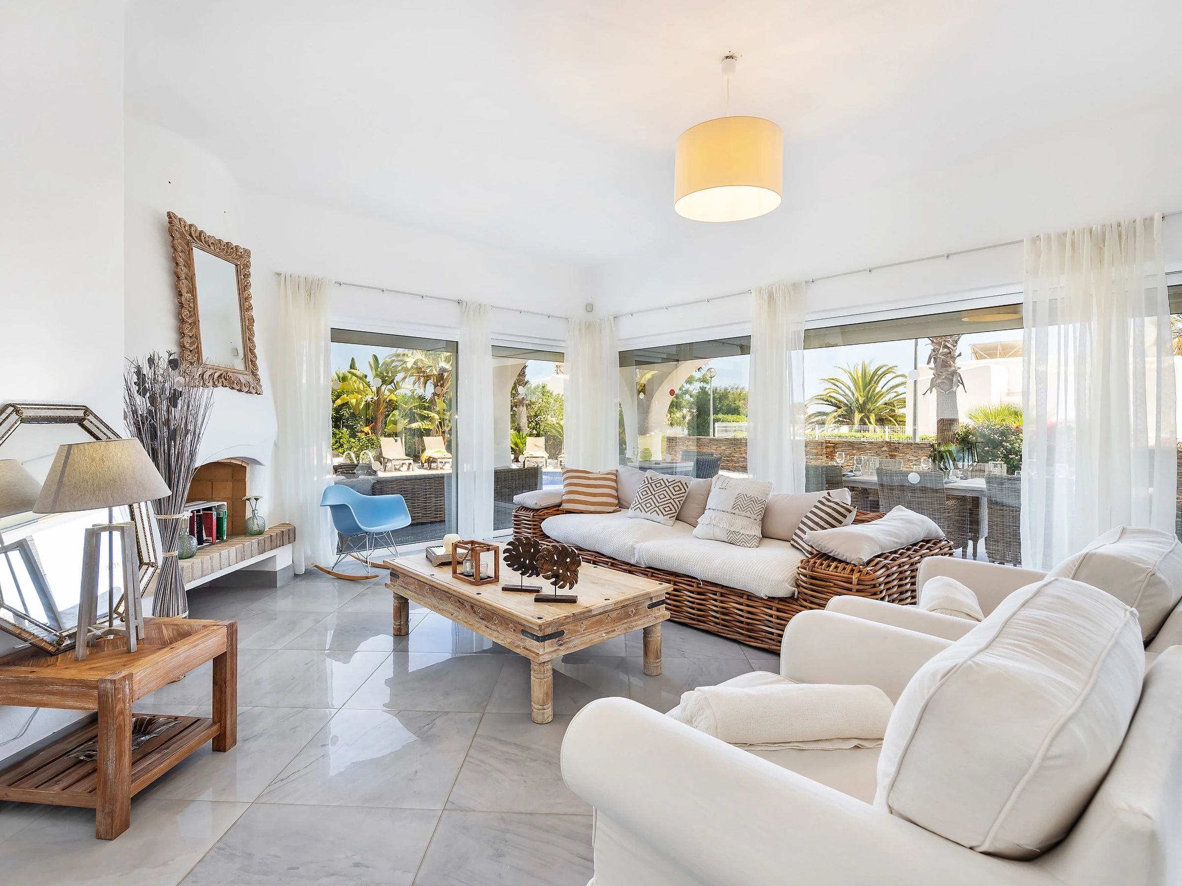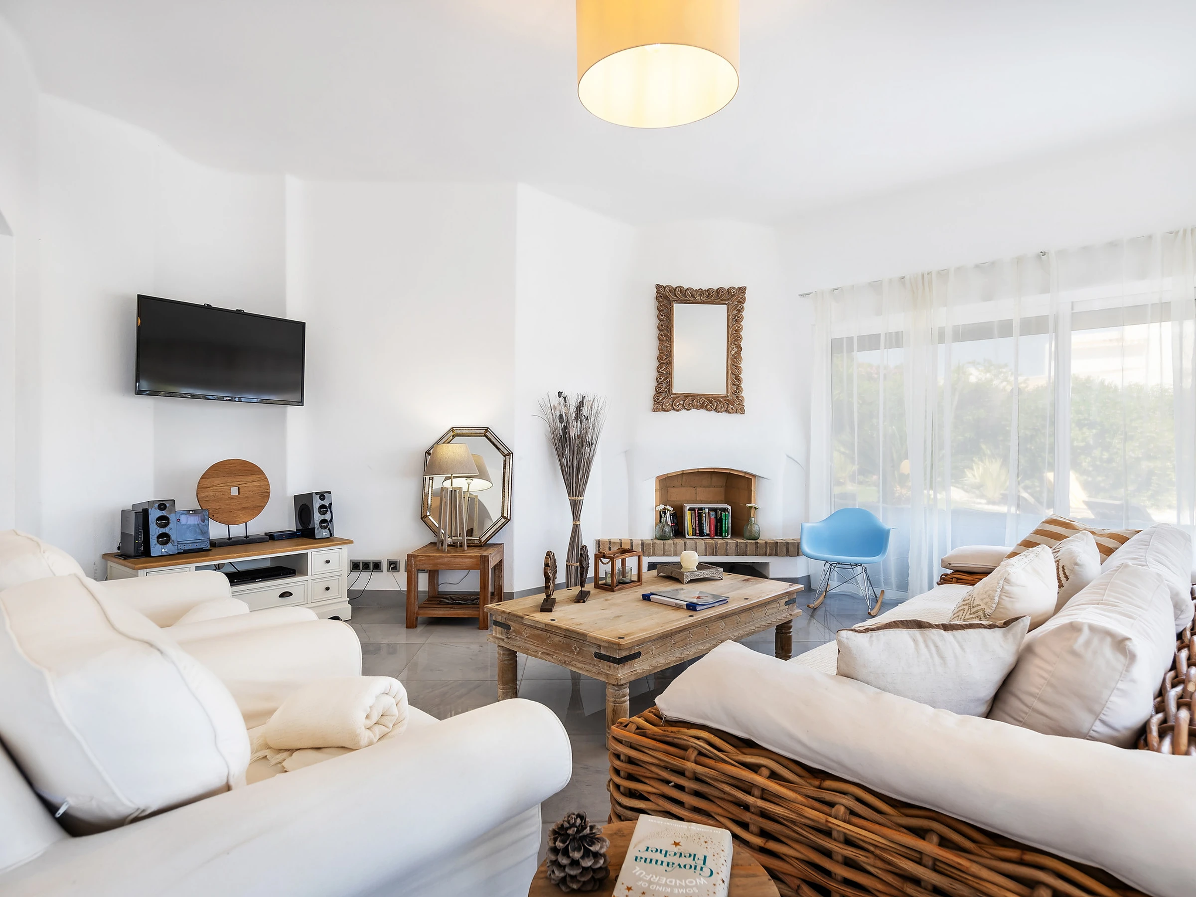 The large living room is very comfortable with a fireplace, equipped with LCD TV, foreign television channels, internet and has access to the outdoor dining area, barbecue, swimming pool and garden.
