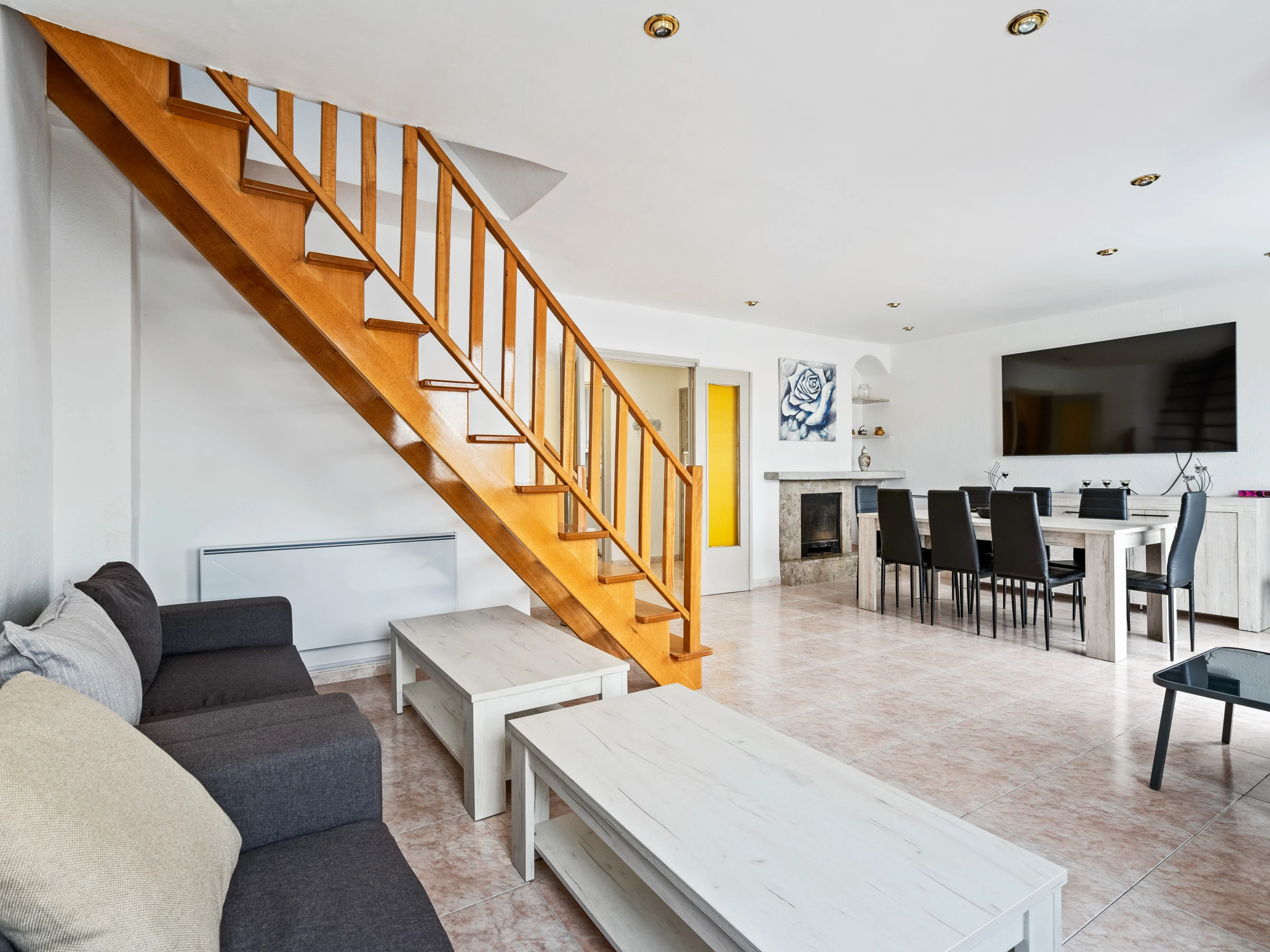 El amplio y luminoso salón ofrece un acogedor espacio de comedor, equipado con un gran sofá y una Smart TV, perfecto para relajarte después de un día explorando la zona.