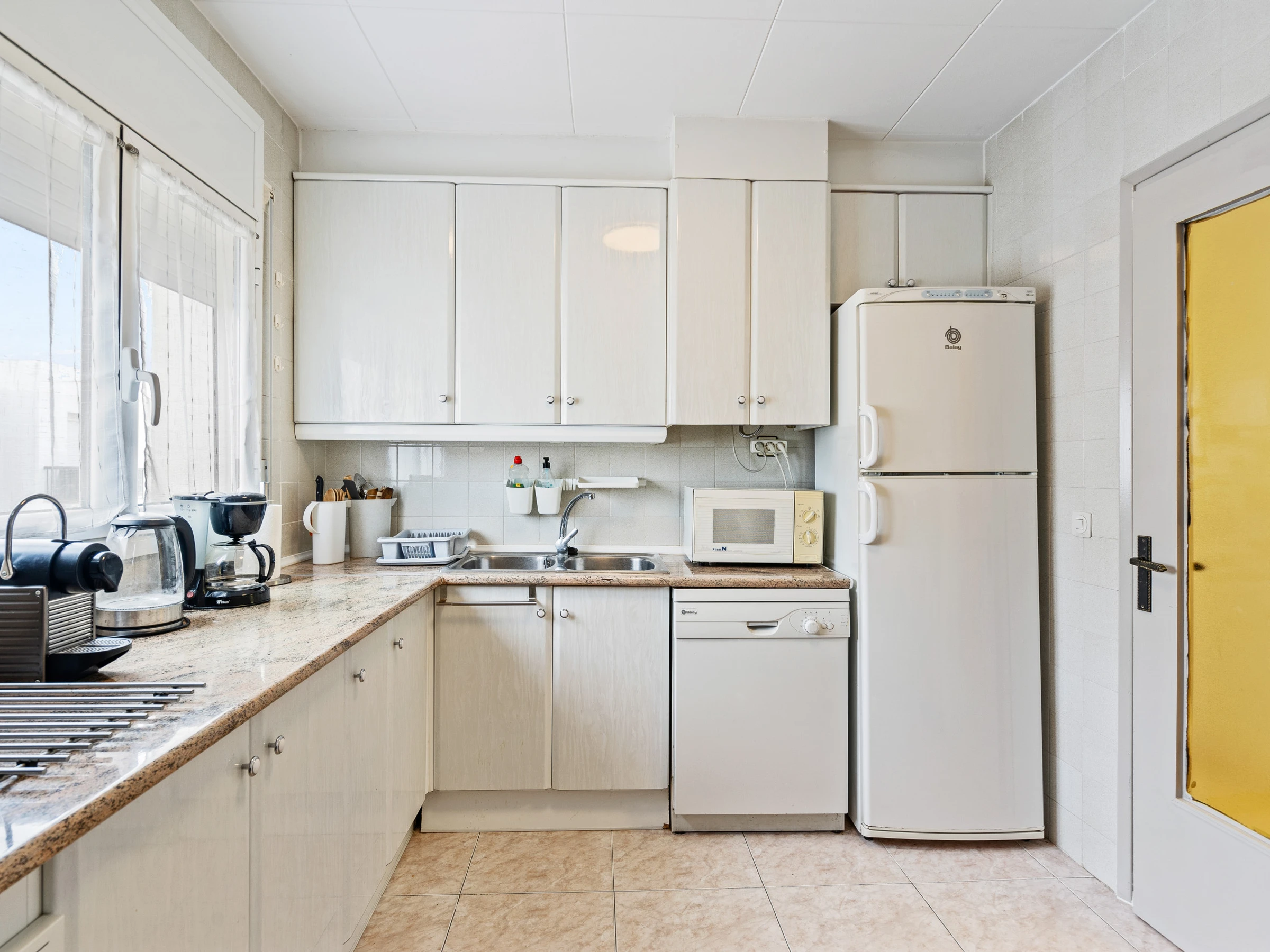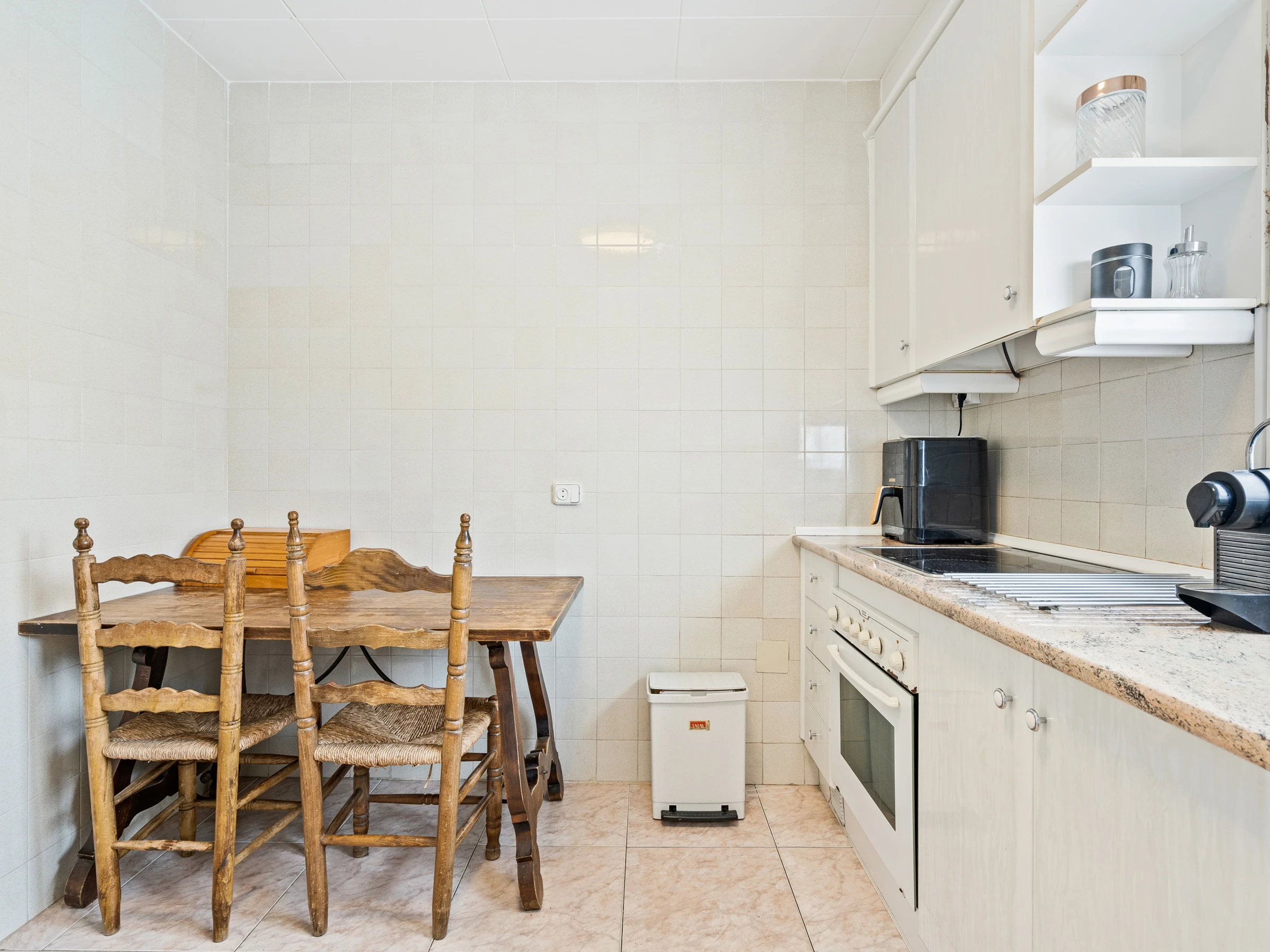 La cocina está completamente equipada con todo lo necesario para preparar tus platos favoritos, incluyendo nevera, hervidor de agua, vitrocerámica, horno, tostadora, cafetera y microondas. Además, cuenta con un lavavajillas para mayor comodidad.