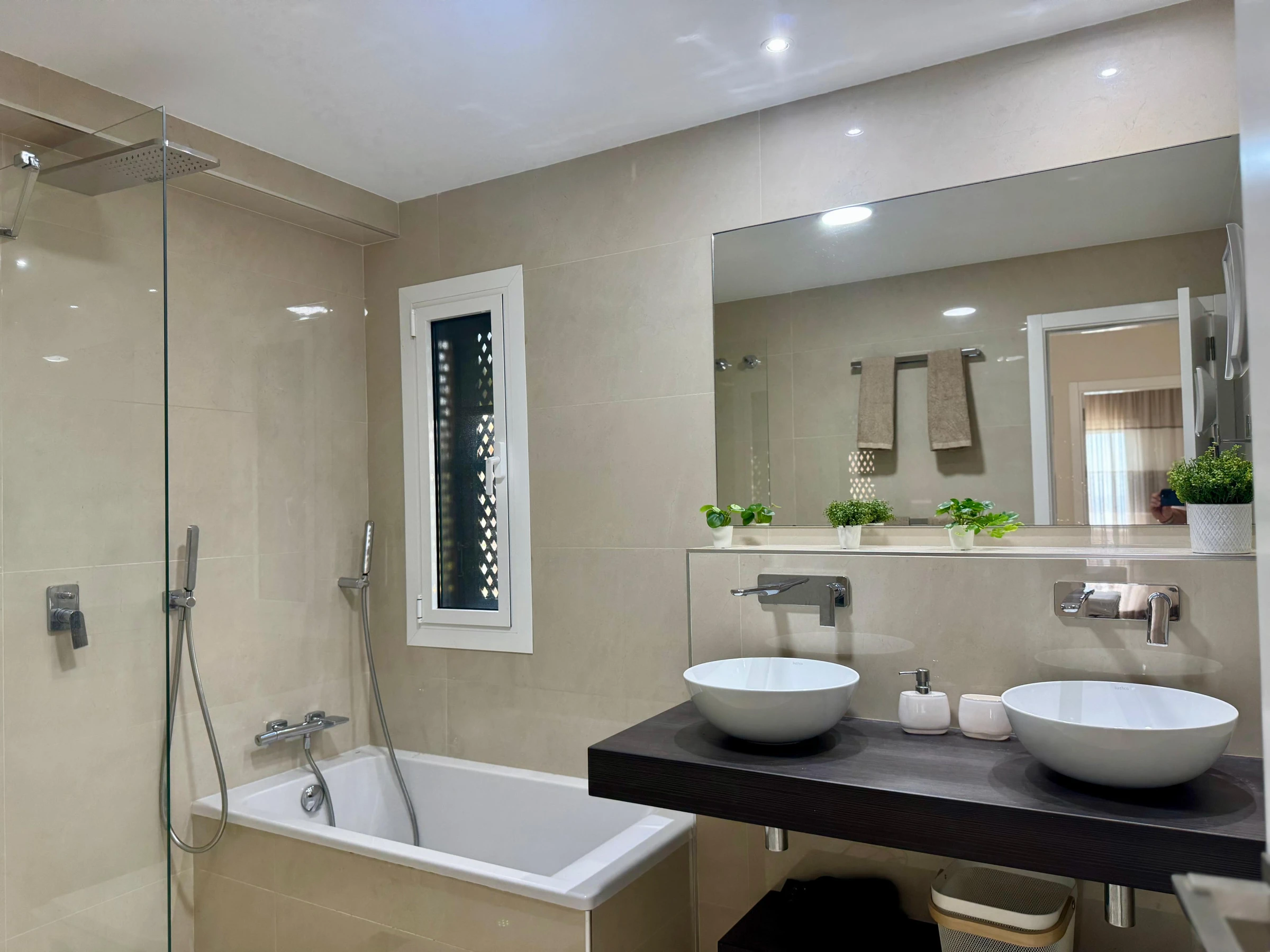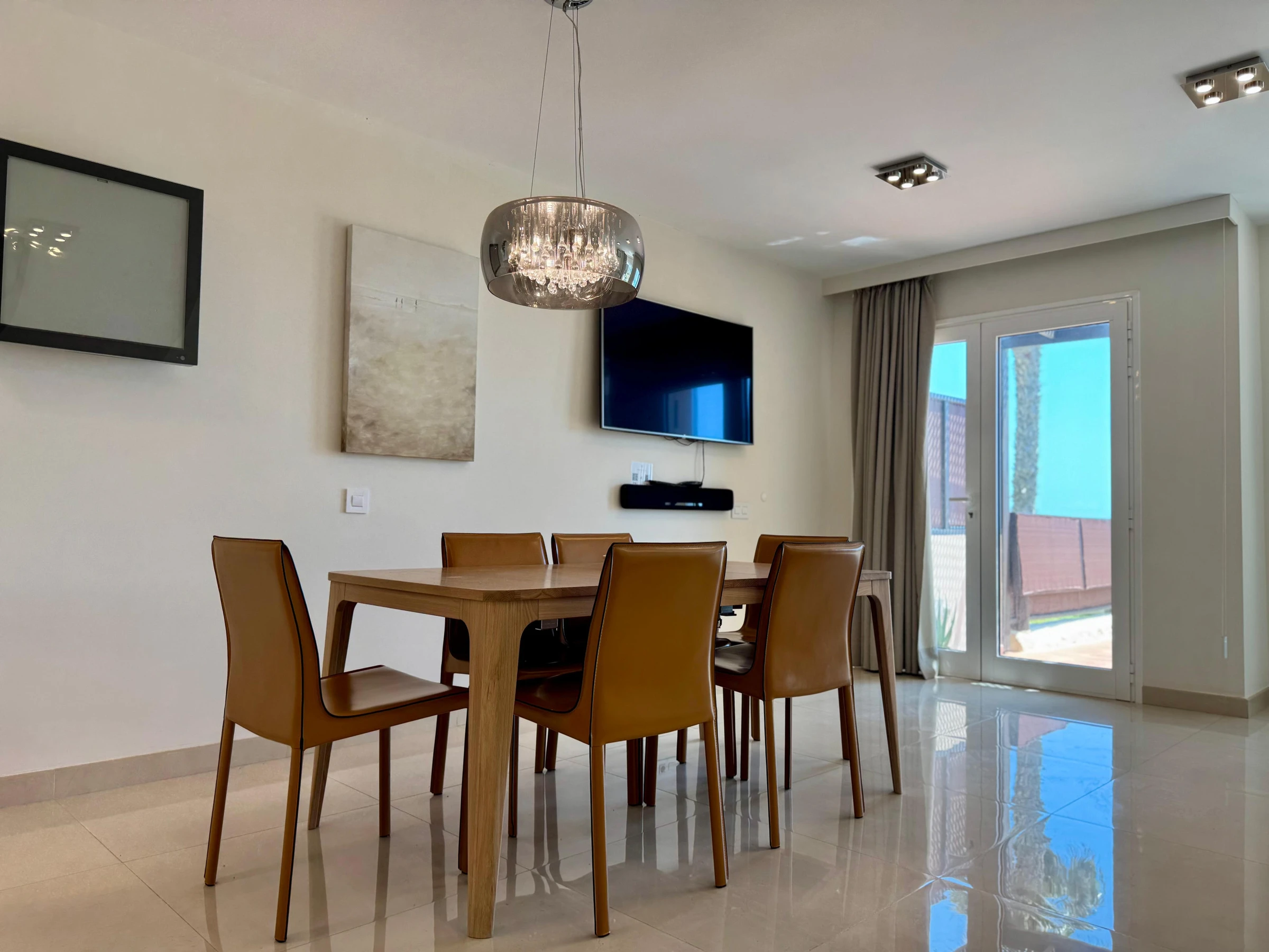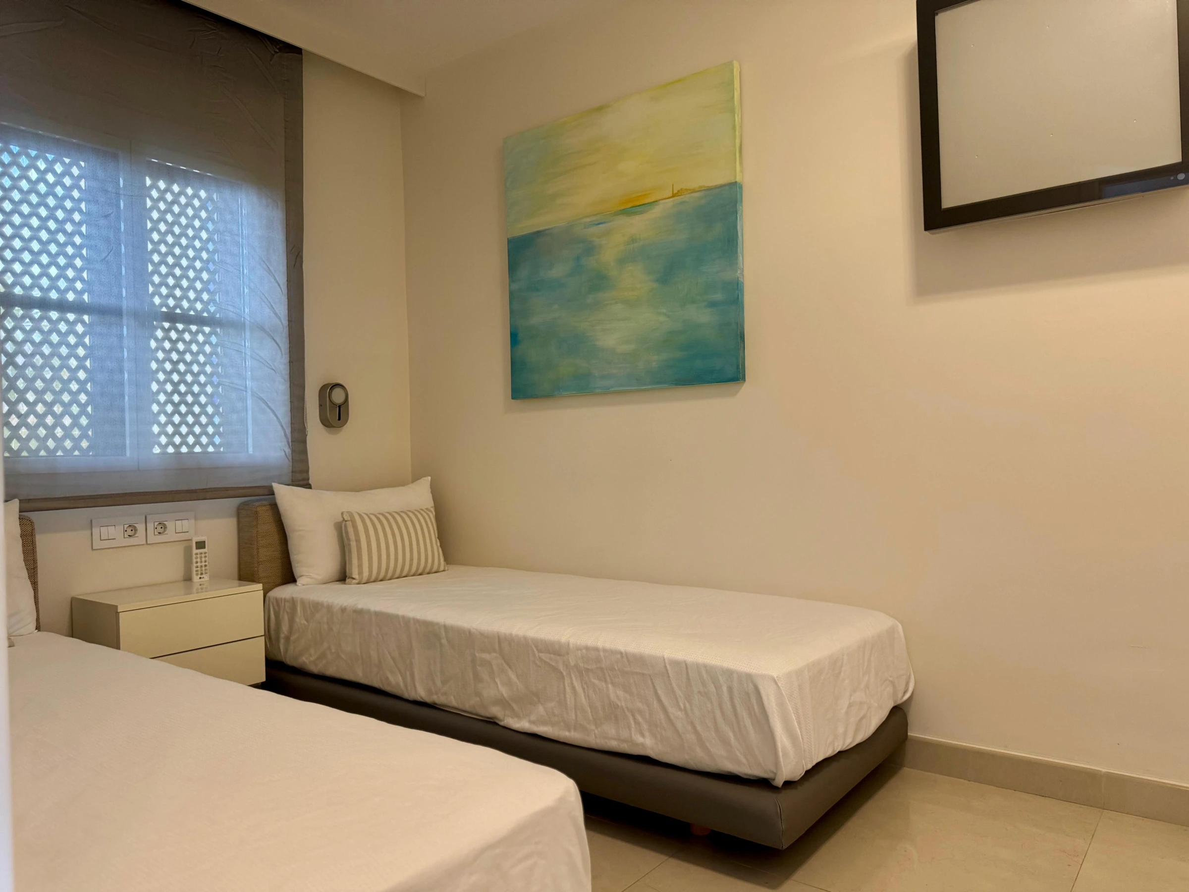 Dispone de jardín, mobiliario jardín, parcela vallada, 50 m² de terraza, lavadora, plancha, acceso internet (wifi), secador, balcón, aire acondicionado en todo el alojamiento, piscina privada, parking aire libre en mismo edificio, 3 Televisores.