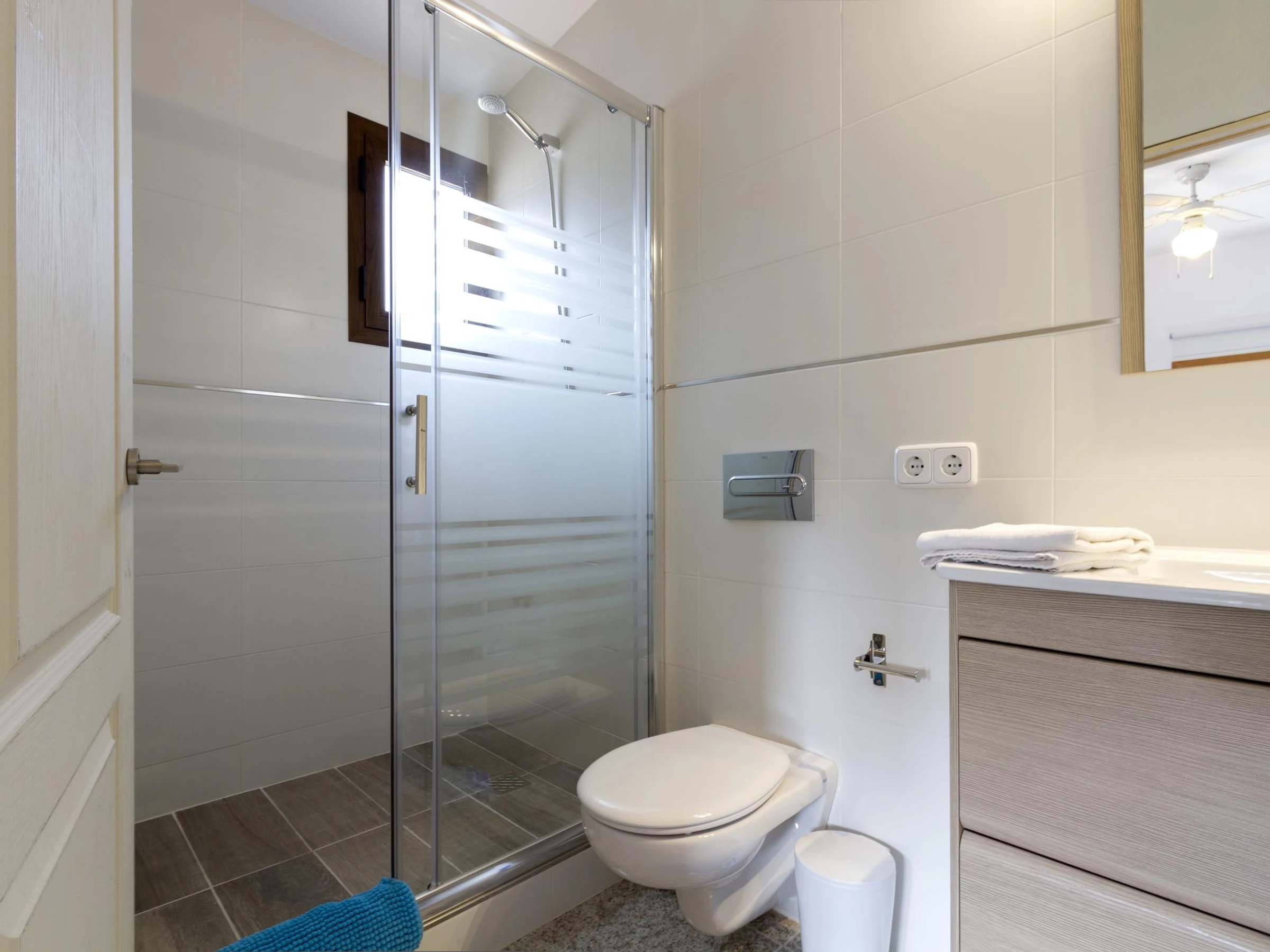 En la planta superior hay cuatro habitaciones y tres baños más. Concretamente, hay dos habitaciones de matrimonio que disponen de un baño en suite cada una de ellas, y dos habitaciones dobles que comparten un baño. Todas las habitaciones de disponen de aire acondicionado.