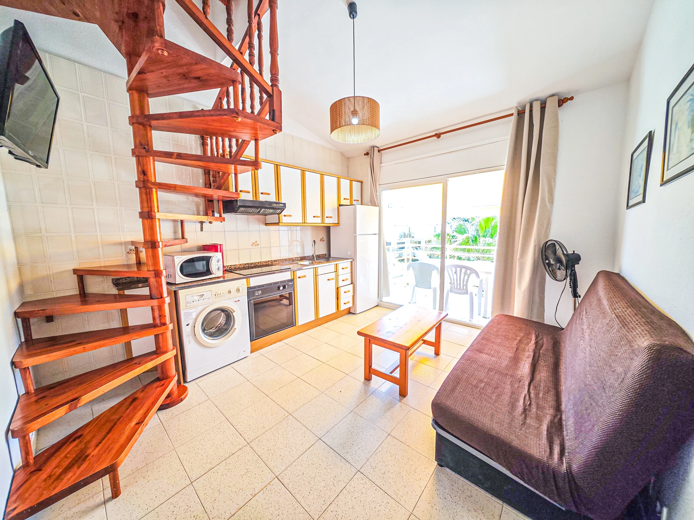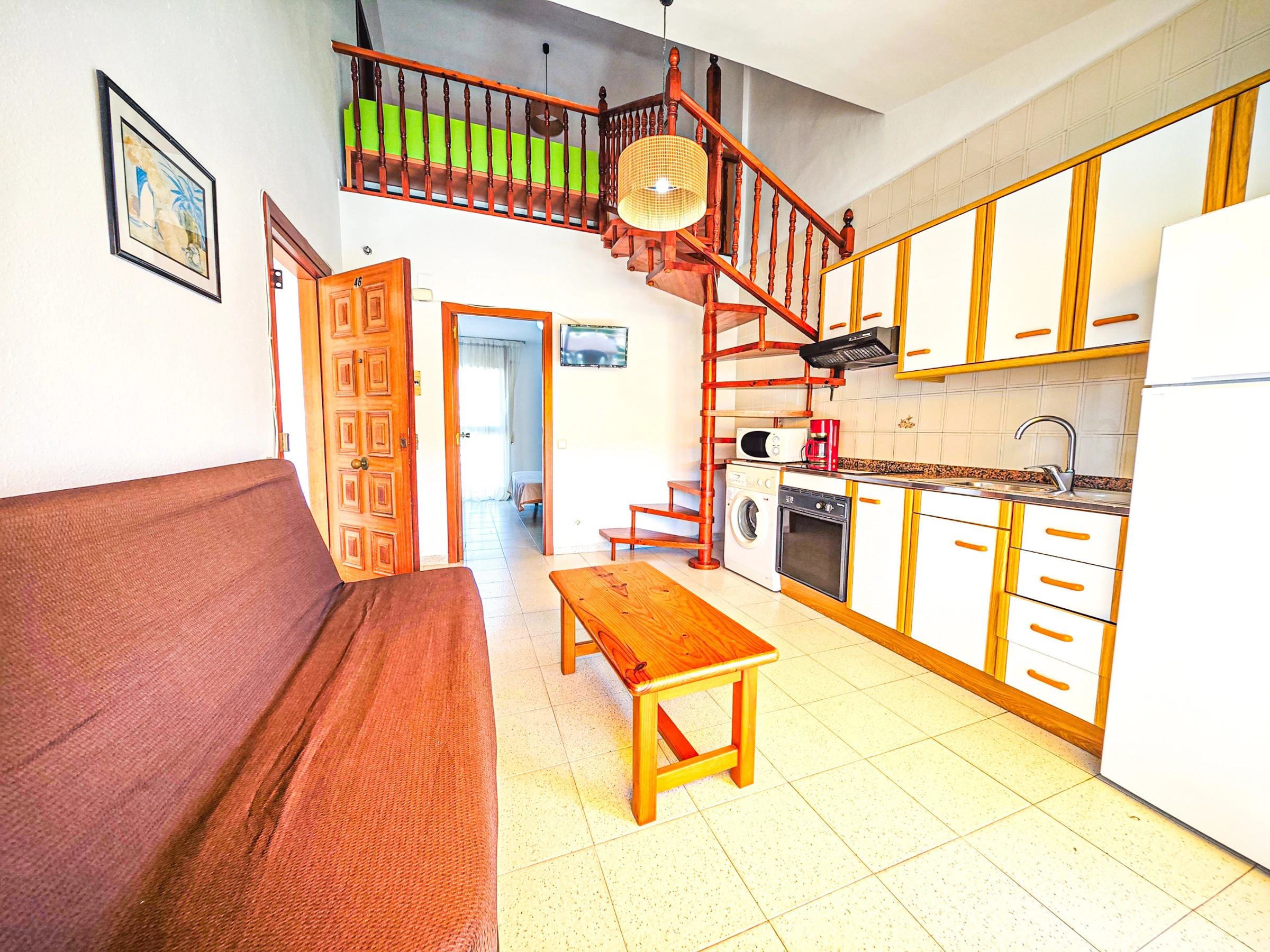 Encantador apartamento familiar en el complejo TRES CARABELAS, perfecto para unas vacaciones relajantes y divertidas cerca de la playa. Este acogedor alojamiento de 41 metros es un dúplex con cocina, baño con bañera y dormitorio en planta baja. Subiendo las escaleras encuentran otro dormitorio y un aseo.
