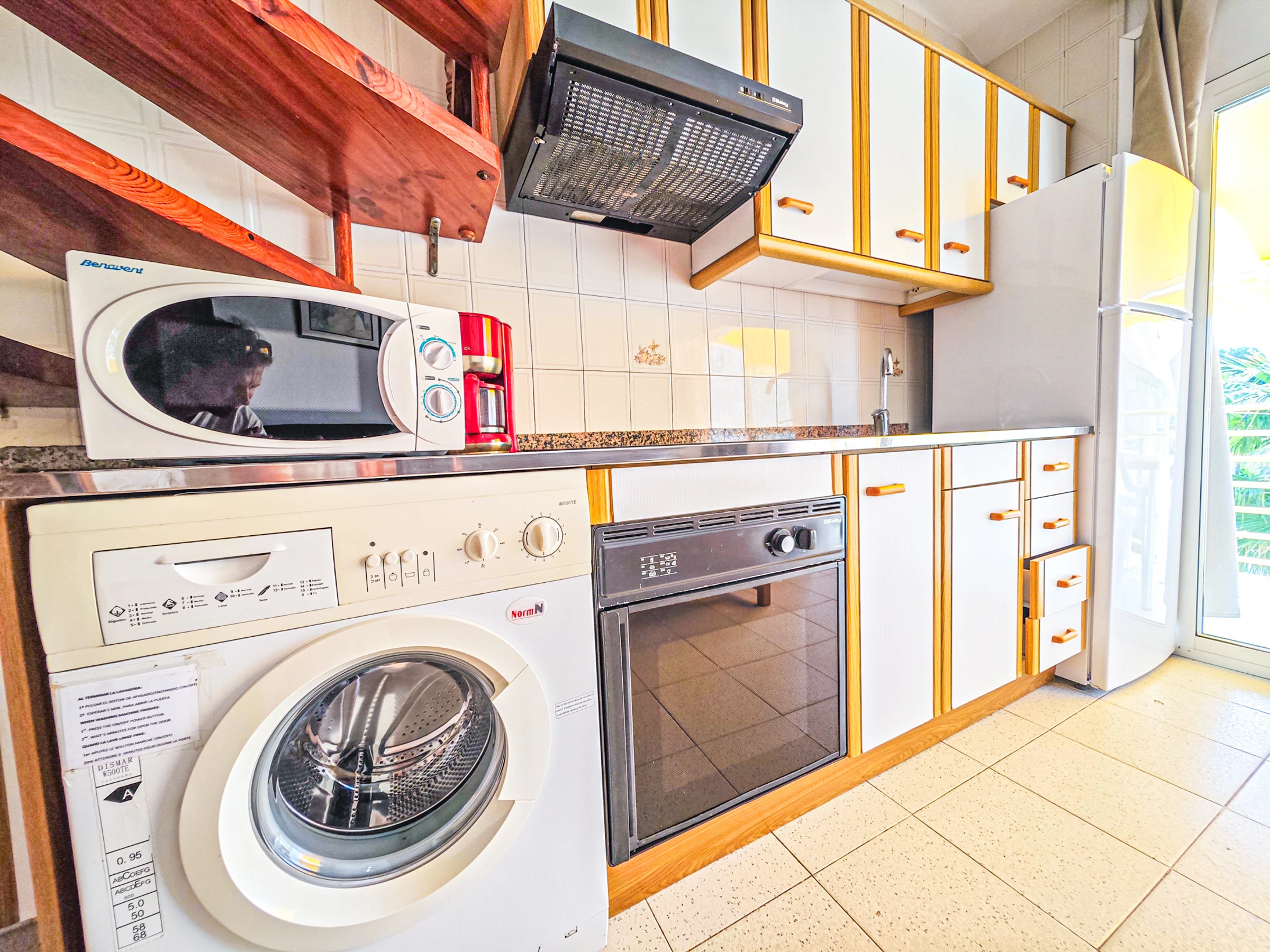 La cocina americana está totalmente equipada, incluyendo nevera, congelador, lavadora, horno, máquina de café y menaje completo.