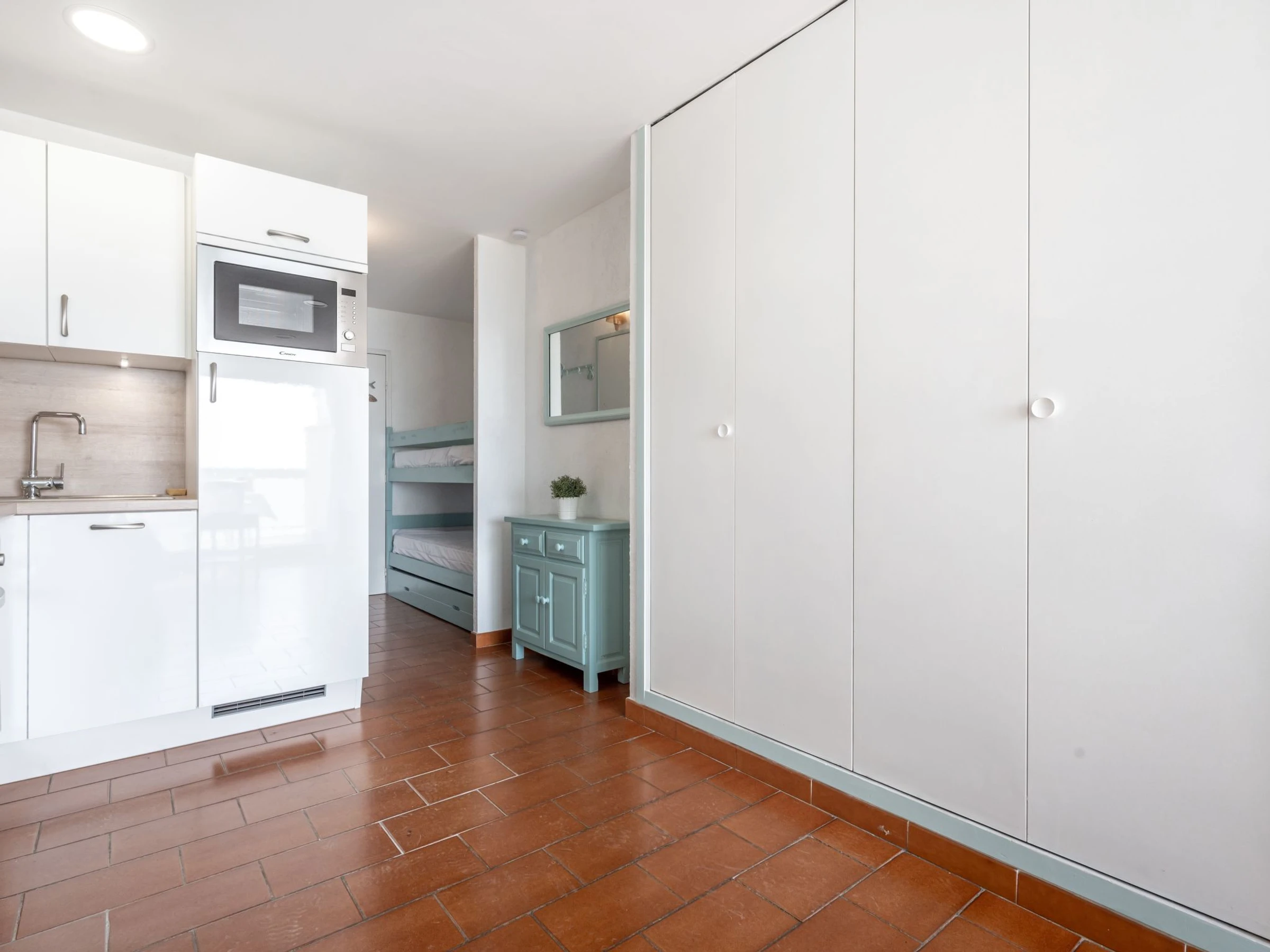 Estudio 25 m2 en el 6° piso. Con mobiliario muy funcional: salón-comedor con 1 sofá-cama doble (140 cm, 190 cm de longitud), TV (pantalla plana), ventilador. Salida a la terraza. Cabina con 1 x 2 literas (90 cm, 190 cm de longitud). Rincón-cocina (horno, 4 placas de vitrocerámica, tostadora, hervidor de agua eléctrico, microondas, cafetera eléctrica). Ducha, WC separado. Calefacción eléctrica. Terraza pequeña 10 m2. Muebles de terraza. Vista bonita al mar. El alojamiento dispone de: plancha, secador de pelo. Internet (Wifi, extra). Plaza de aparcamiento n. 689. A tener en cuenta: detector de humo. En lugar de un dormitorio cerrado, algunos espacios para dormir están situados en una zona diáfana (galería, alcoba, etc.).