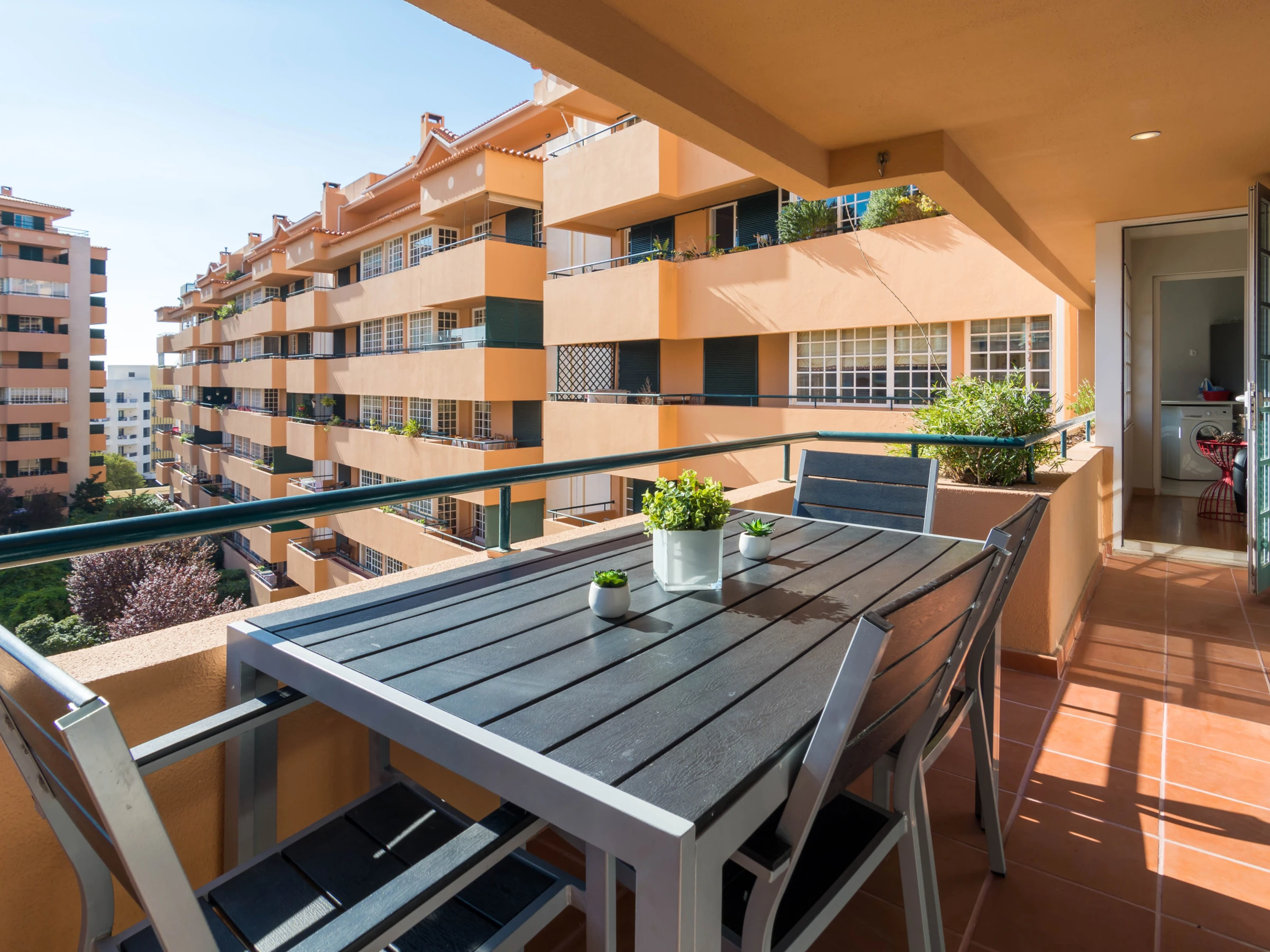 El balcón tiene una gran mesa con 4 sillas y ofrece algo de privacidad. Puede disfrutar de sus comidas o una bebida al atardecer al aire libre.