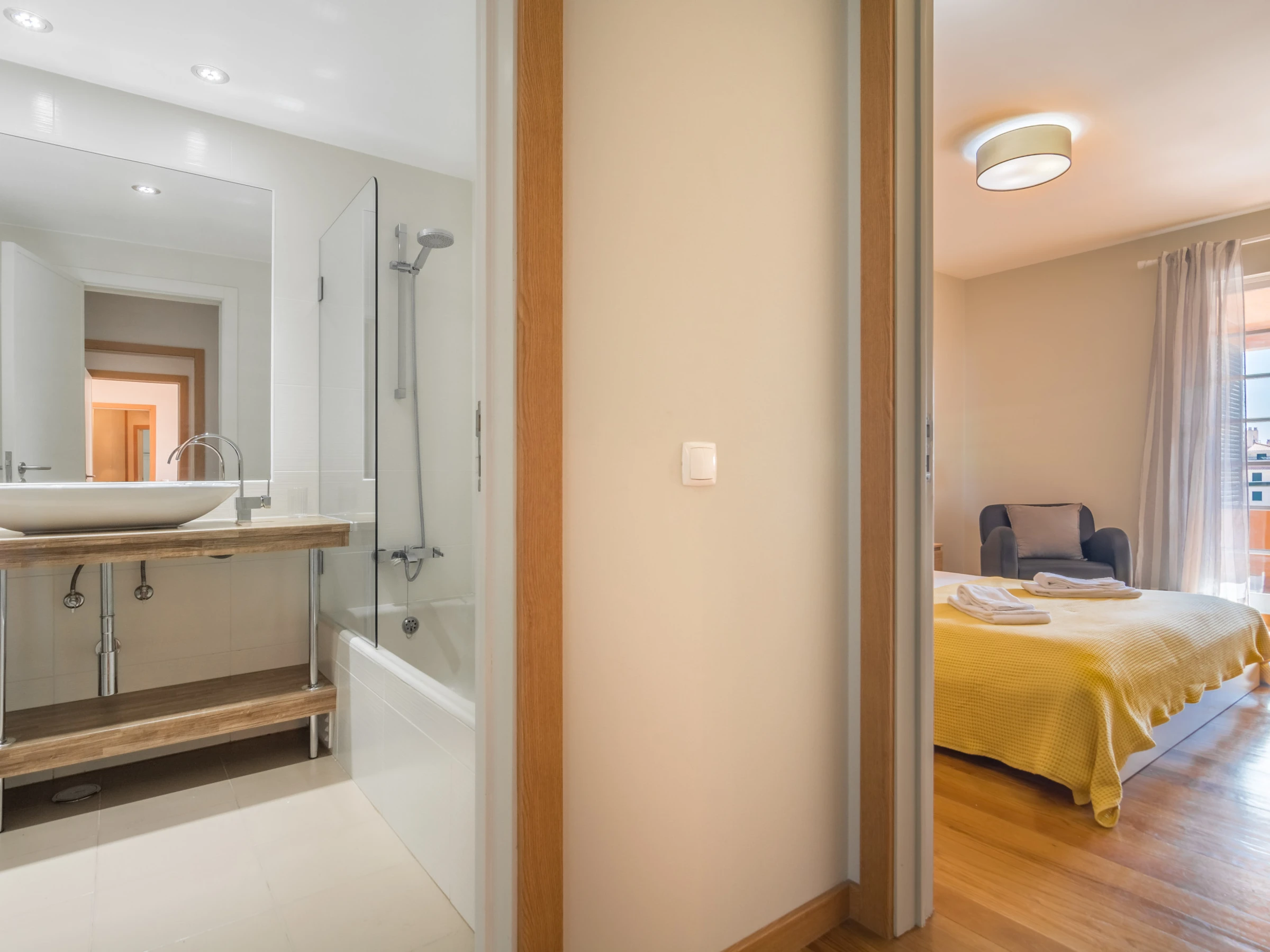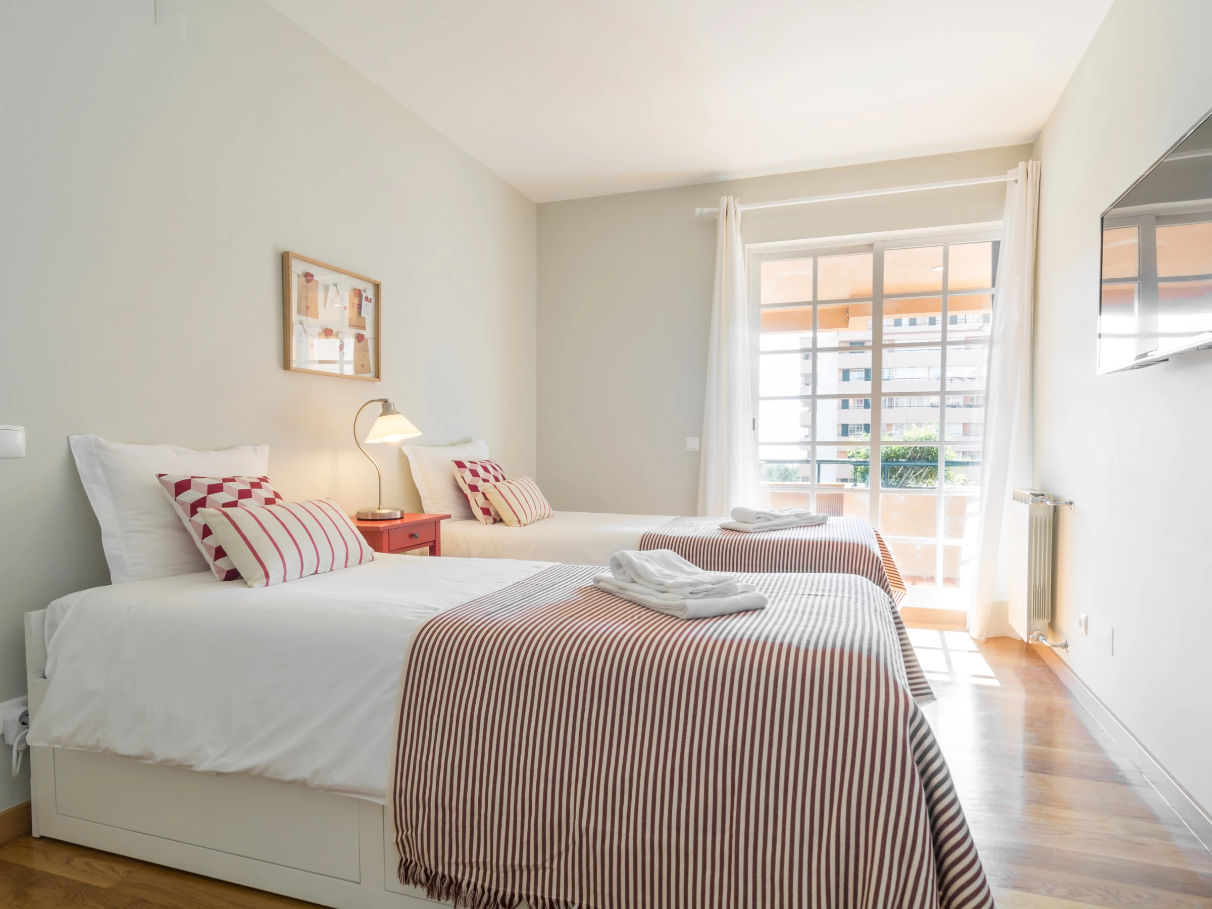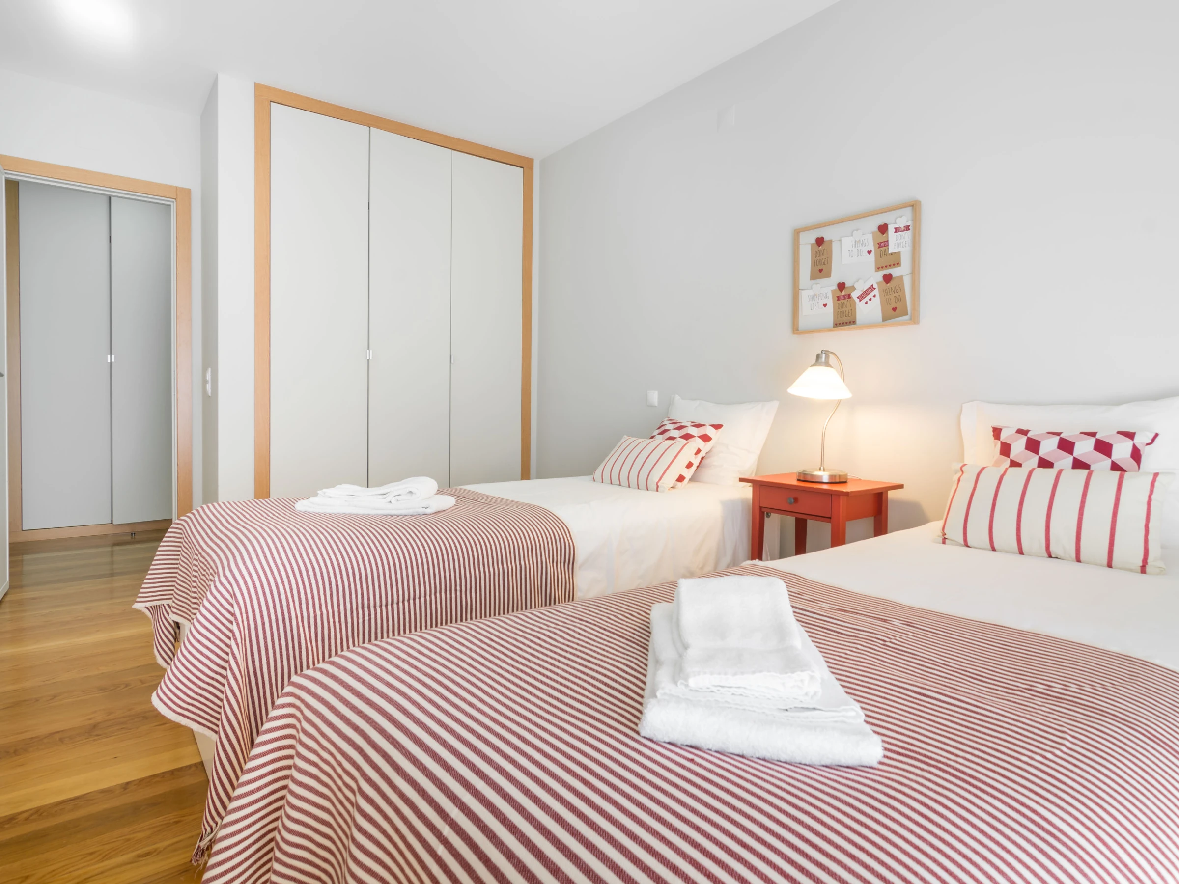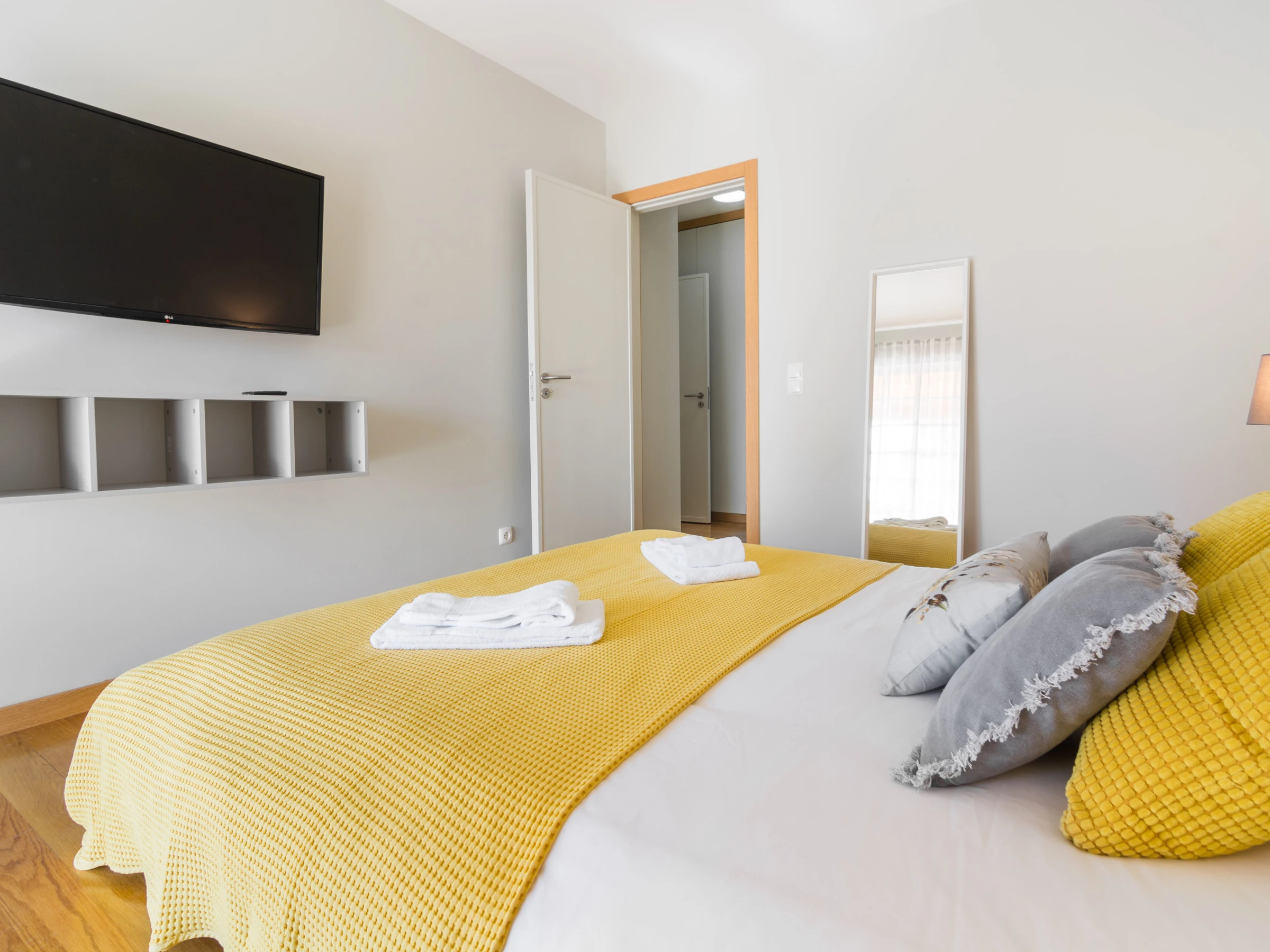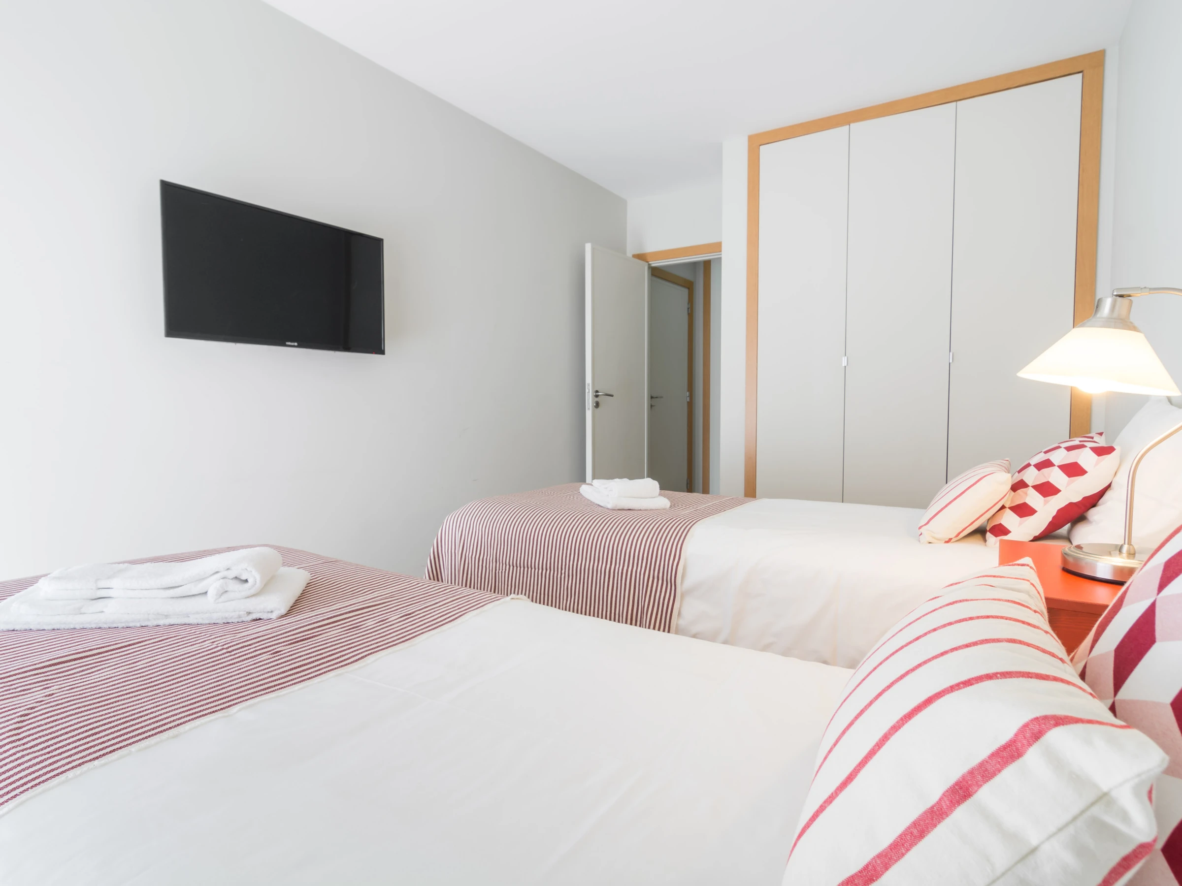 Un dormitorio tiene una cama doble y un baño con bañera y ducha. Tiene un acceso directo al balcón a través de la ventana deslizante. El otro dormitorio tiene dos camas individuales y también accede directamente al balcón. Cada habitación tiene un gran televisor de pantalla plana en la pared. Hay mucho espacio de almacenamiento en varios armarios, tanto en las habitaciones como en las áreas comunes.