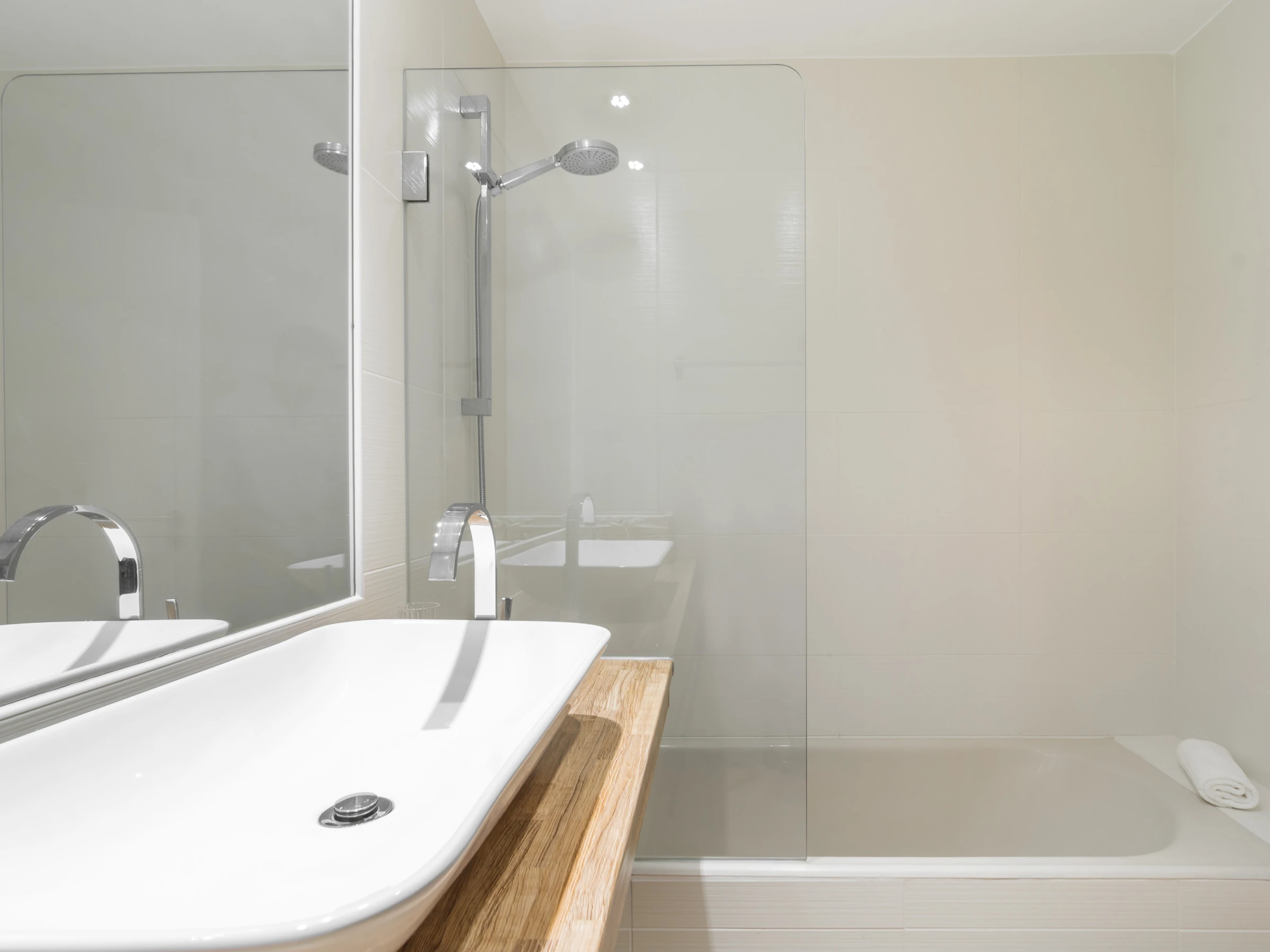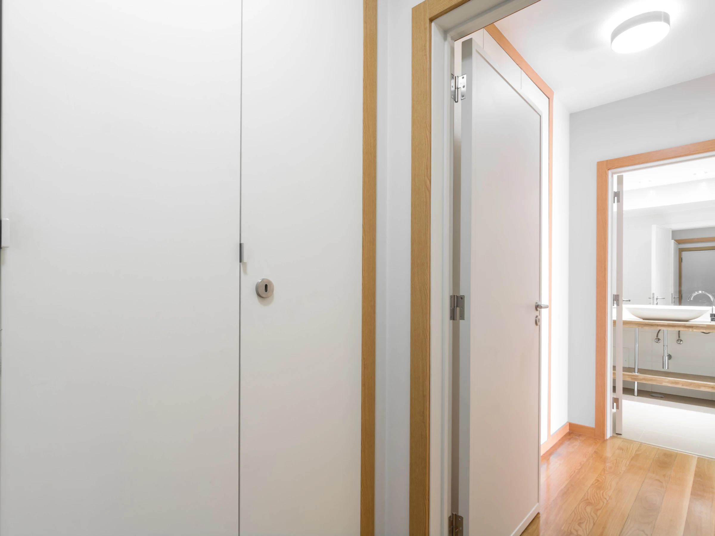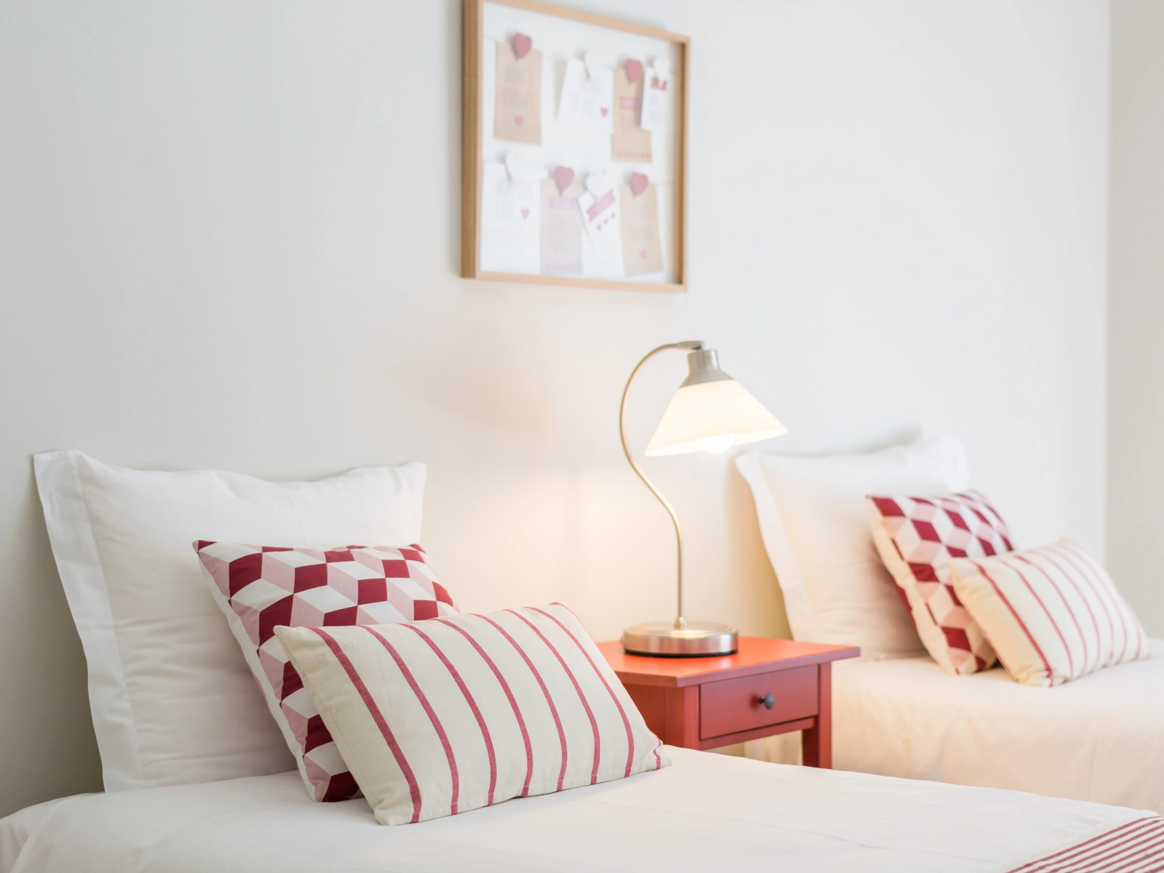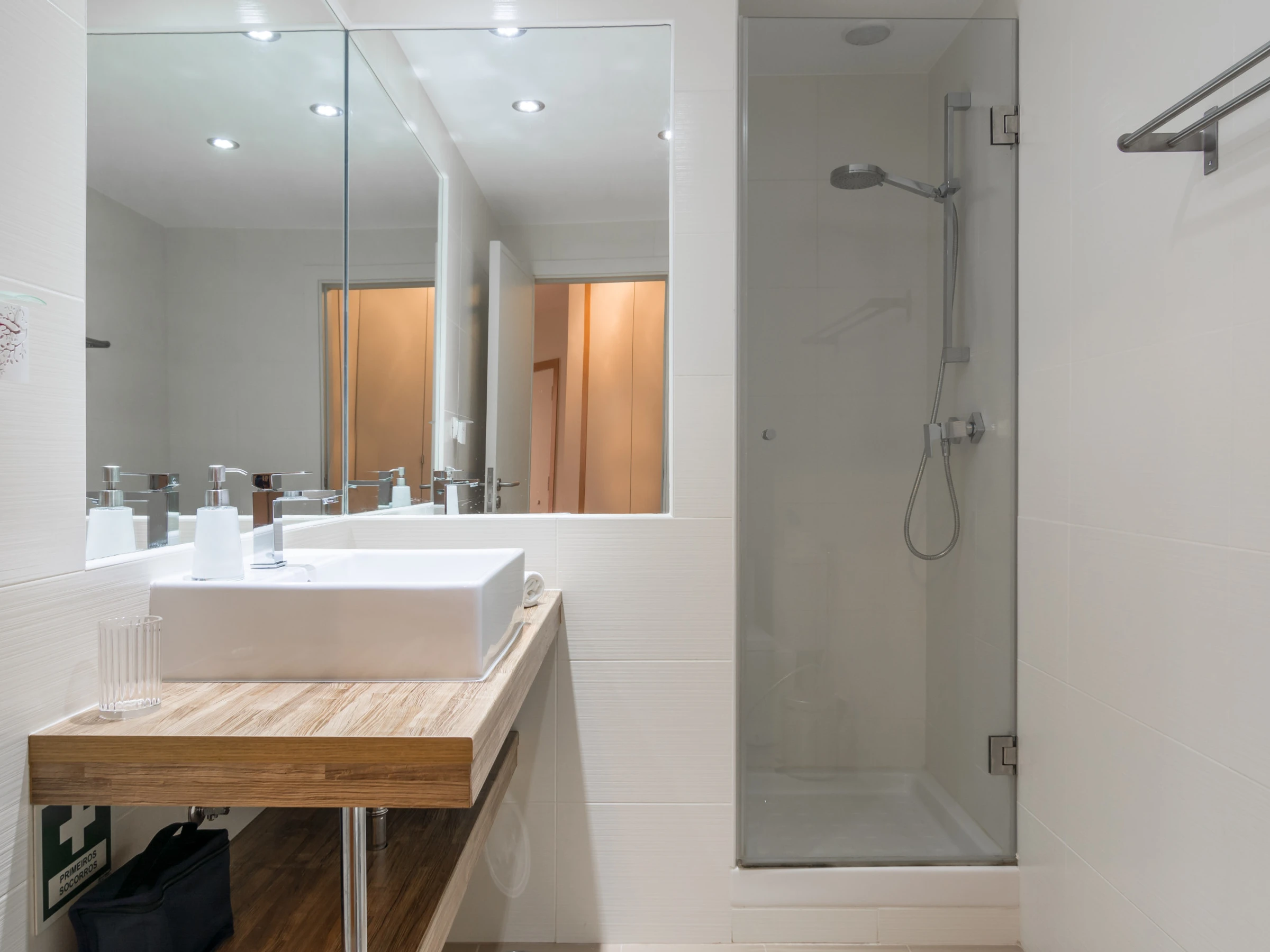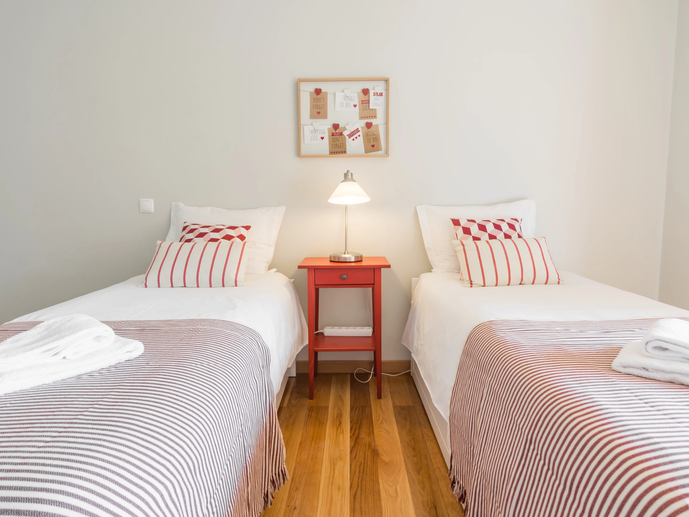 Un dormitorio tiene una cama doble y un baño con bañera y ducha. Tiene un acceso directo al balcón a través de la ventana deslizante. El otro dormitorio tiene dos camas individuales y también accede directamente al balcón. Cada habitación tiene un gran televisor de pantalla plana en la pared. Hay mucho espacio de almacenamiento en varios armarios, tanto en las habitaciones como en las áreas comunes.