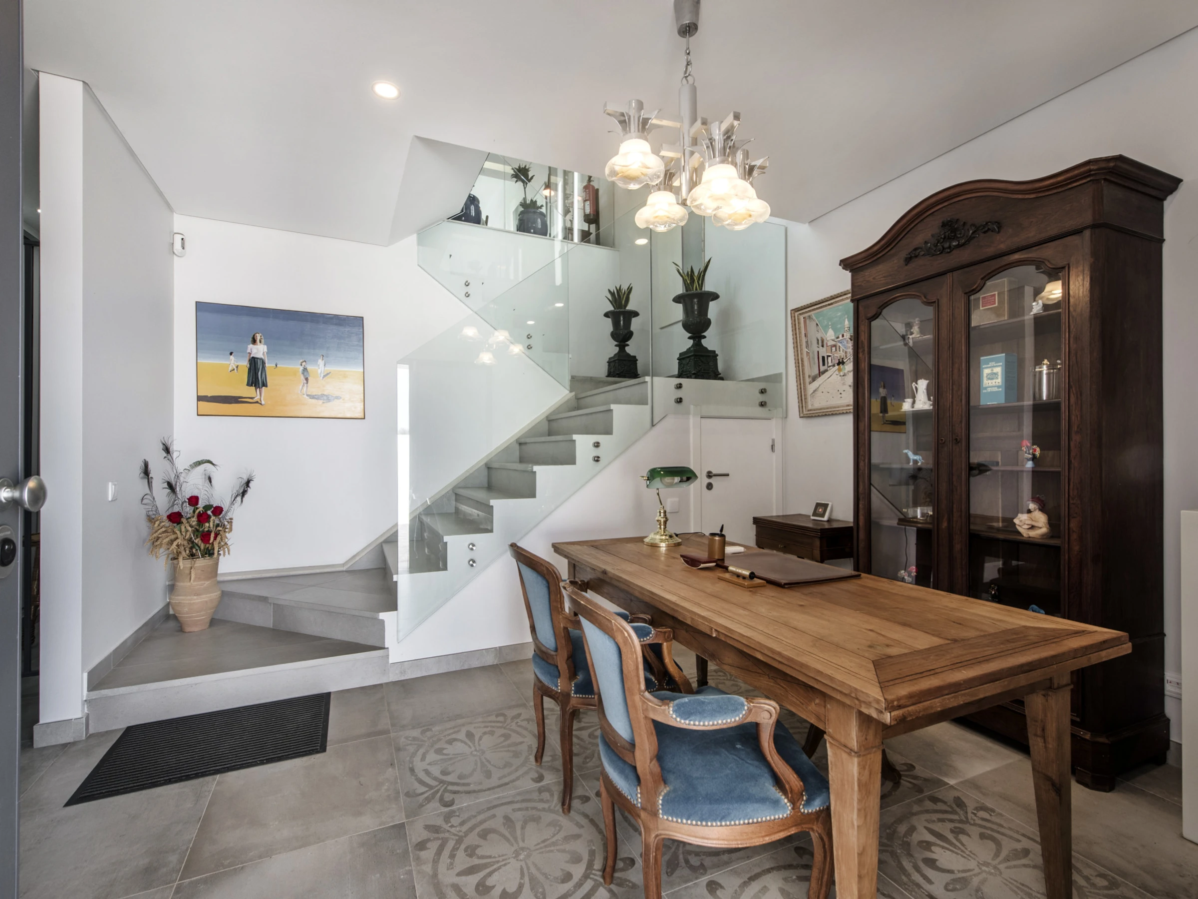Subiendo al primer piso, encontramos la zona social de la casa, compuesta por una cocina en open space totalmente equipada, con una elegante isla central y una claraboya que acentúa la luz natural, contigua a la cocina está una sala amplia y extremadamente luminosa, con conexión directa a un balcón generoso que invita a momentos de convivencia y contemplación.