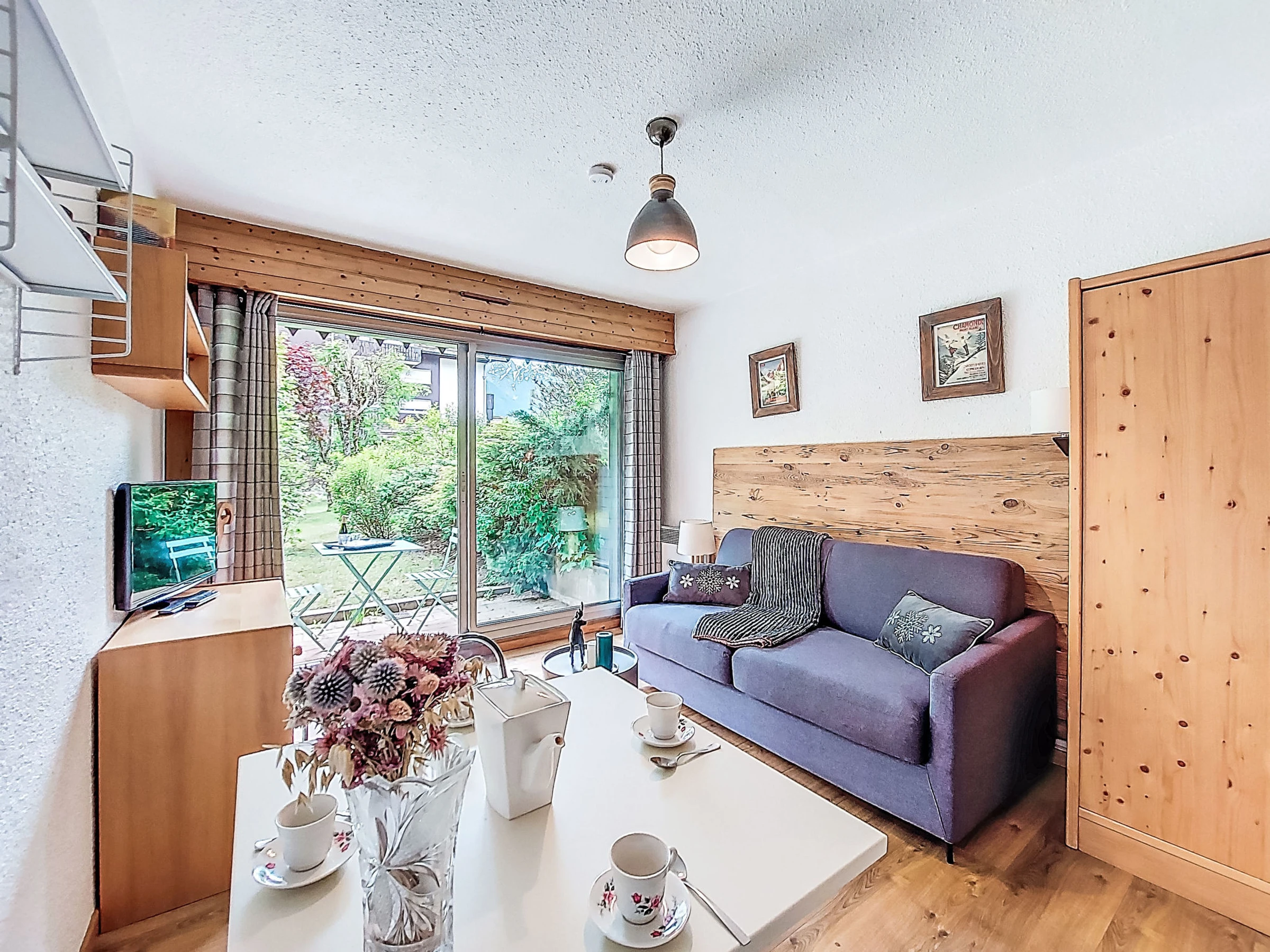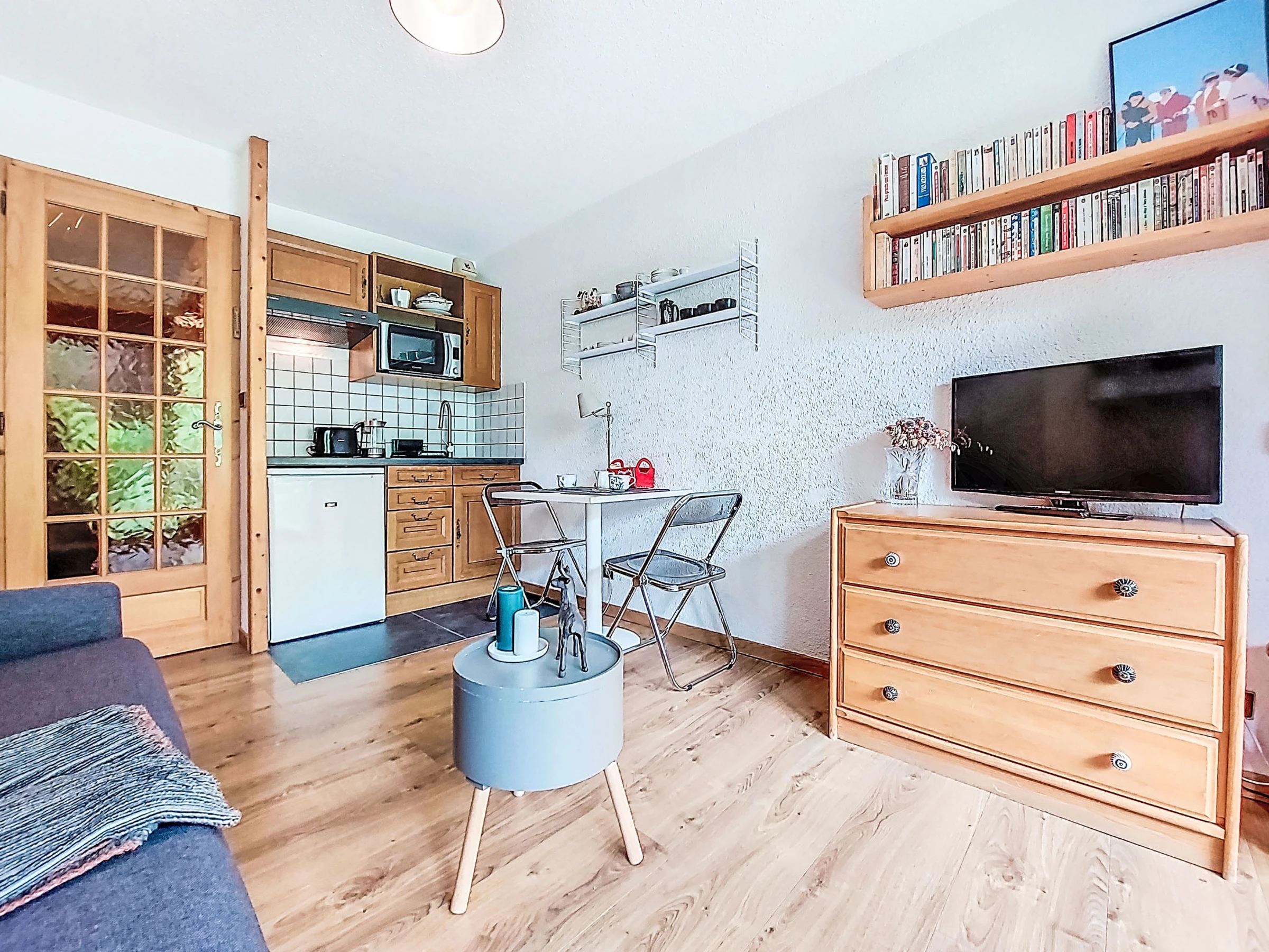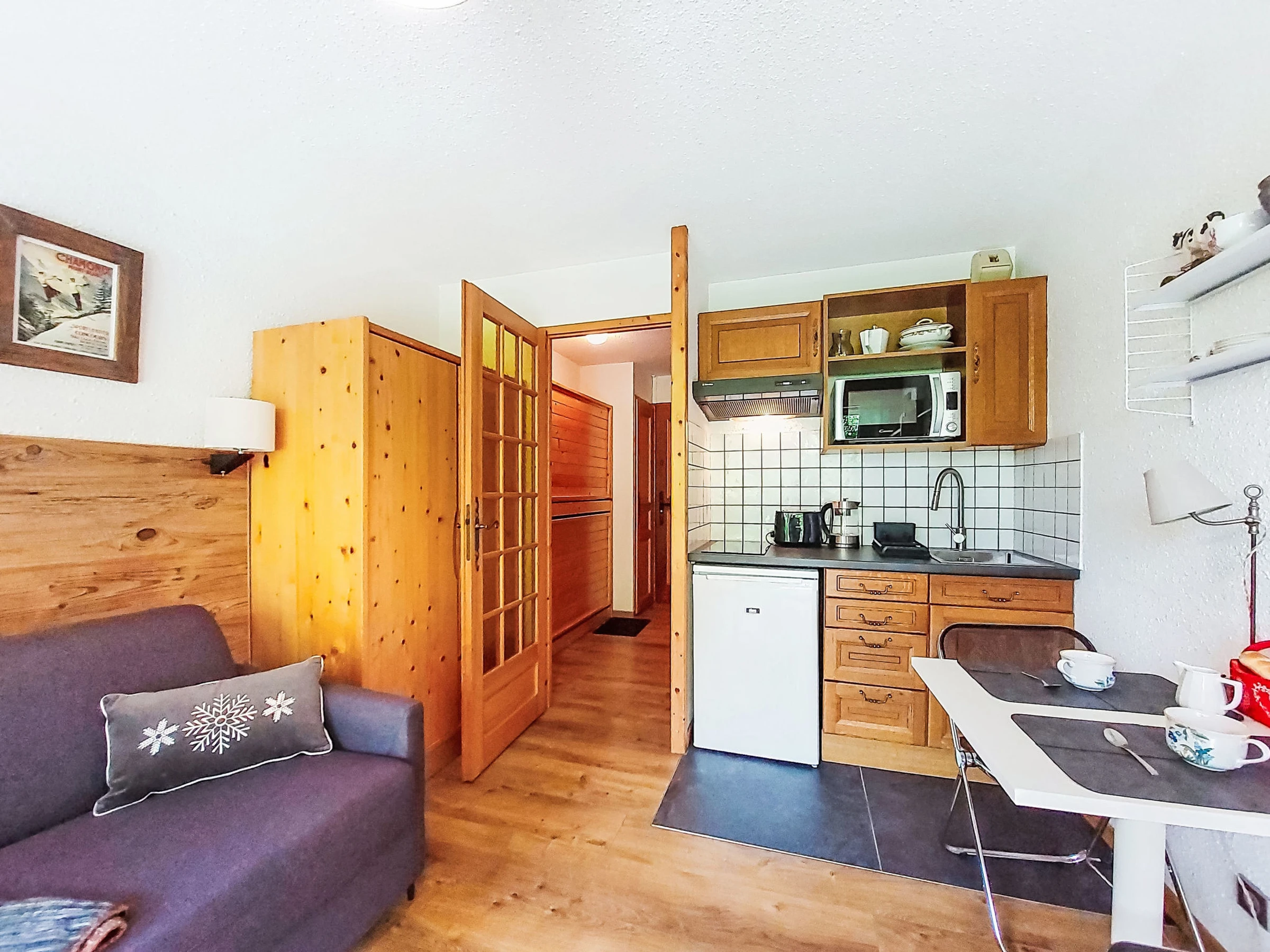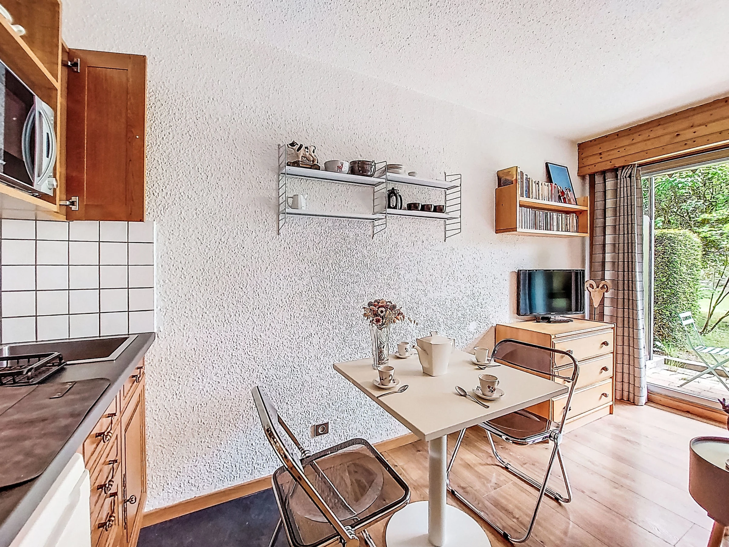Estudio 21 m2, en la planta baja, orientación sur. Salón-comedor con 1 sofá-cama doble (160 cm, 190 cm de longitud), TV. Salida a la terraza, a la terraza-jardín. Entrada con 1 cama abatible (80 cm, 190 cm de longitud). Rincón-cocina (4 fogones, horno, hervidor de agua eléctrico, cafetera eléctrica). Baño/WC. Calefacción eléctrica. Terraza, terraza-jardín. Muebles de terraza. Vista bonita a las montañas. El alojamiento dispone de: lavadora. Internet (Wifi, extra). A tener en cuenta: apartamento para no fumadores, sin aparcamiento. TV solamente FR. Detector de humo. [hidden]