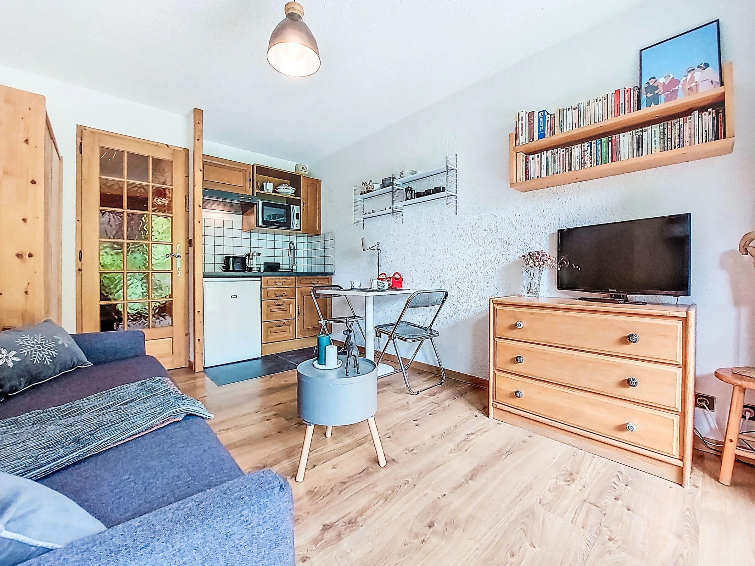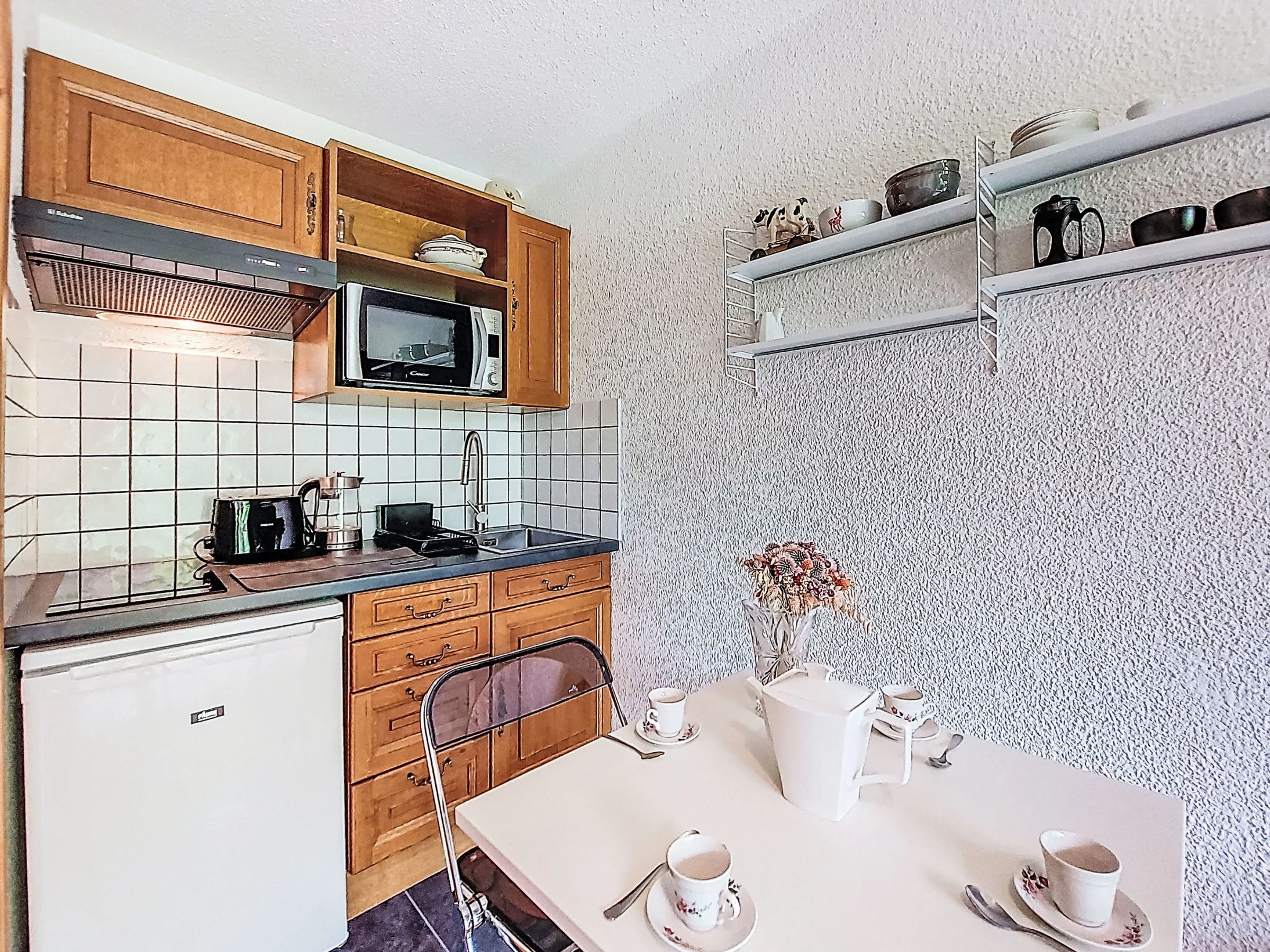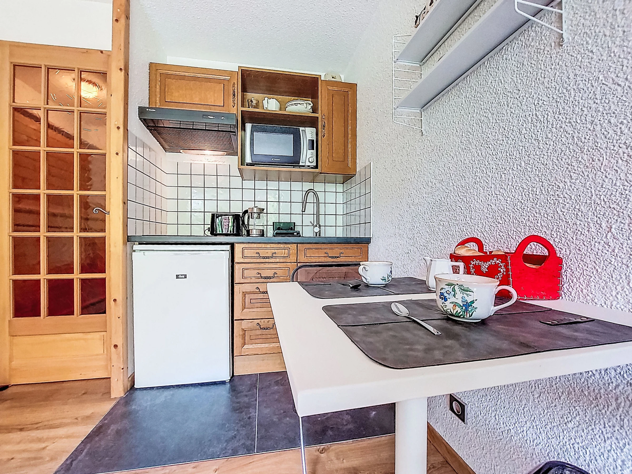 Estudio 21 m2, en la planta baja, orientación sur. Salón-comedor con 1 sofá-cama doble (160 cm, 190 cm de longitud), TV. Salida a la terraza, a la terraza-jardín. Entrada con 1 cama abatible (80 cm, 190 cm de longitud). Rincón-cocina (4 fogones, horno, hervidor de agua eléctrico, cafetera eléctrica). Baño/WC. Calefacción eléctrica. Terraza, terraza-jardín. Muebles de terraza. Vista bonita a las montañas. El alojamiento dispone de: lavadora. Internet (Wifi, extra). A tener en cuenta: apartamento para no fumadores, sin aparcamiento. TV solamente FR. Detector de humo. [hidden]